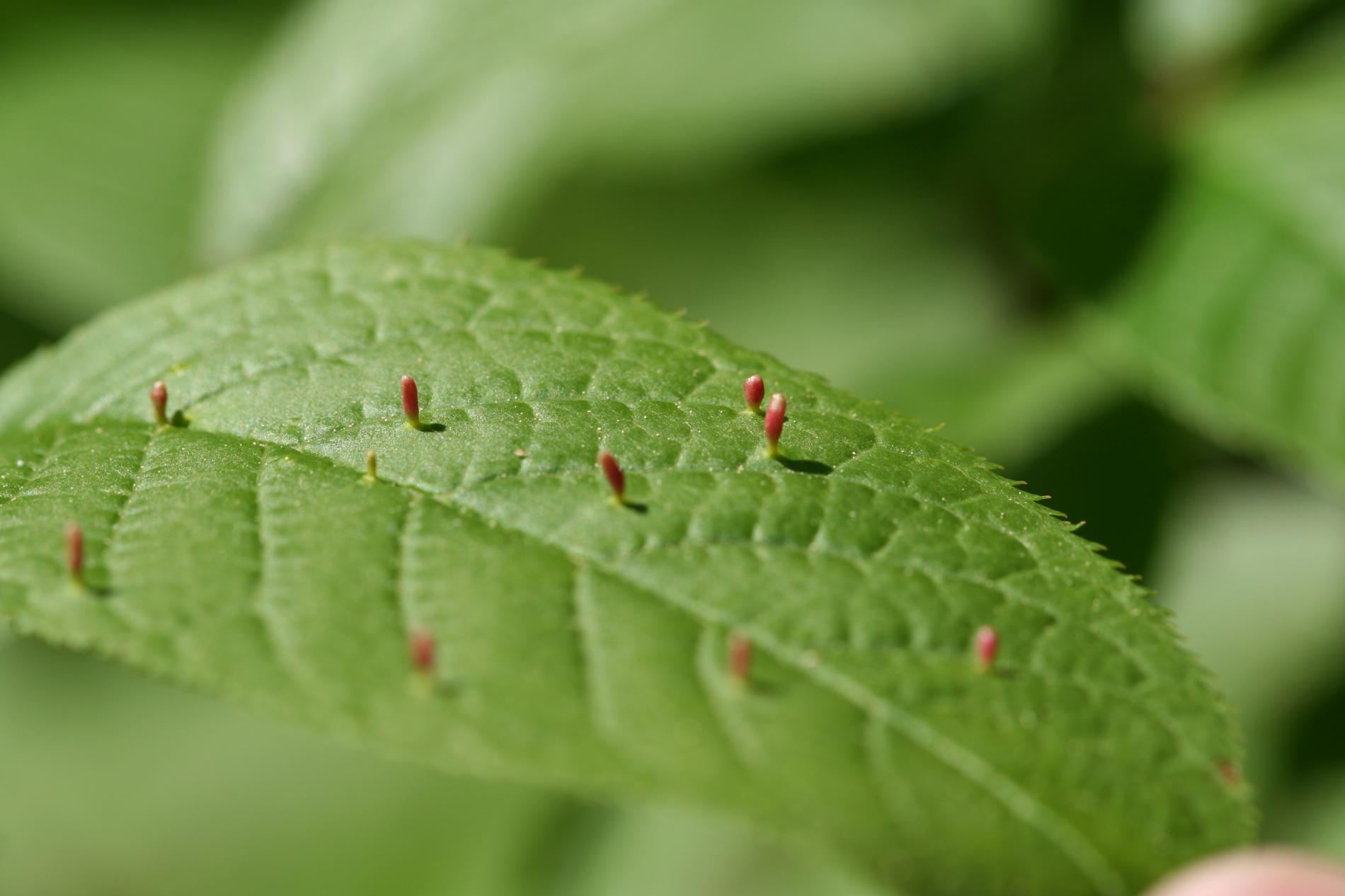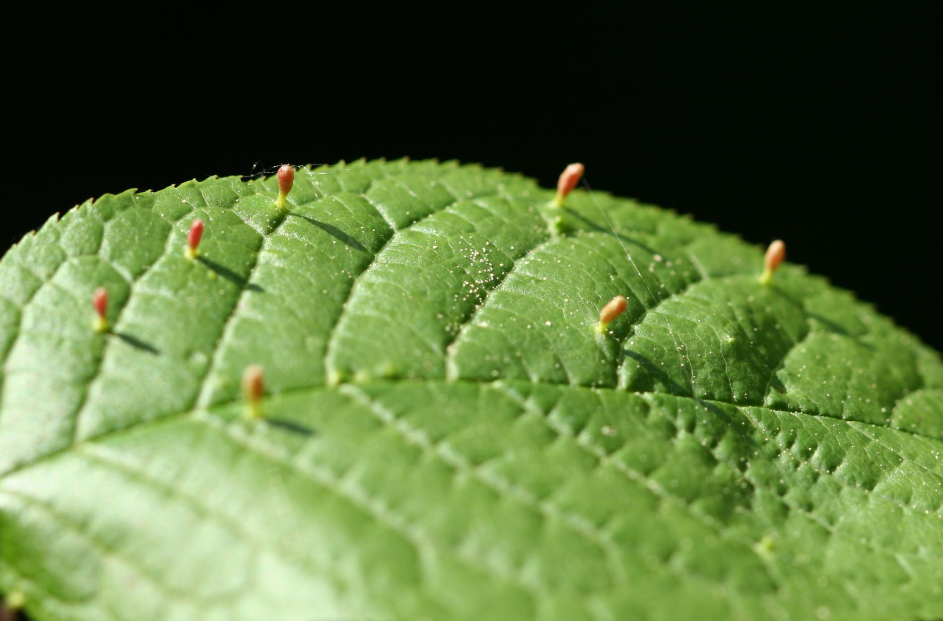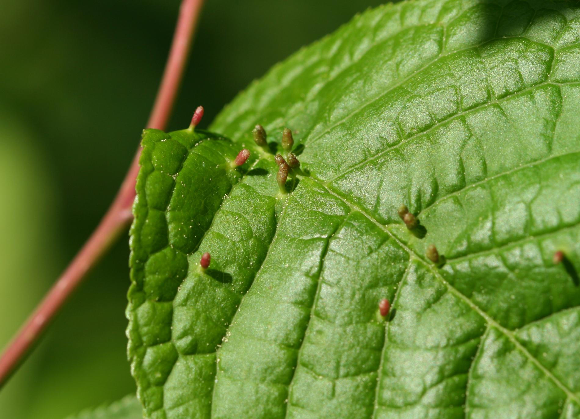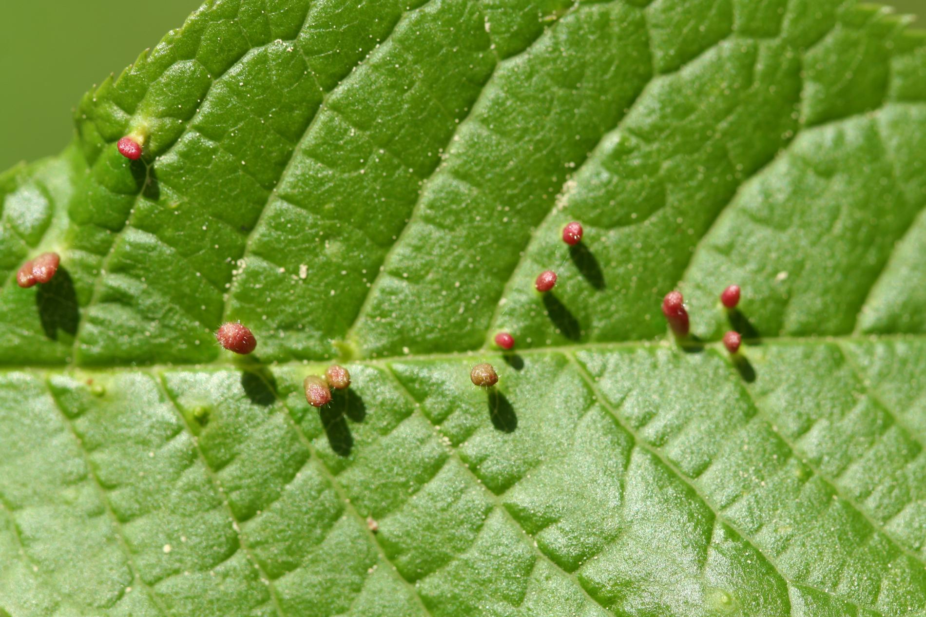 Drobné hálky na vrchnej strane listu. Môžu byť guľovité, elipsovité až pretiahnuto elipsovité, zelenej, žltej, ružovej alebo červenej farby.