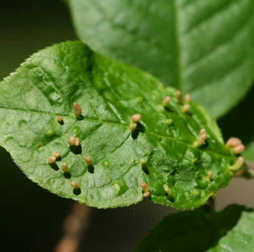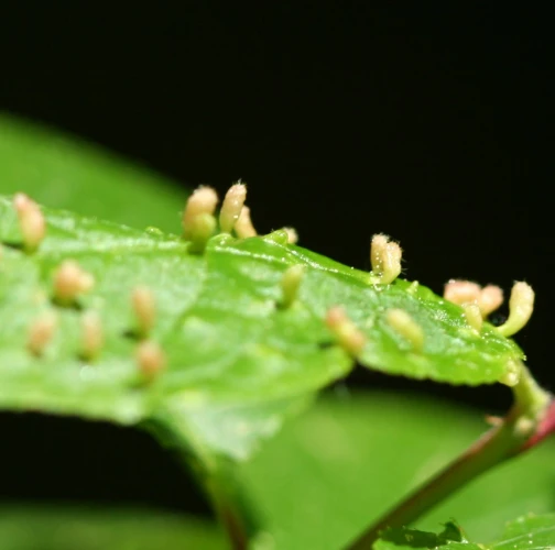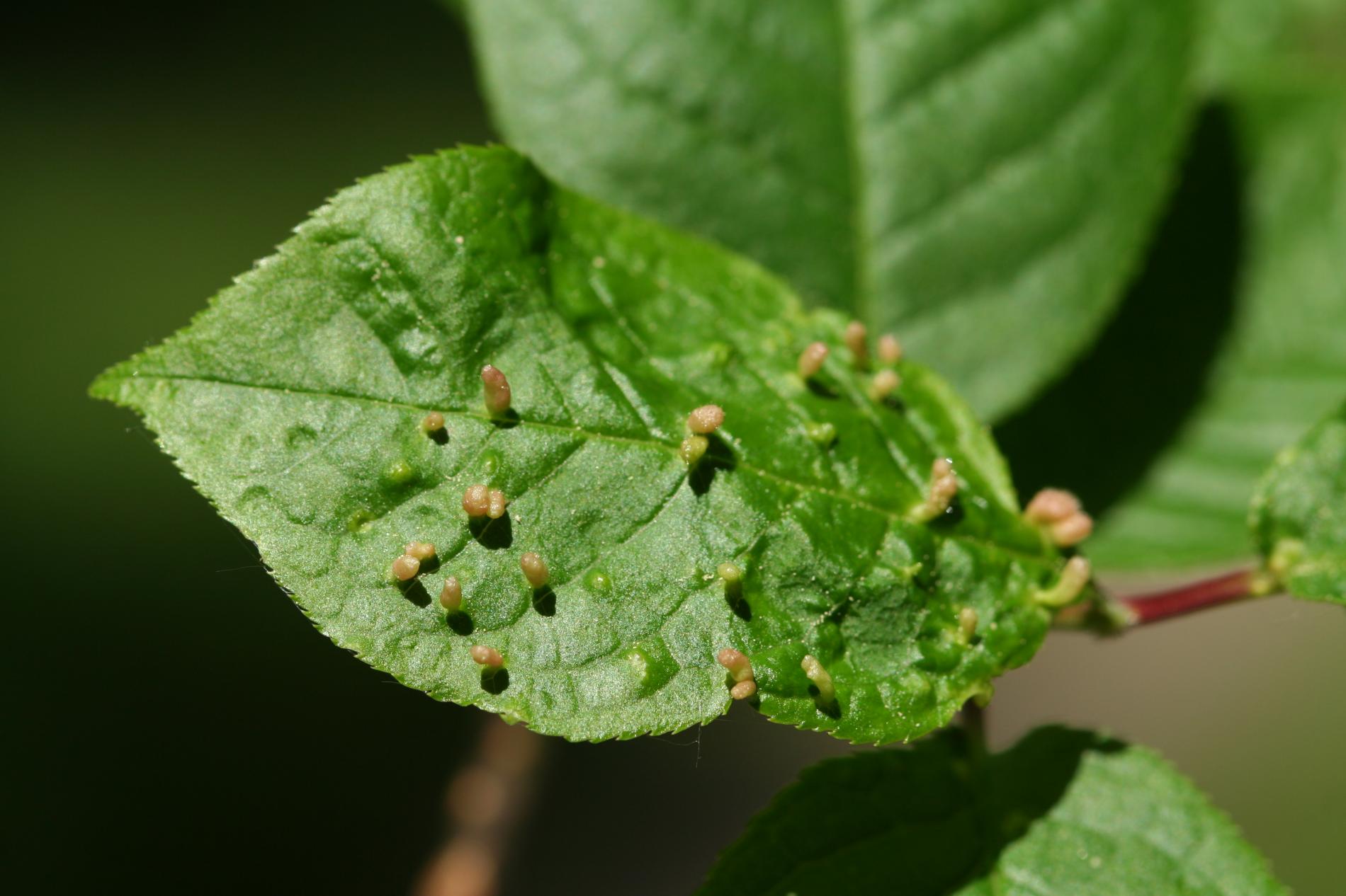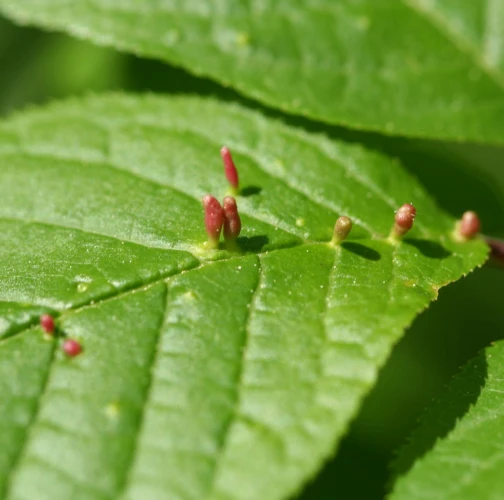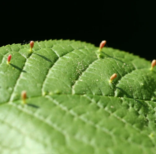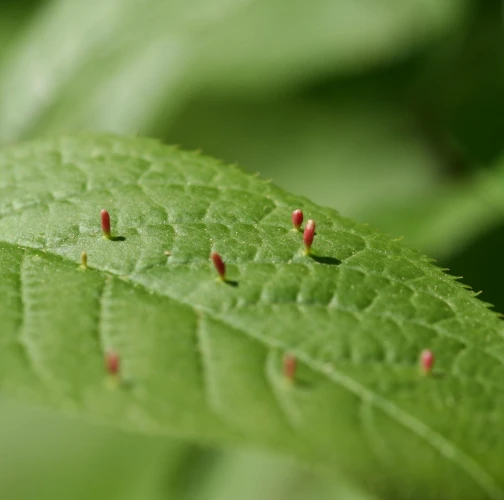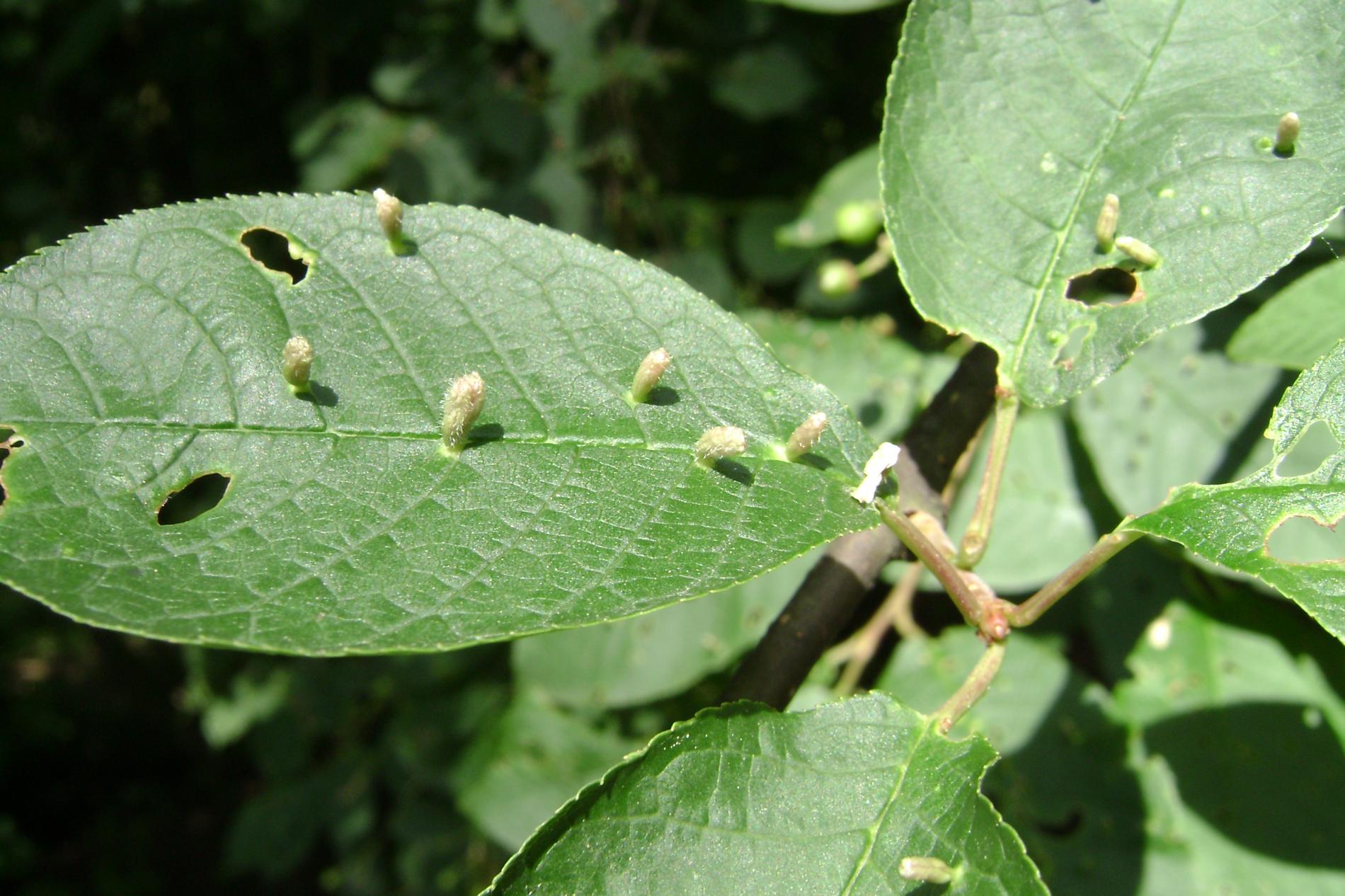 Drobné hálky na vrchnej strane listu. Môžu byť guľovité, elipsovité až pretiahnuto elipsovité, zelenej, žltej, ružovej alebo červenej farby.