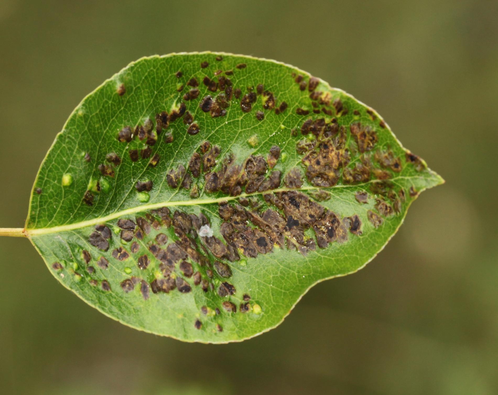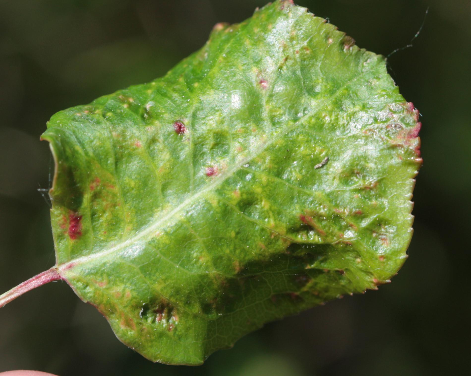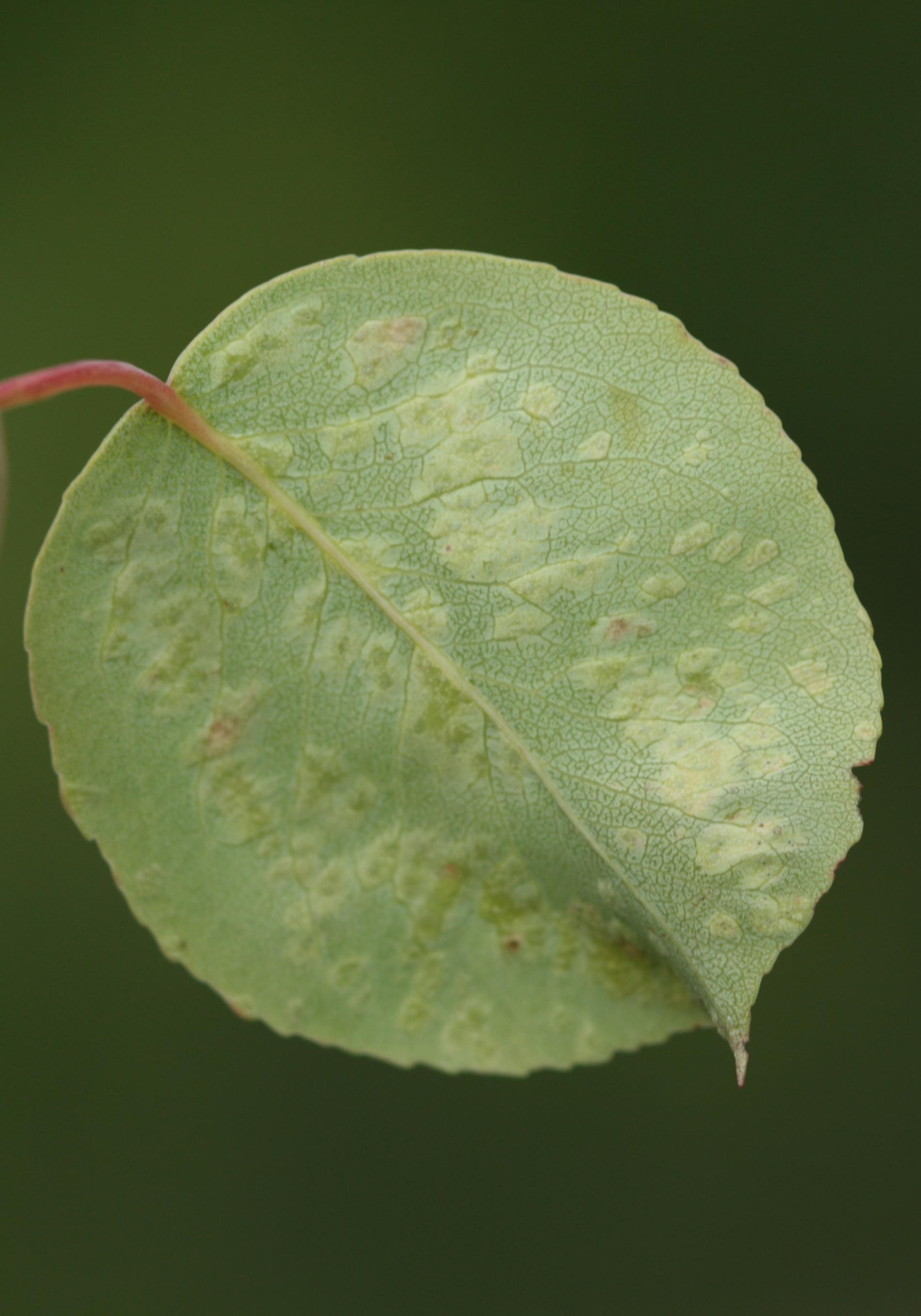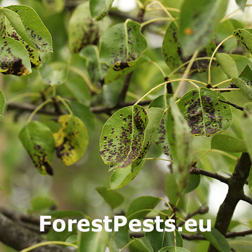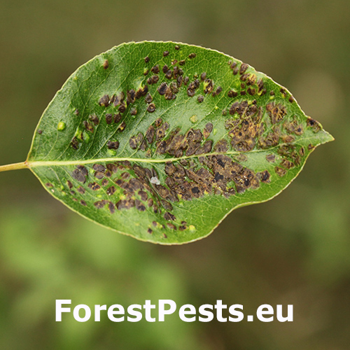 Deformácie listov, zhrubnutie listov, svetlé škvrny, neskôr v lete čierne chrasty na listoch.