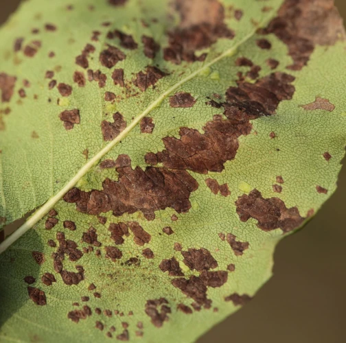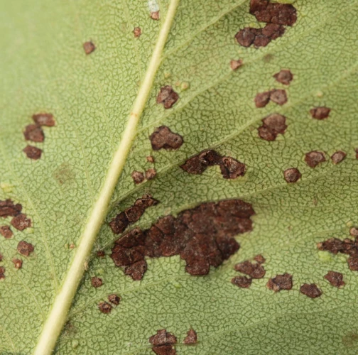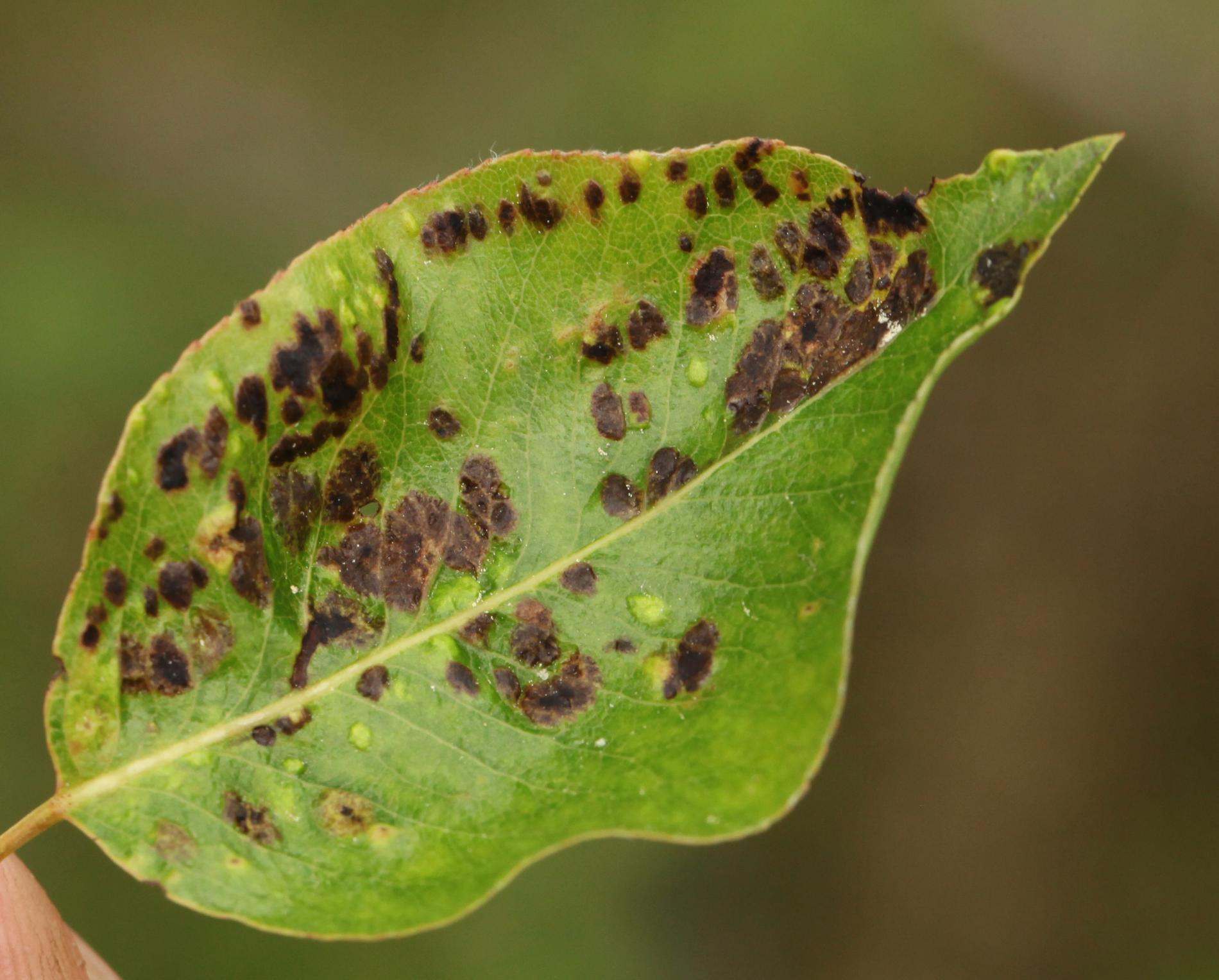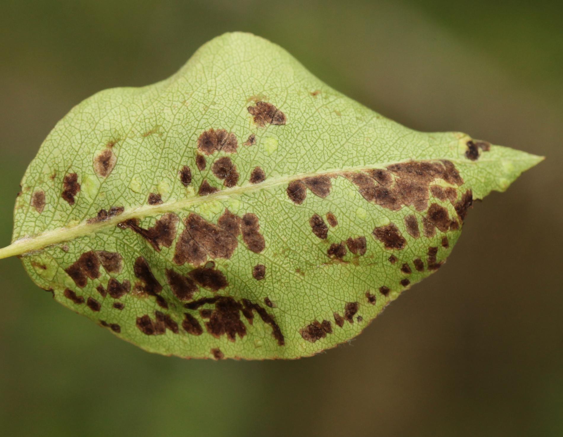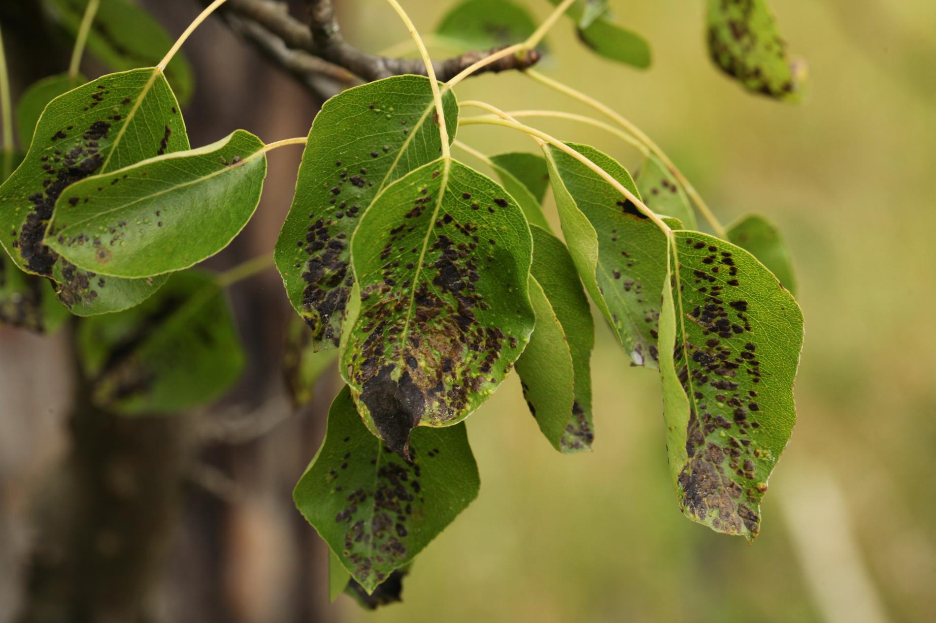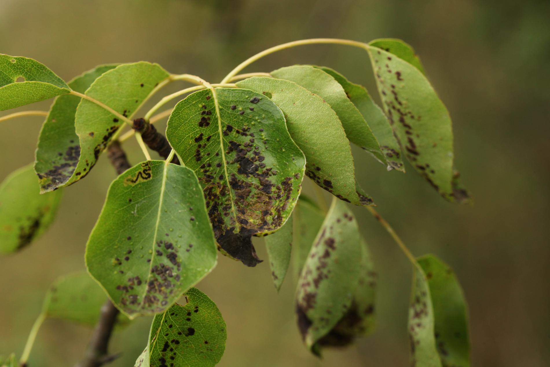 Deformácie listov, zhrubnutie listov, svetlé škvrny, neskôr v lete čierne chrasty na listoch.