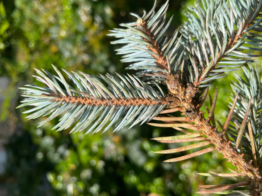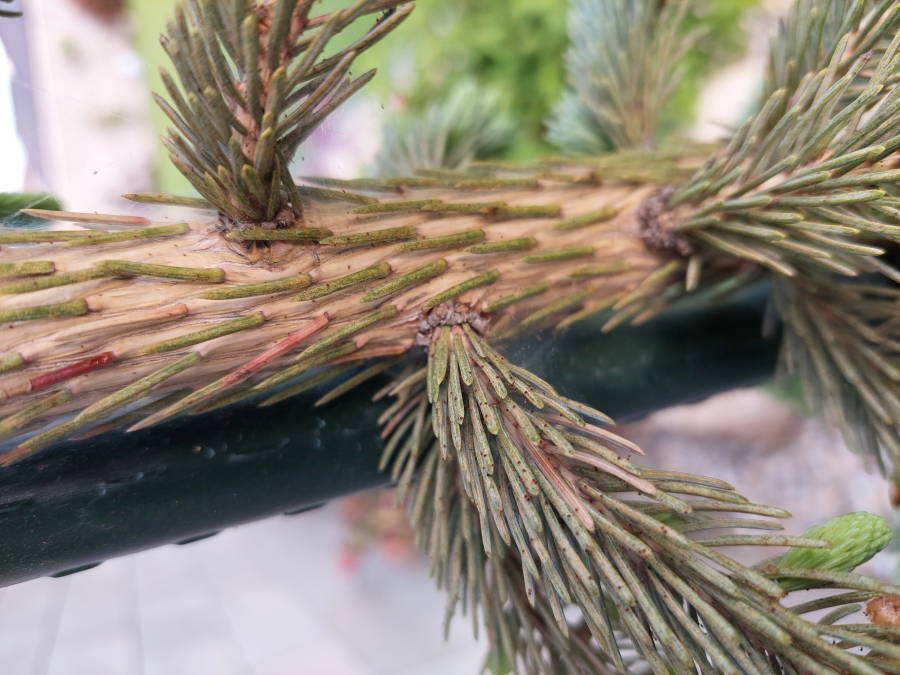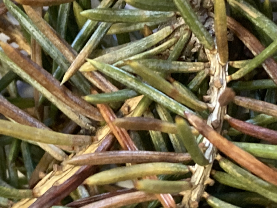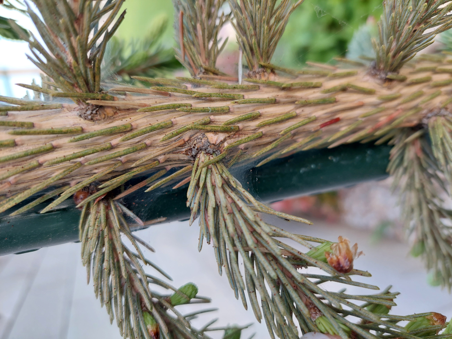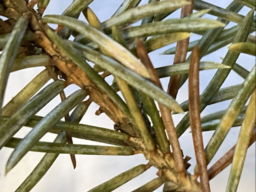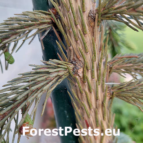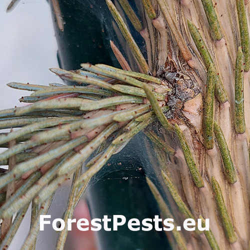 Žlté alebo hnedé ihlice. Pavučinové vlákna medzi ihlicami. Stopy po cicaní. Drobné roztoče na ihliciach.