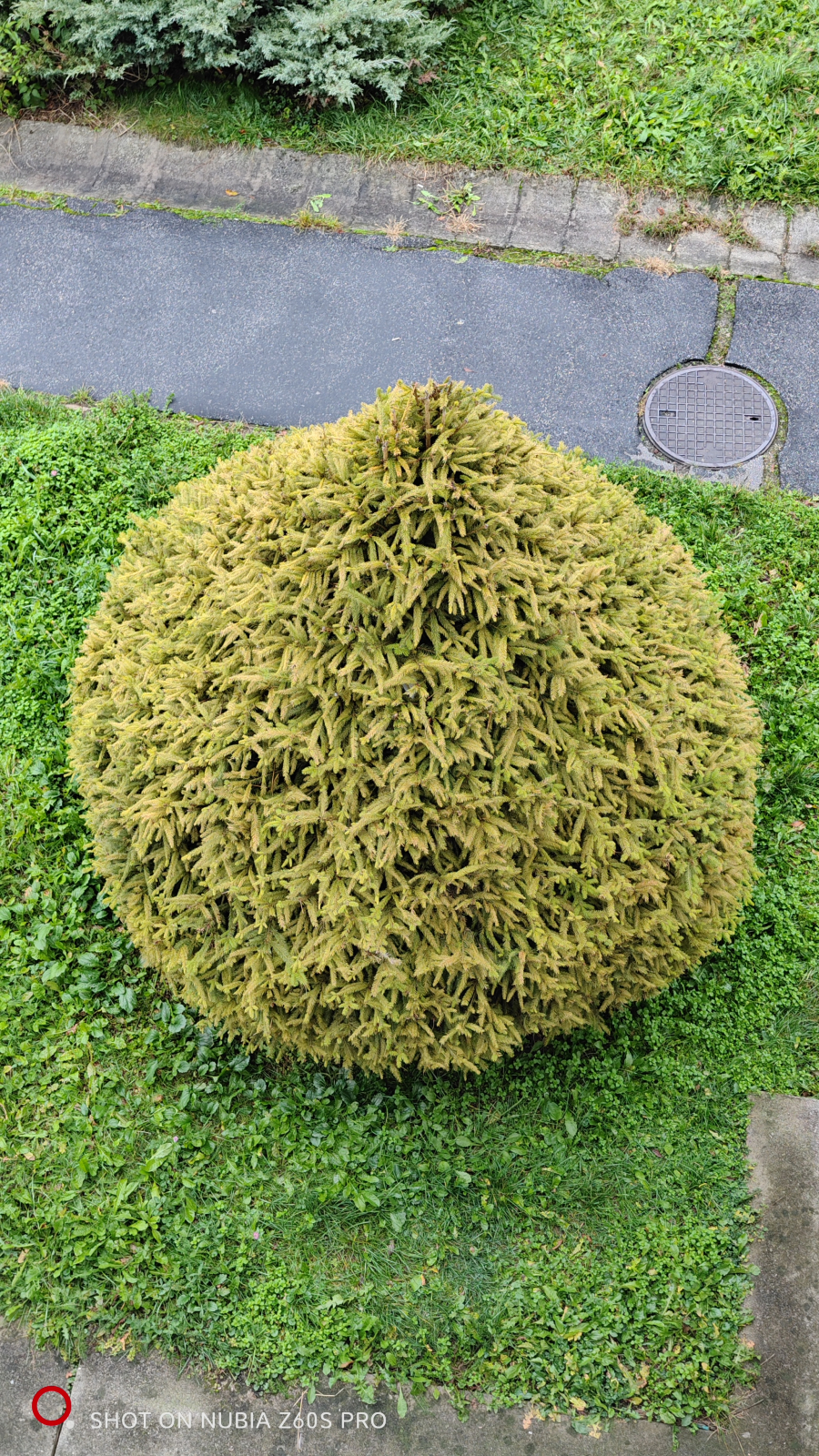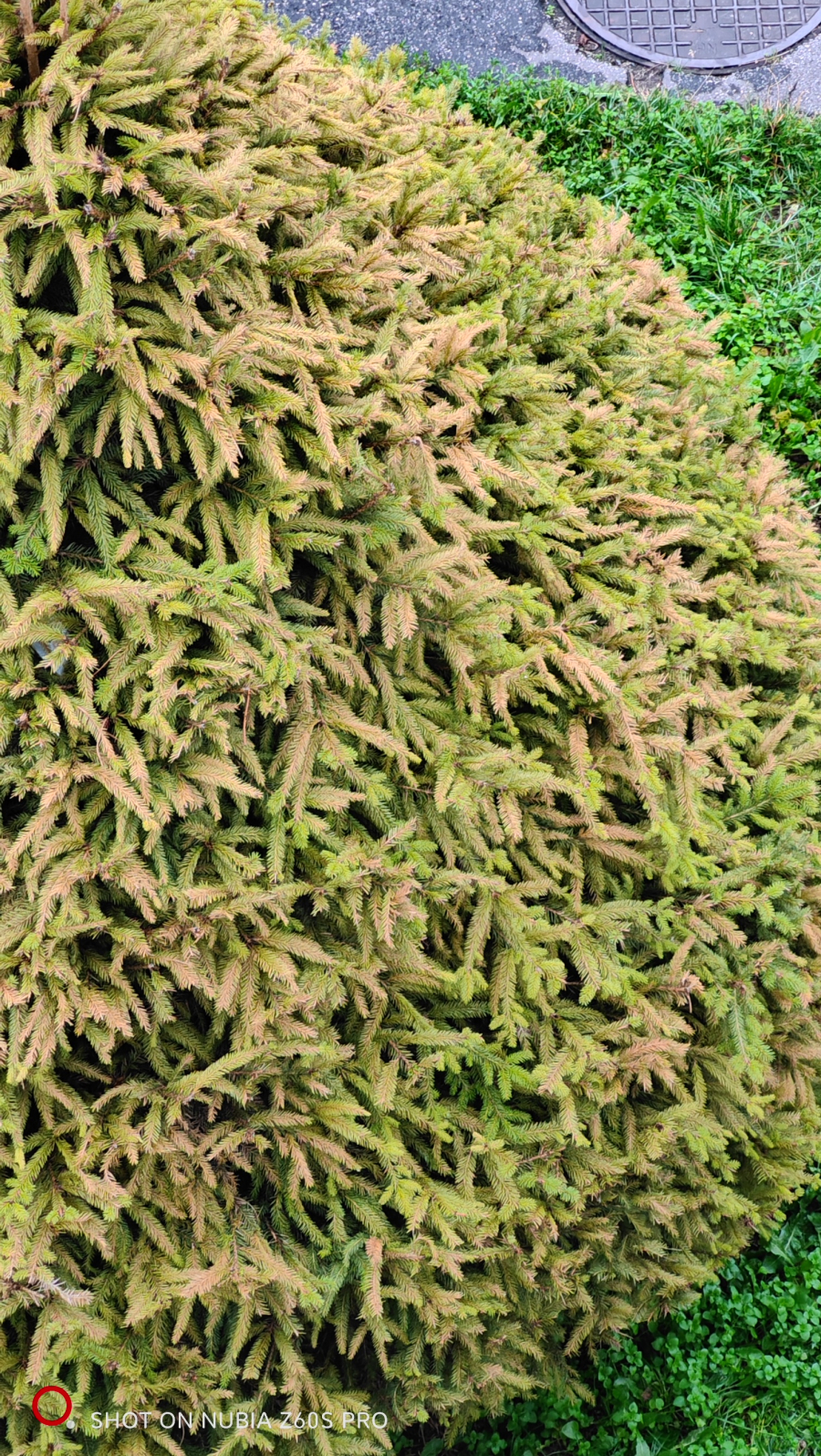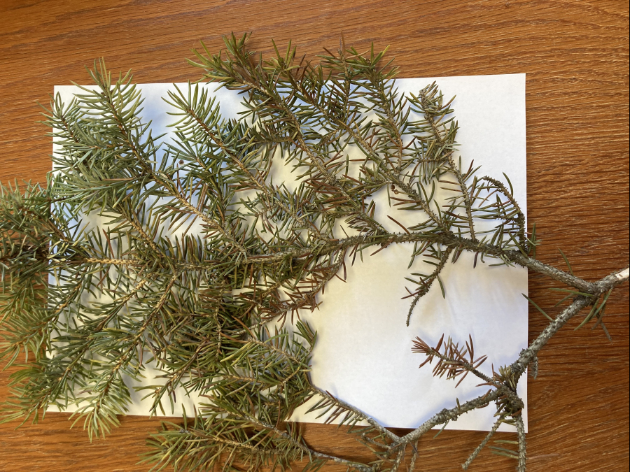 Žlté alebo hnedé ihlice. Pavučinové vlákna medzi ihlicami. Stopy po cicaní. Drobné roztoče na ihliciach.