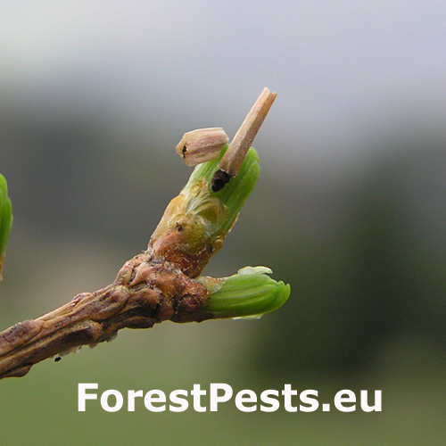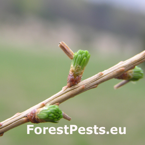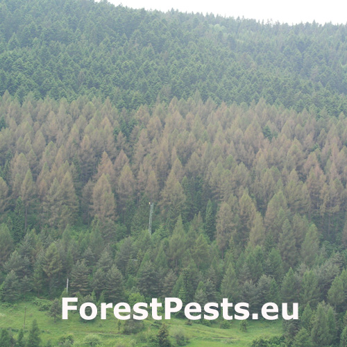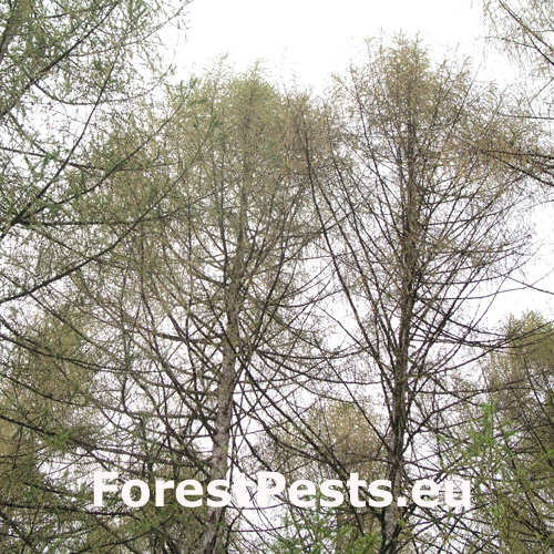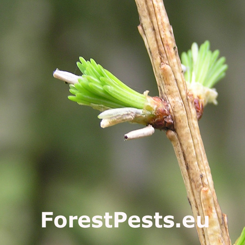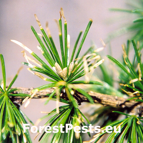Poškodené smrekovce strácajú zelenú farbu ihličia, chradnú a postupne hynú. Na vetvičkách sú prítomné niekoľko milimetrov veľké vaky v ktorých žijú húsenice.
