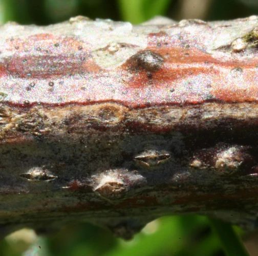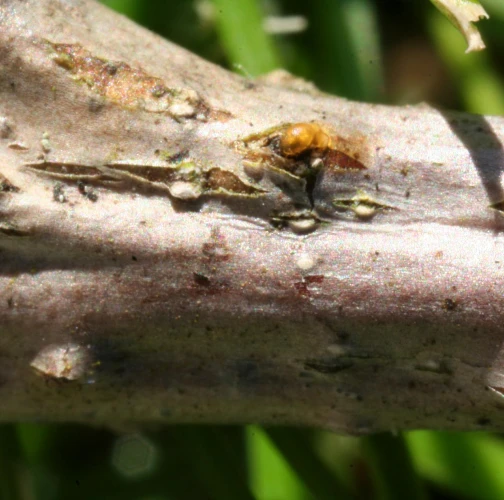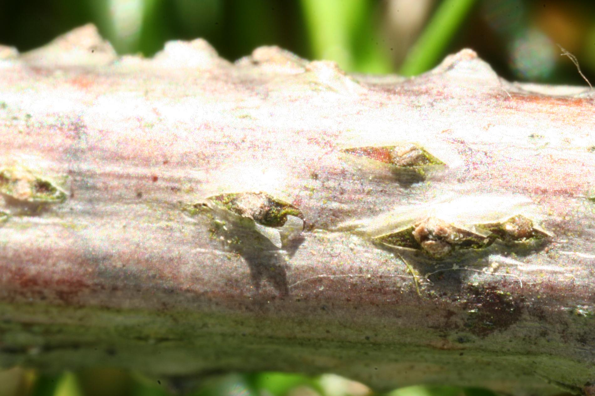 Príznaky infekcie sa najprv prejavujú žltnutím listov na celej korune, neskôr listy vednú a hnednú.