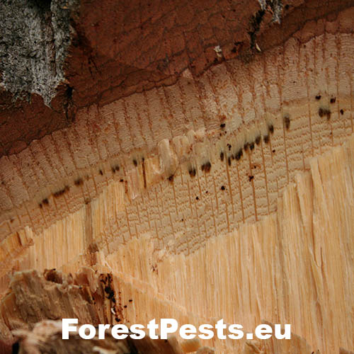 Poškodzuje semenáčiky a sadenice vo veku 1 - 3 roky na mokrých a chladných lokalitách. Infekcia začína na jemných korienkoch, huba prerastá nimi do hrubších častí, okrúžkuje koreňový kŕčok a sadenica hynie. Príznaky infekcie sa najprv prejavujú žltnutím listov na celej korune, neskôr listy vednú a hnednú. Počas mokrého počasia sa môže na infikovaných koreňoch a koreňovom kŕčku vytvoriť biele až sivé povrchové vatovité mycélium. Hýfy huby infikujú nielen kôru, ale aj drevo, ktoré je následne krehké a sadenice sa v koreňovom křčku lámu.