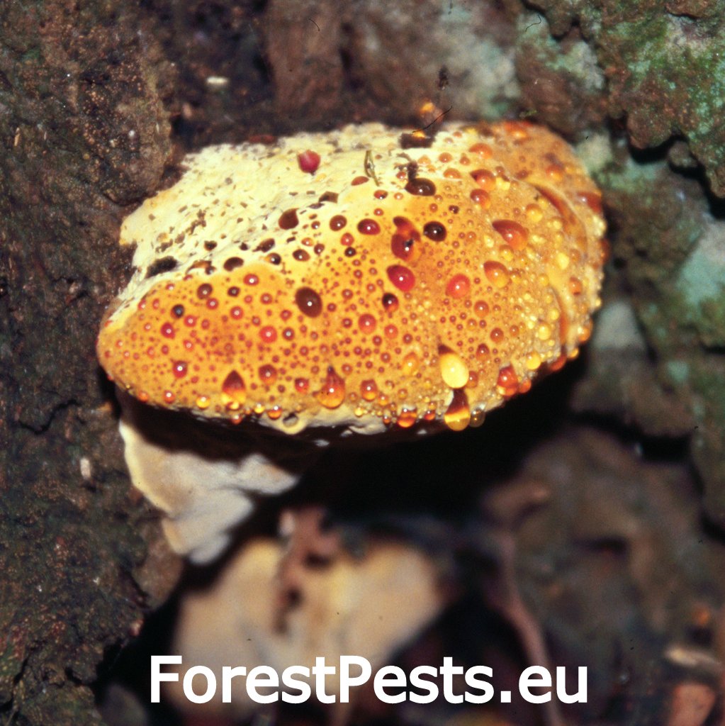 Huba vytvára jednoročné, pomerne mohutné plodnice na pni živých stromov, často rastúce nízko pri zemi. Povrch plodníc kožovito hnedý až tmavohnedý, jemne chĺpkatý až plstnatý. Okraj plodnice okrový až biely. Póry bledožlté, s vekom tmavne celá plodnica. Na povrchu plodníc a pórov sa vytvárajú kvapky žltohnedej tekutiny. Huba spôsobuje bielu hnilobu jadrového dreva koreňov a spodnej časti kmeňa, vyššie do kmeňa však nepostupuje.