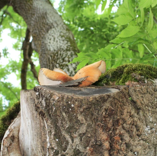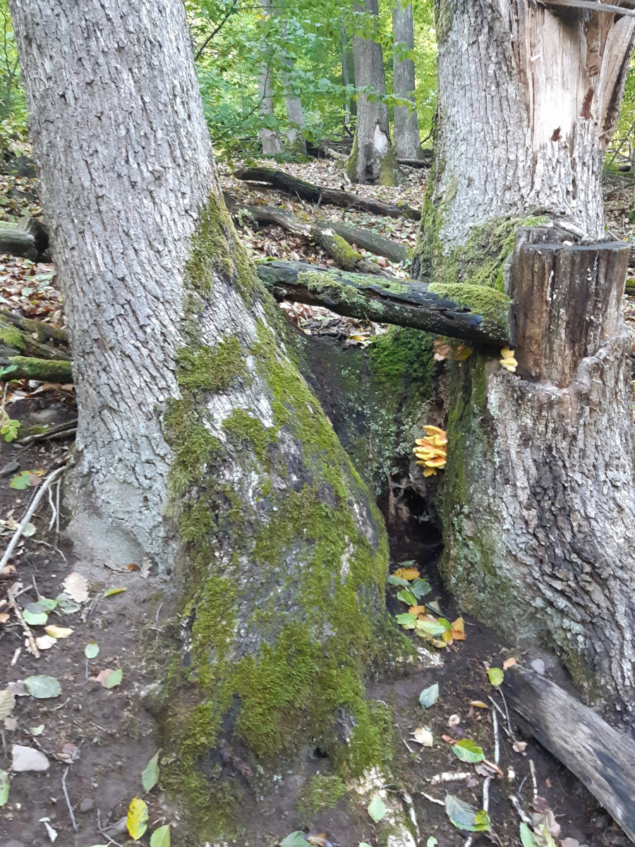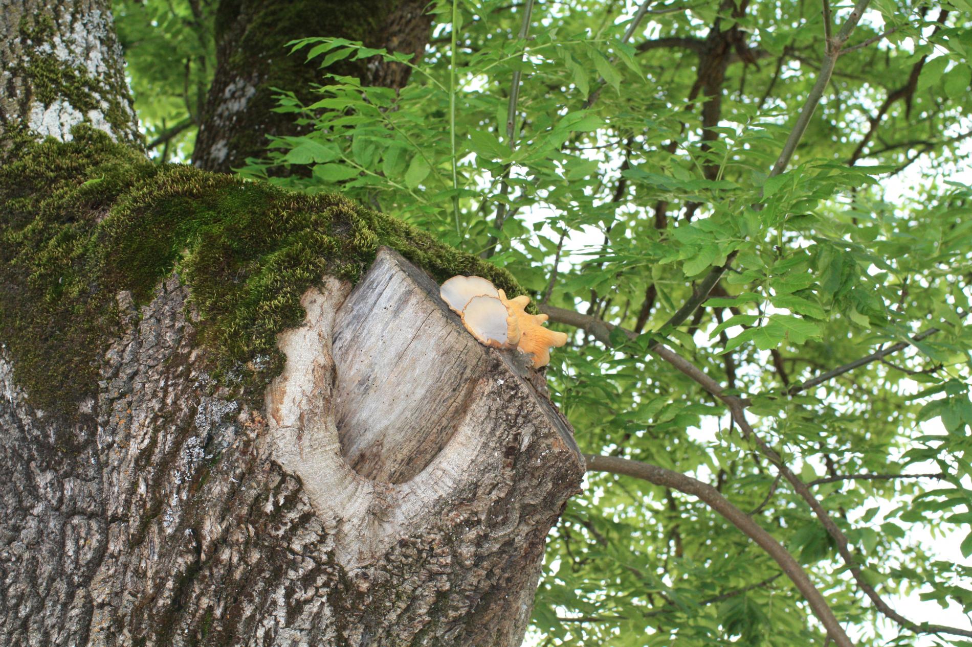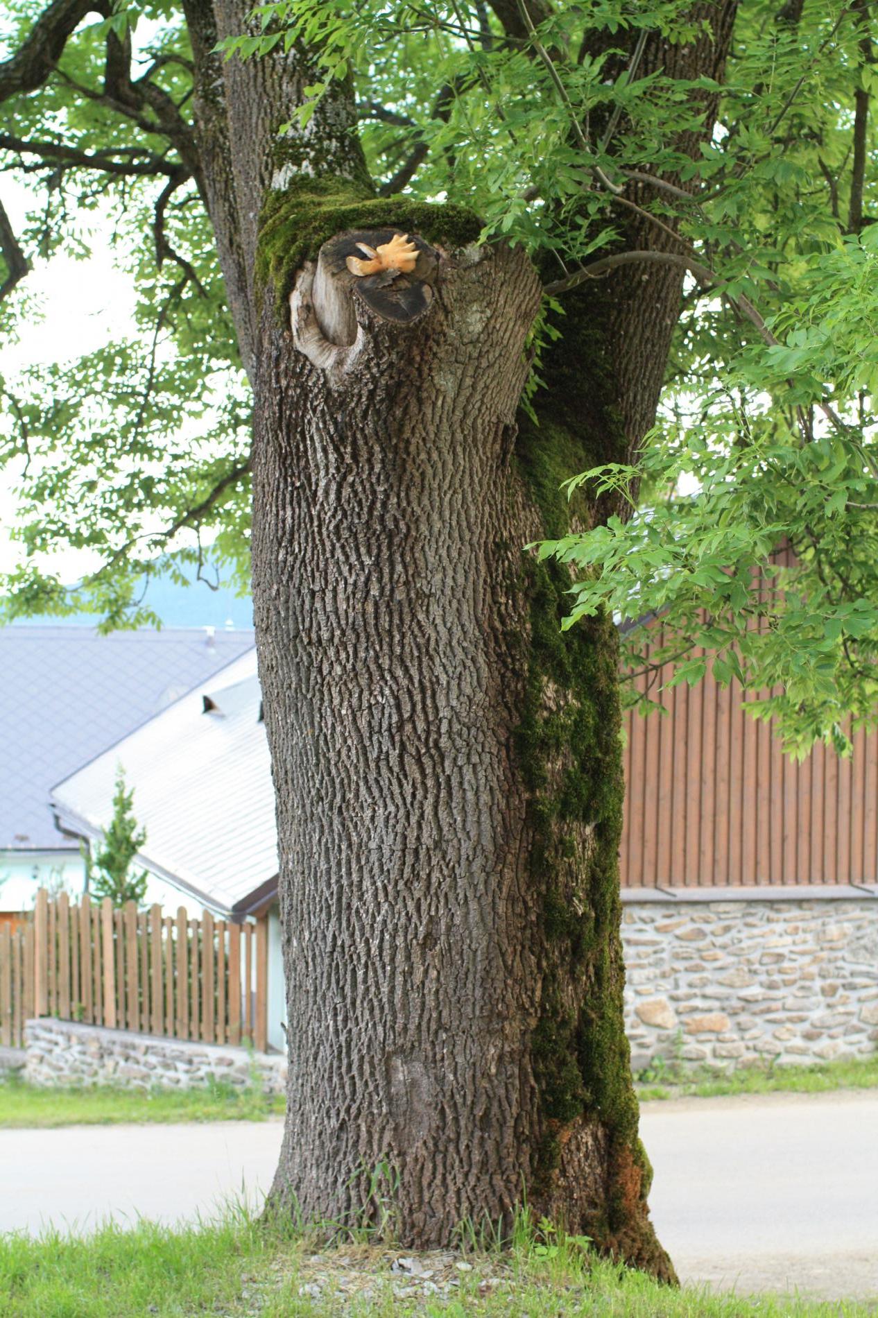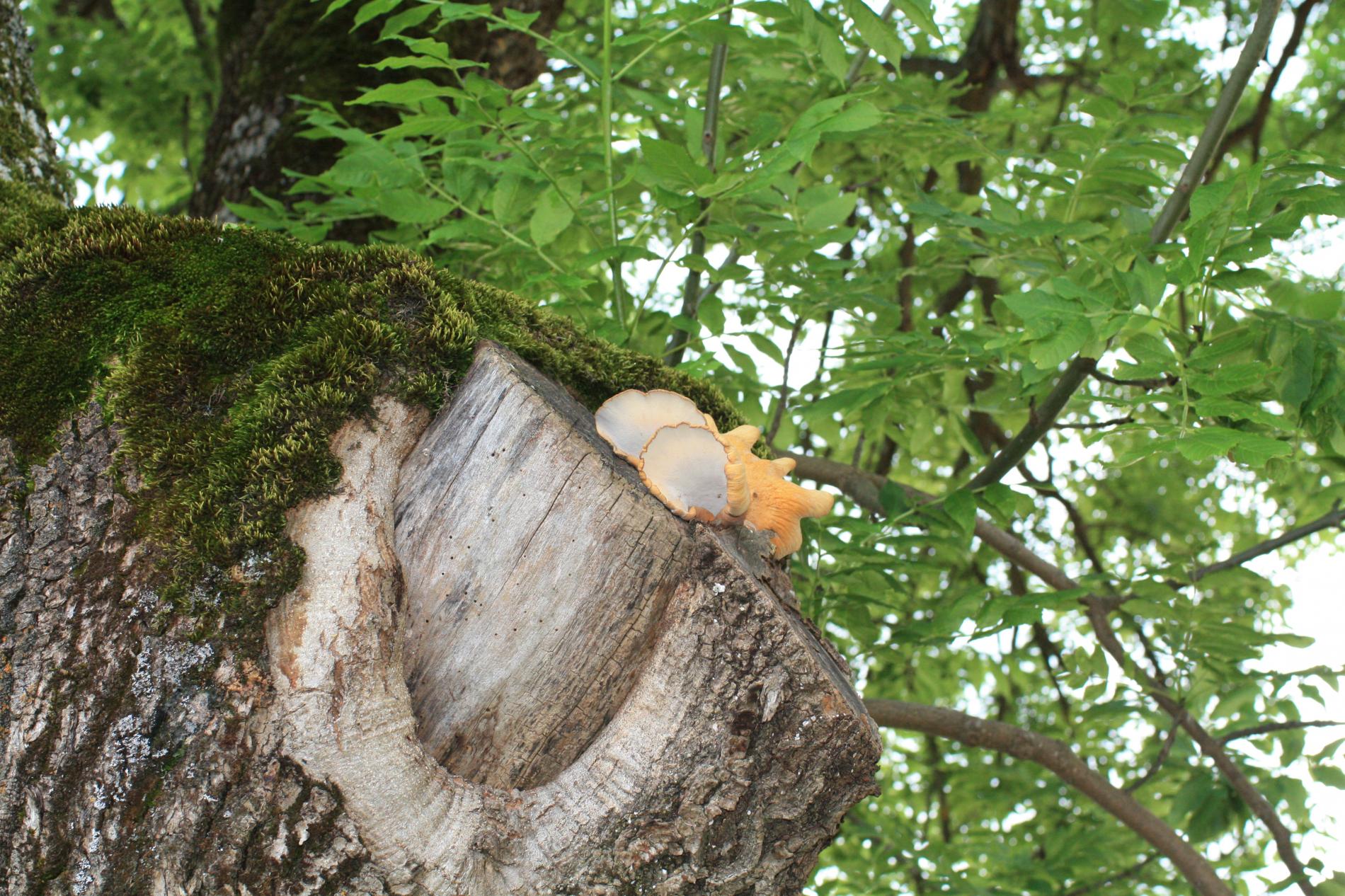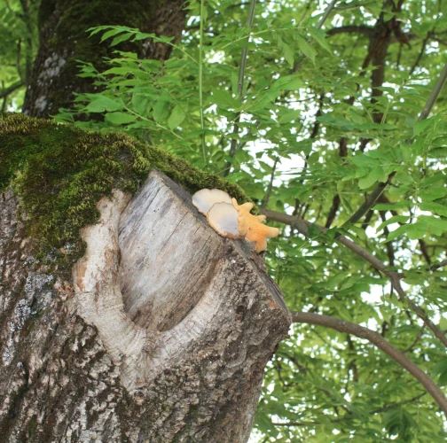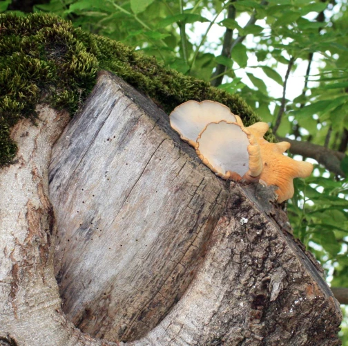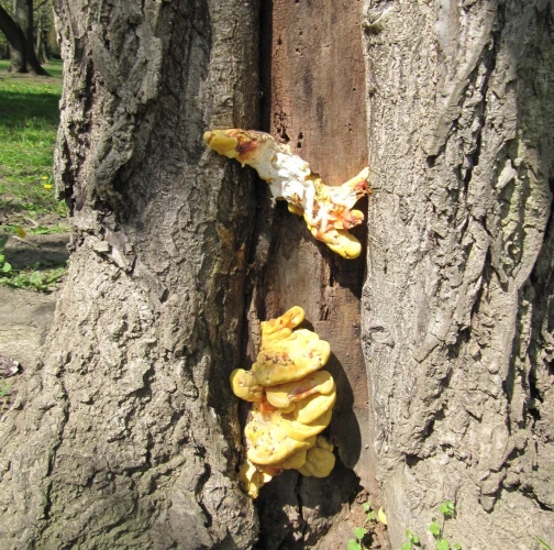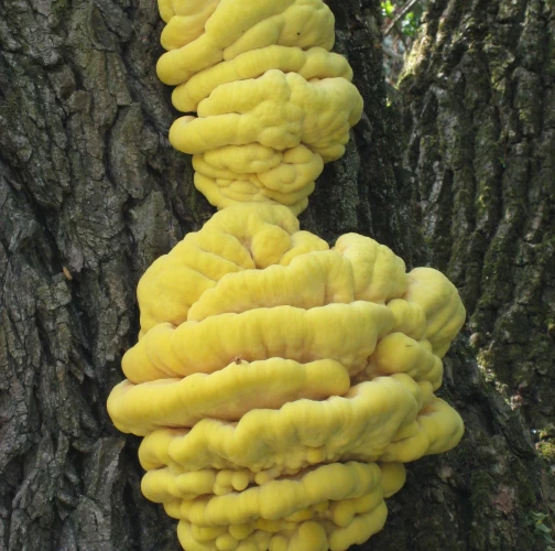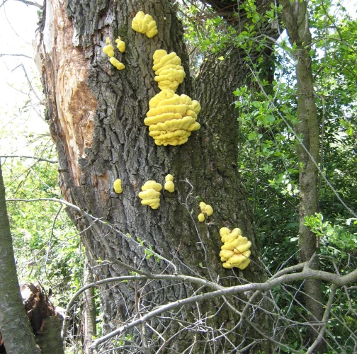 Prítomnosť žltých plodníc na kmeni listnatých drevín.