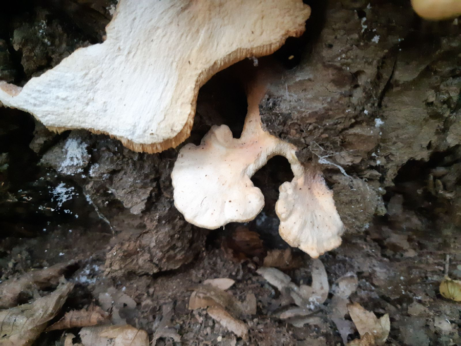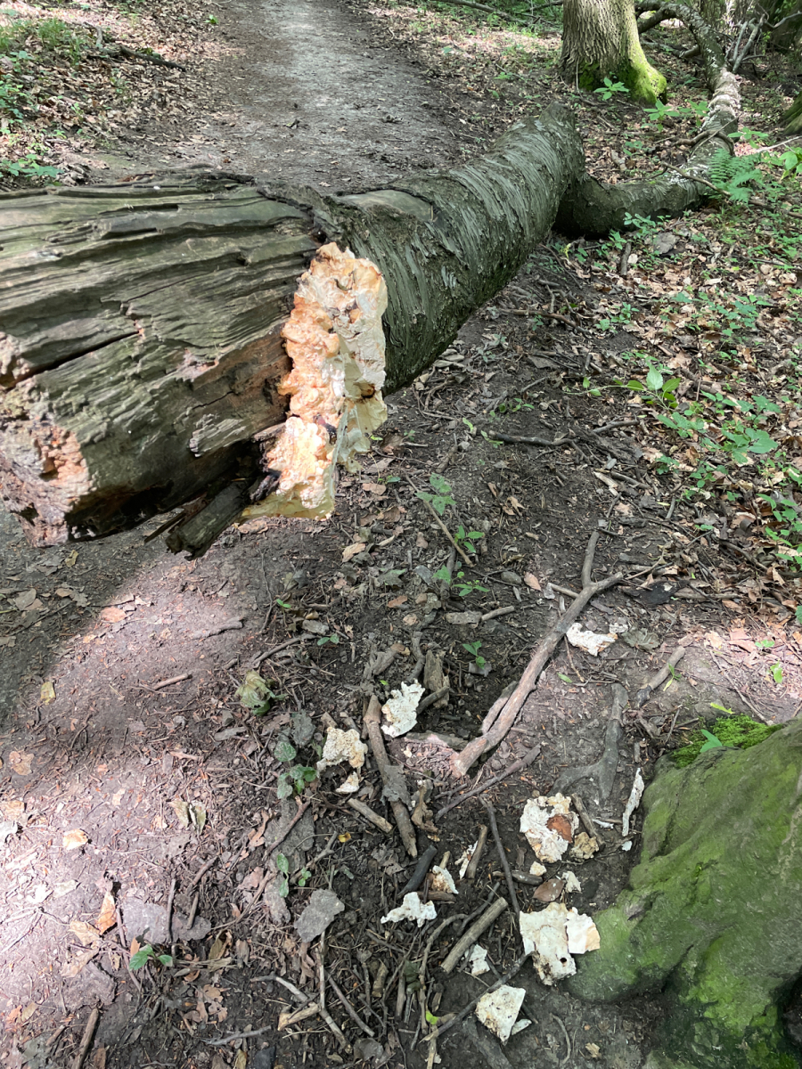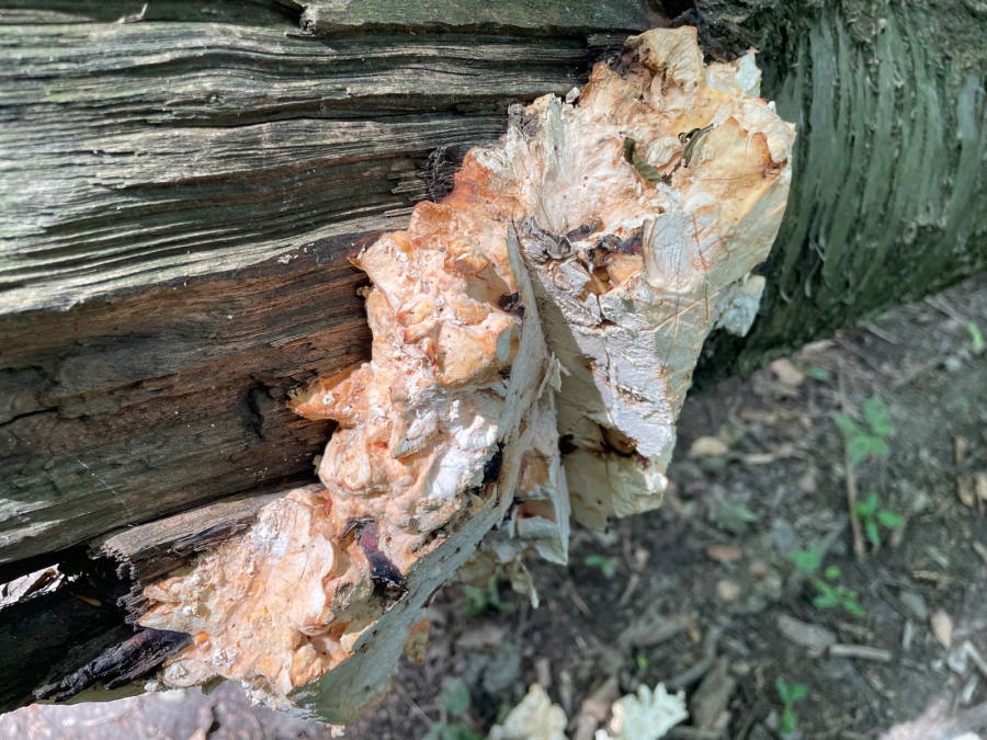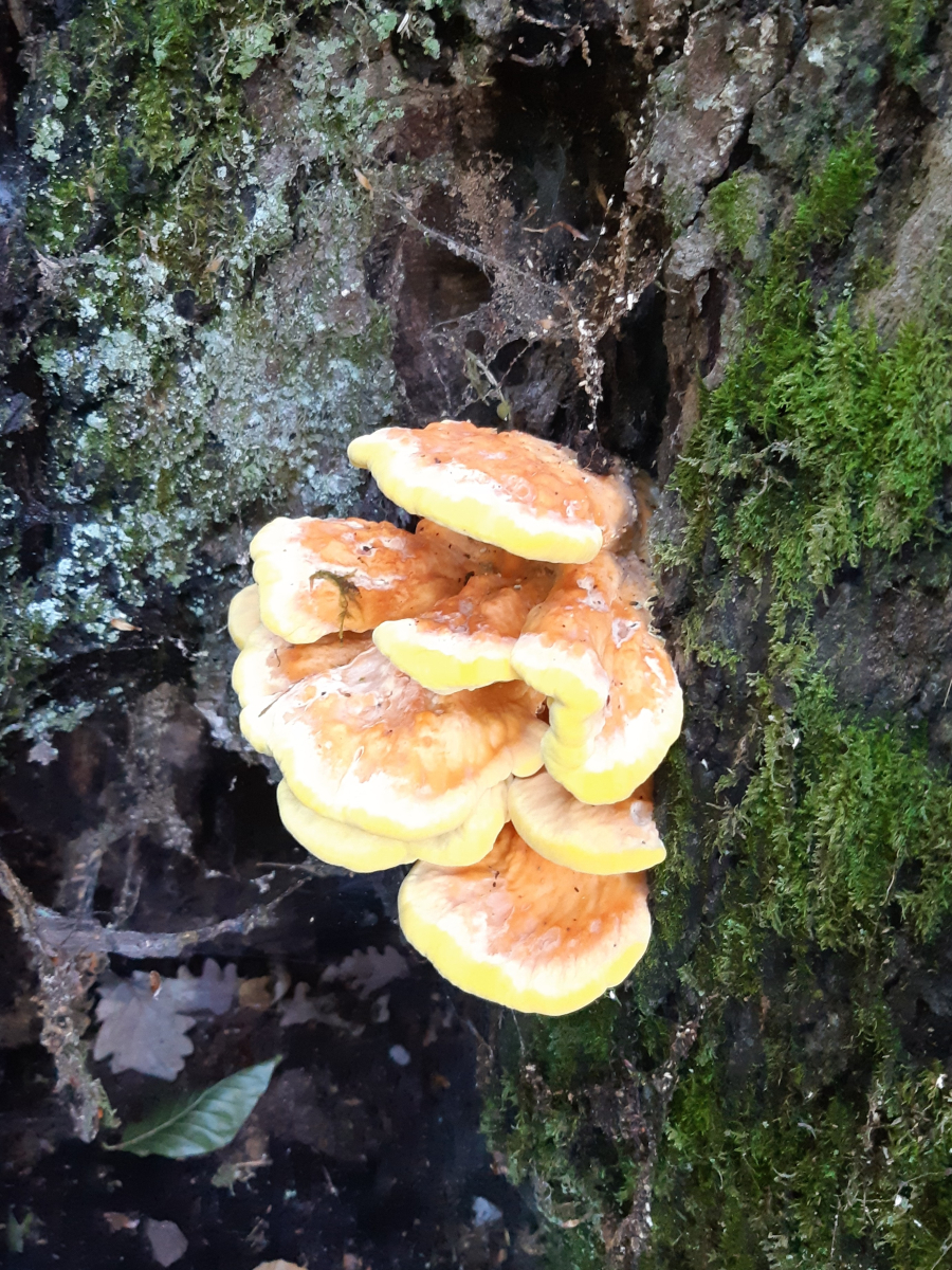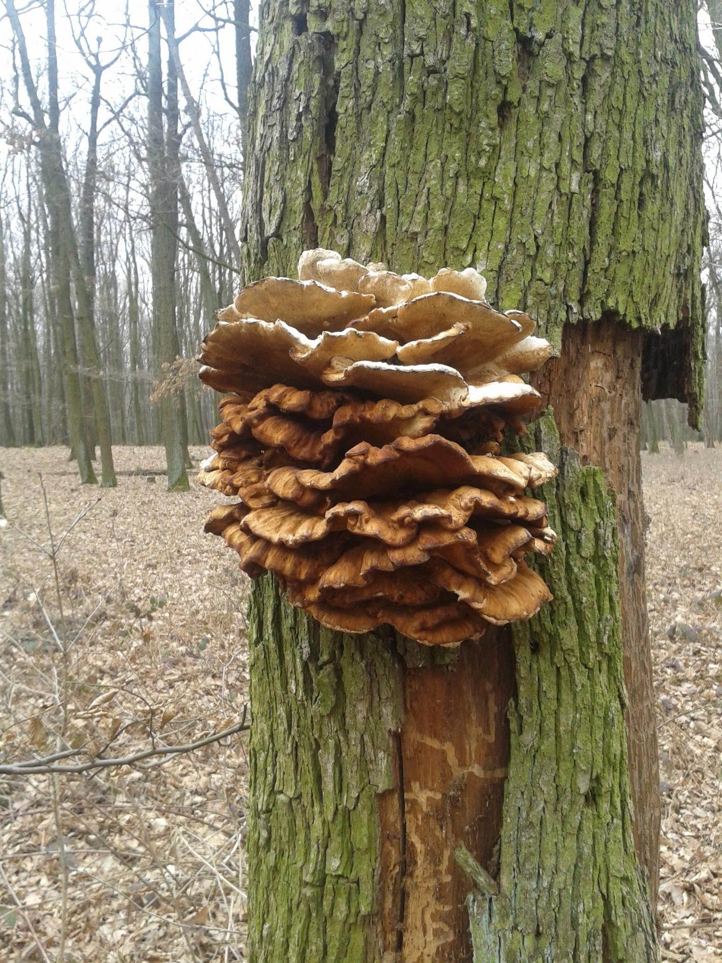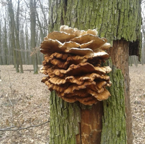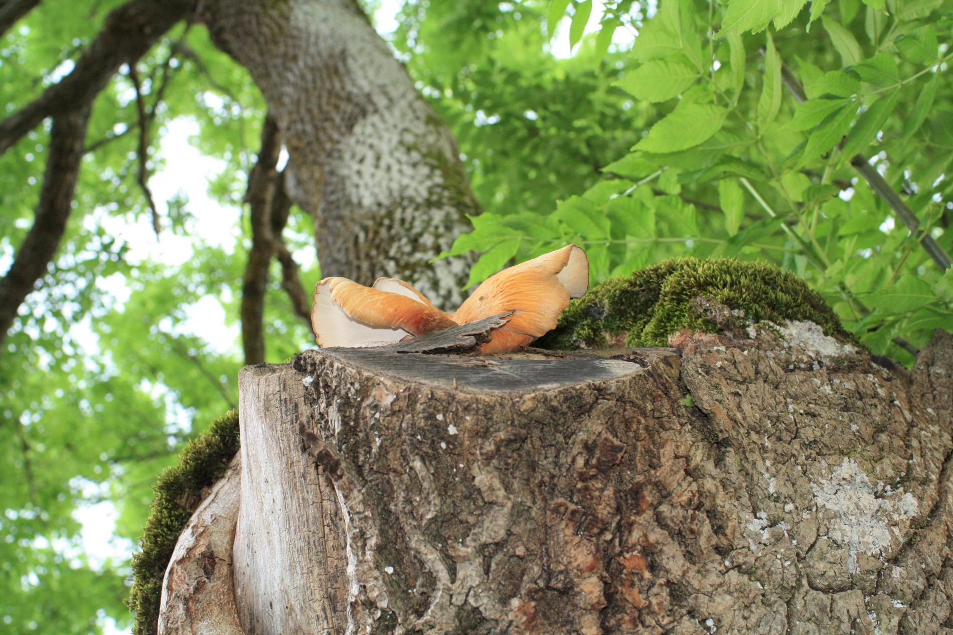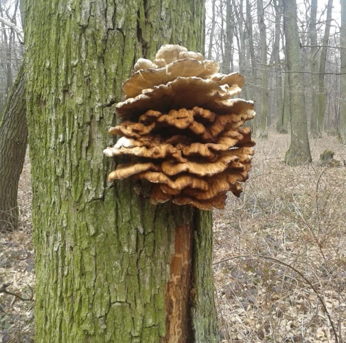 Prítomnosť žltých plodníc na kmeni listnatých drevín.