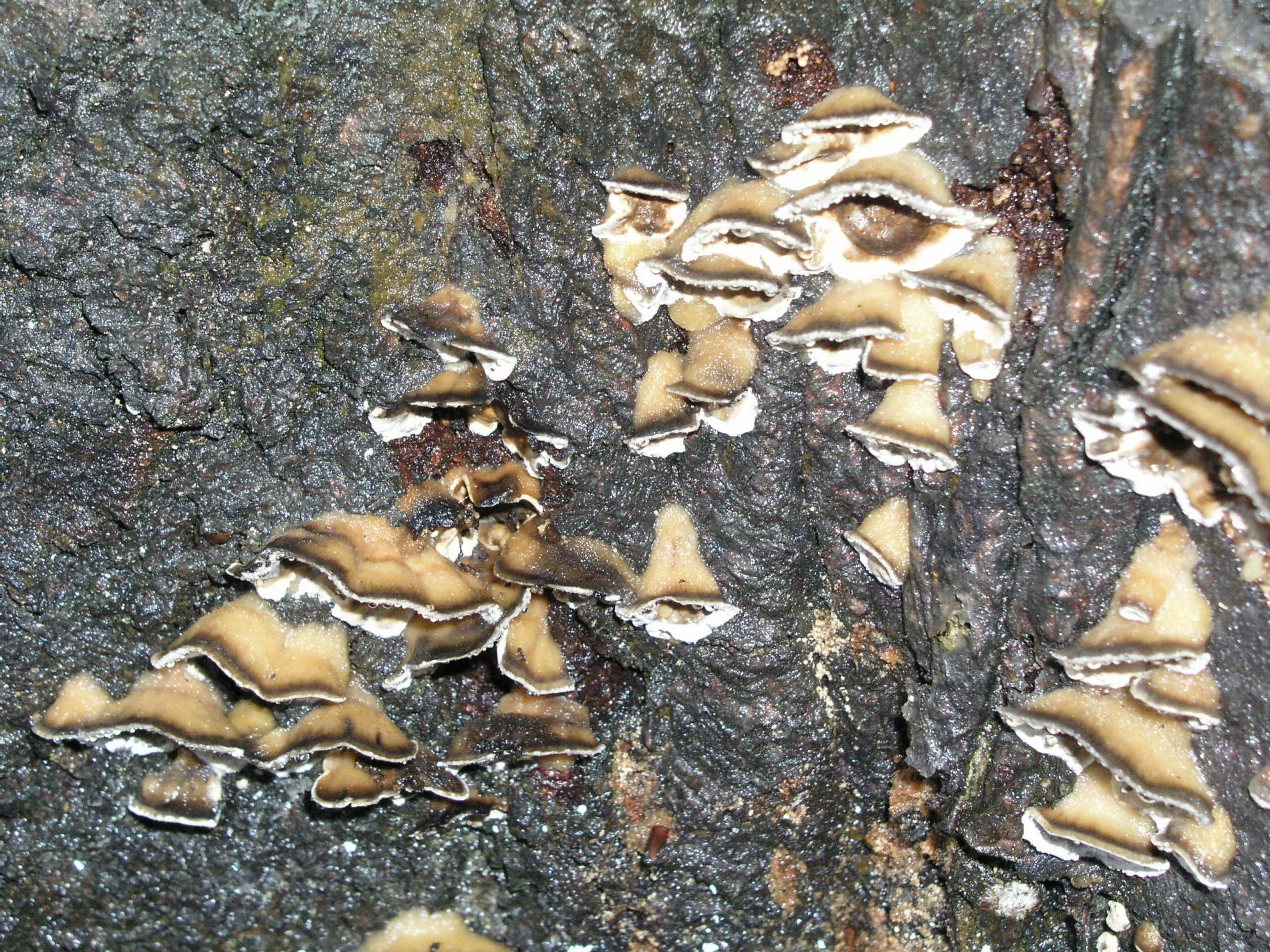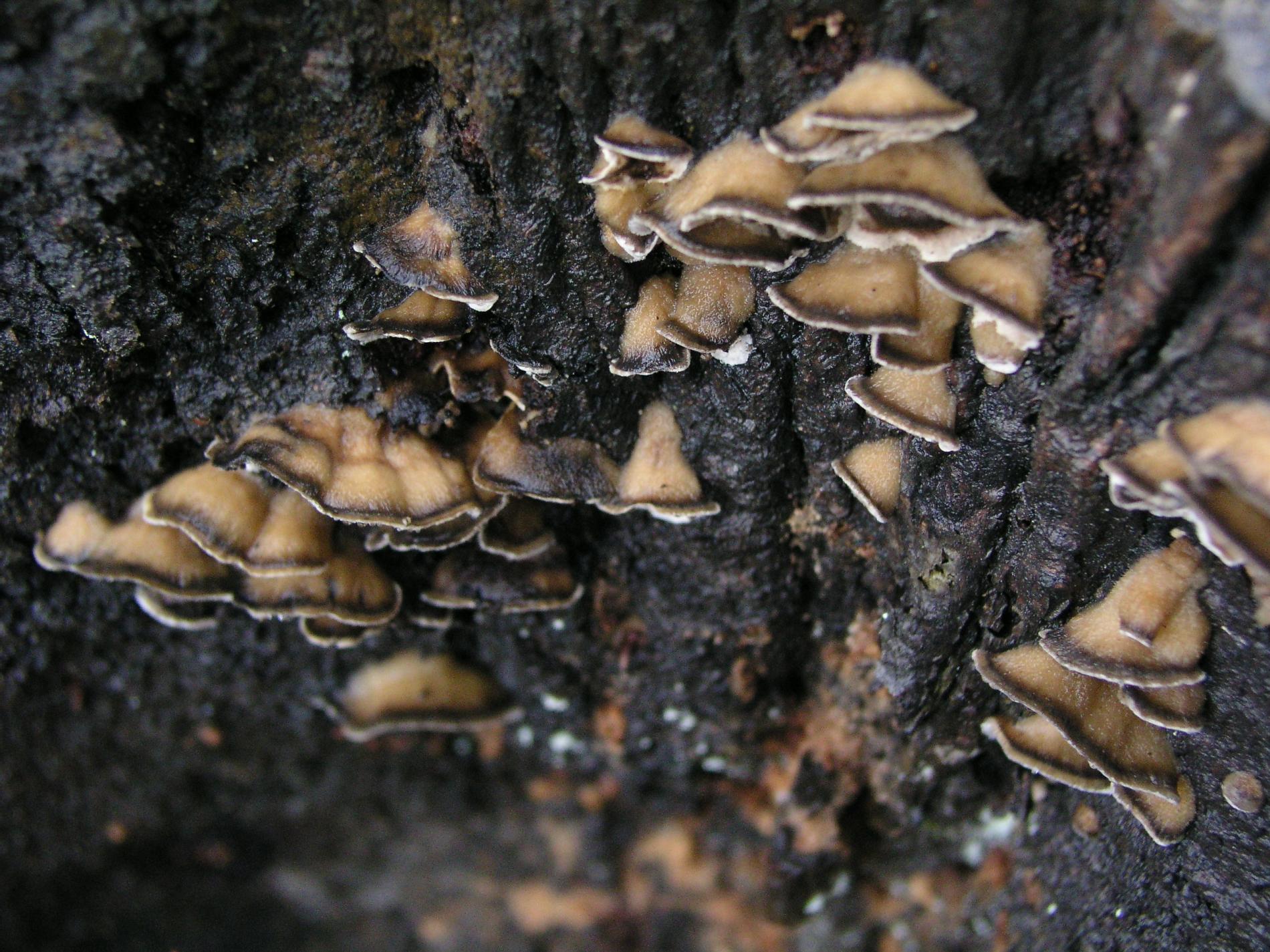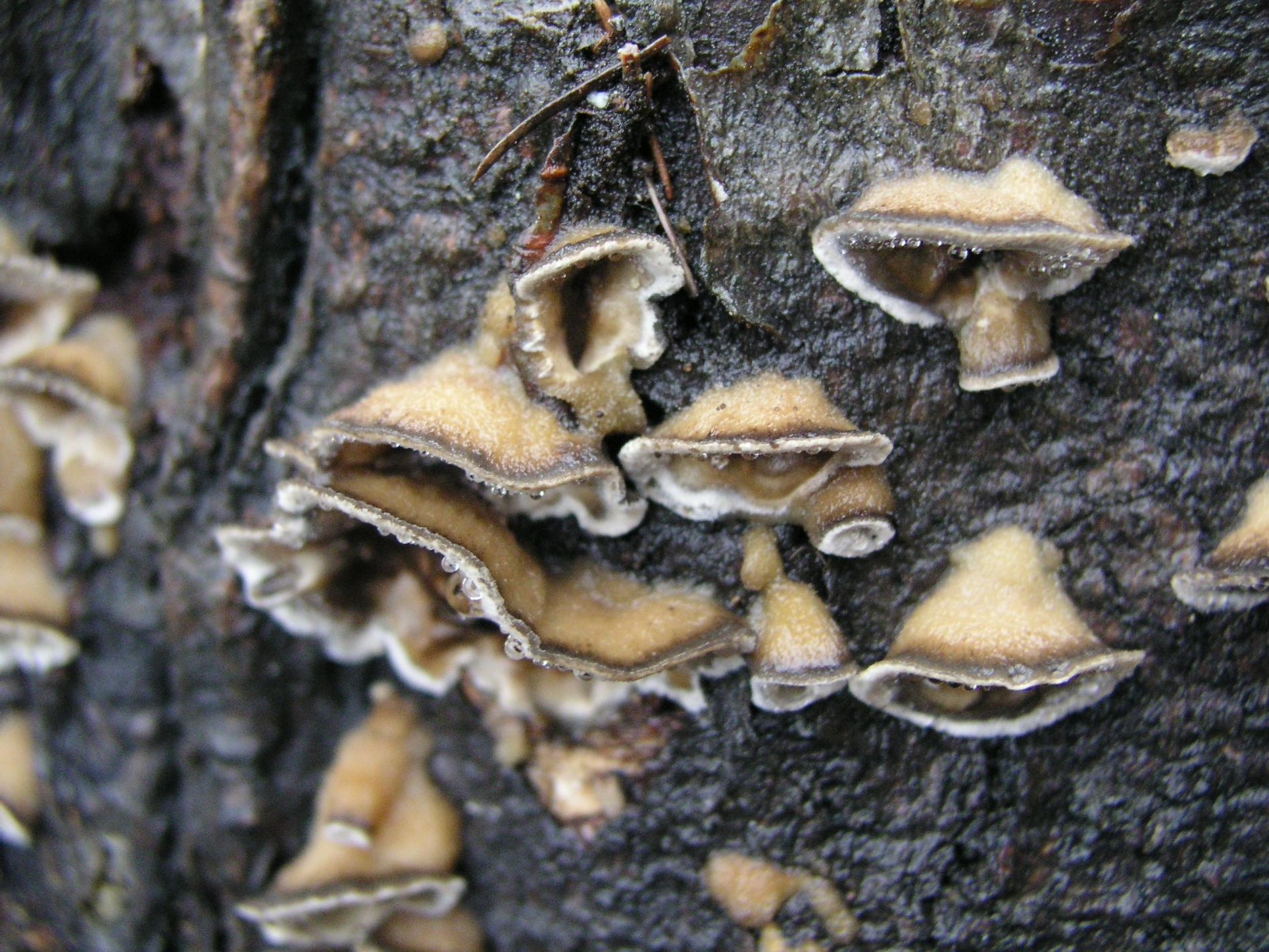 Prítomnosť strechovite nad sebou usporiadaných  svetlosivých klobúčikov plodníc.