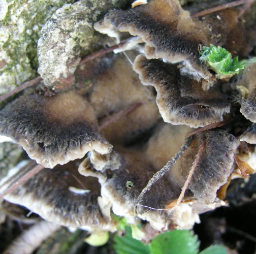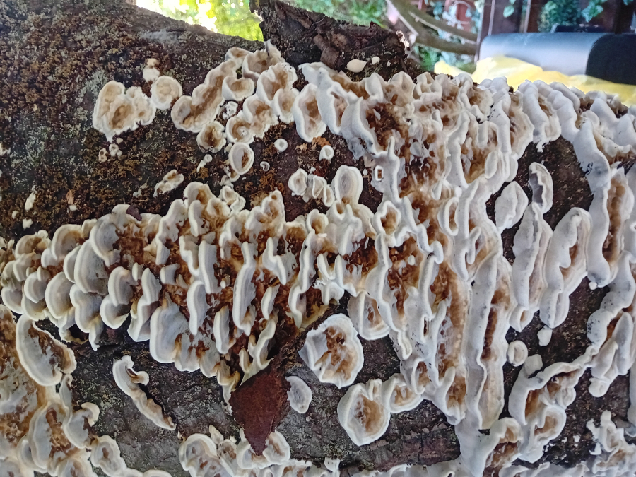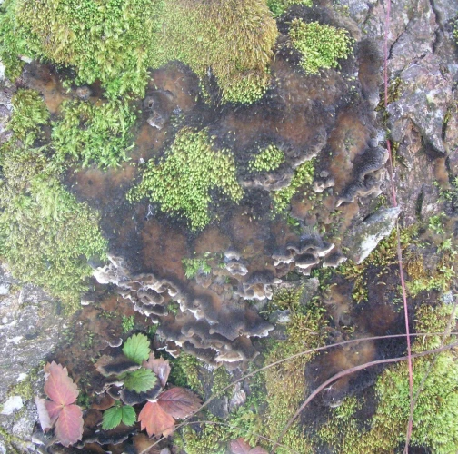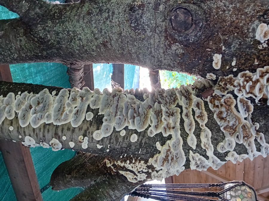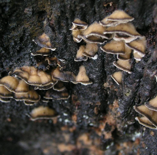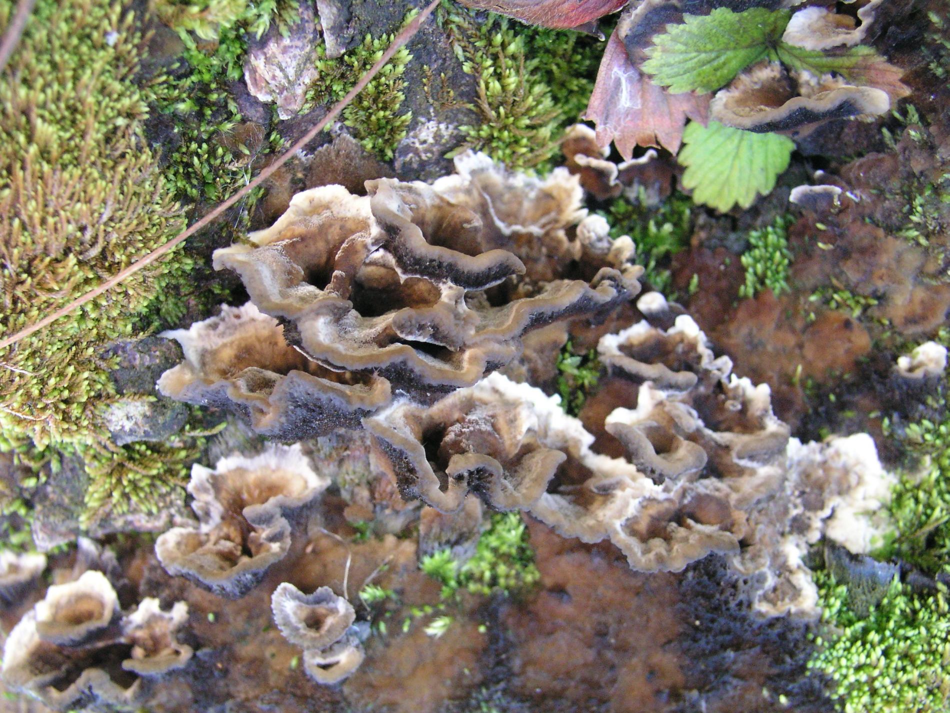 Prítomnosť strechovite nad sebou usporiadaných  svetlosivých klobúčikov plodníc.