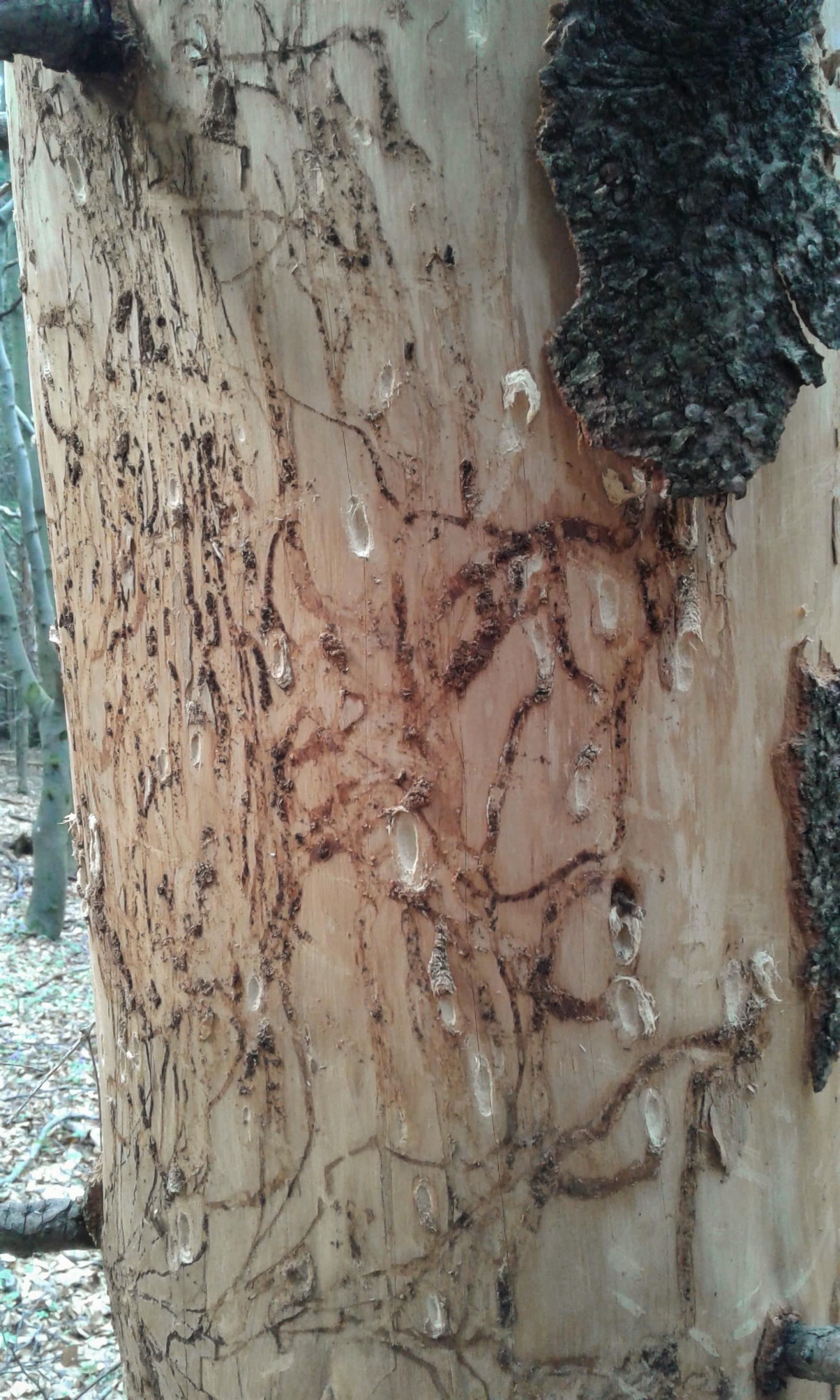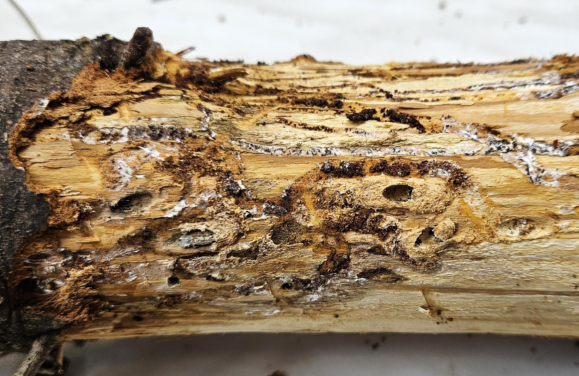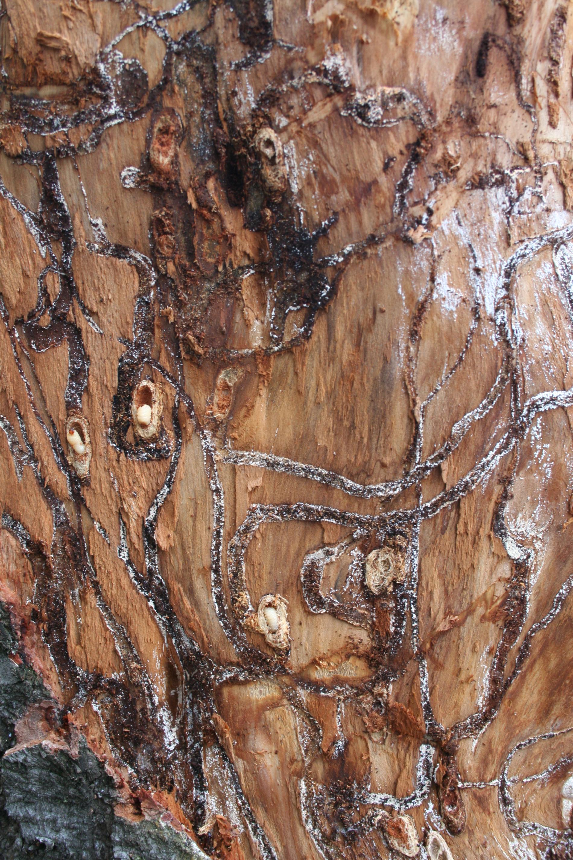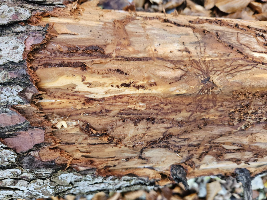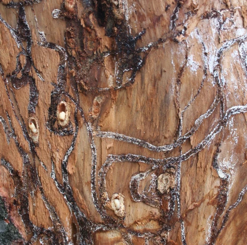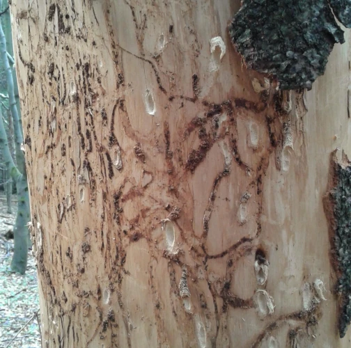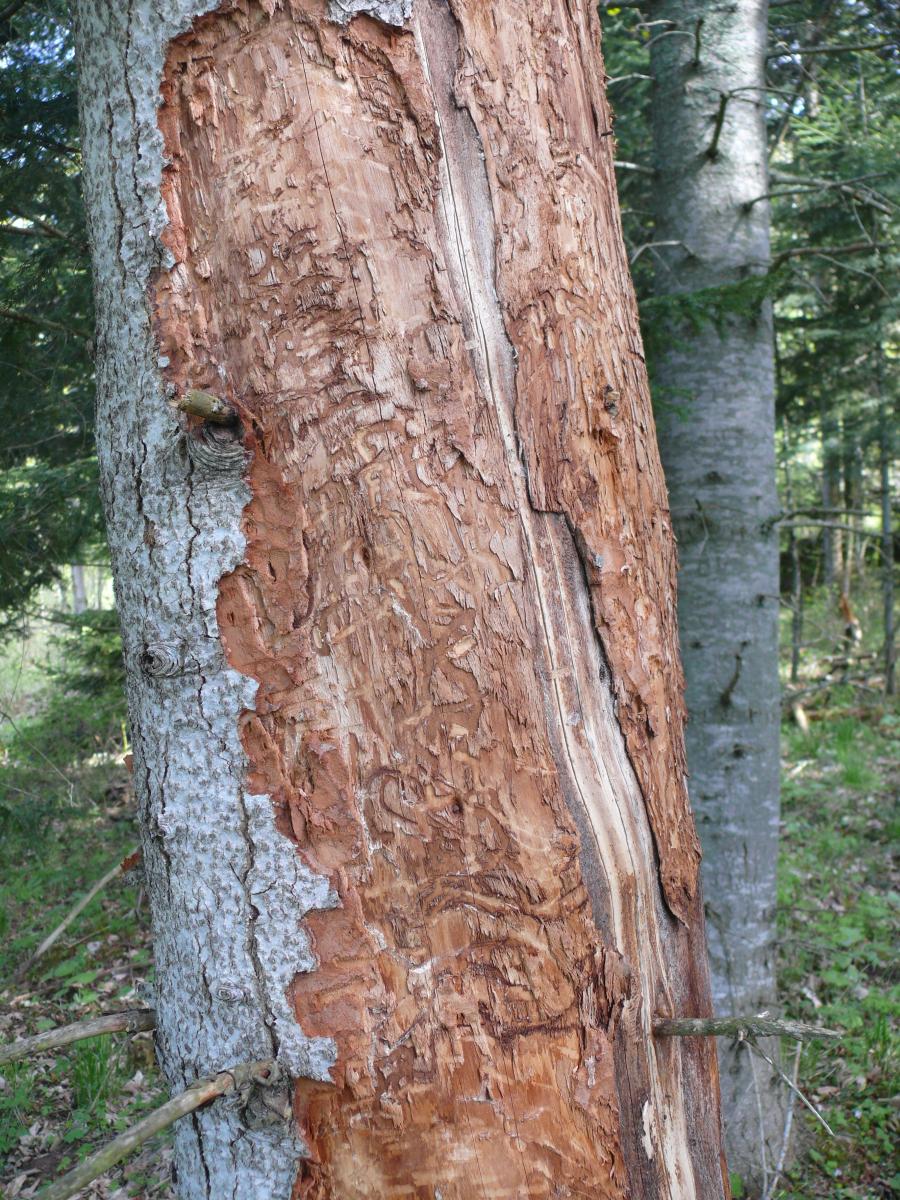 Larvy a požerky pod kôrou kmeňov jedlí.