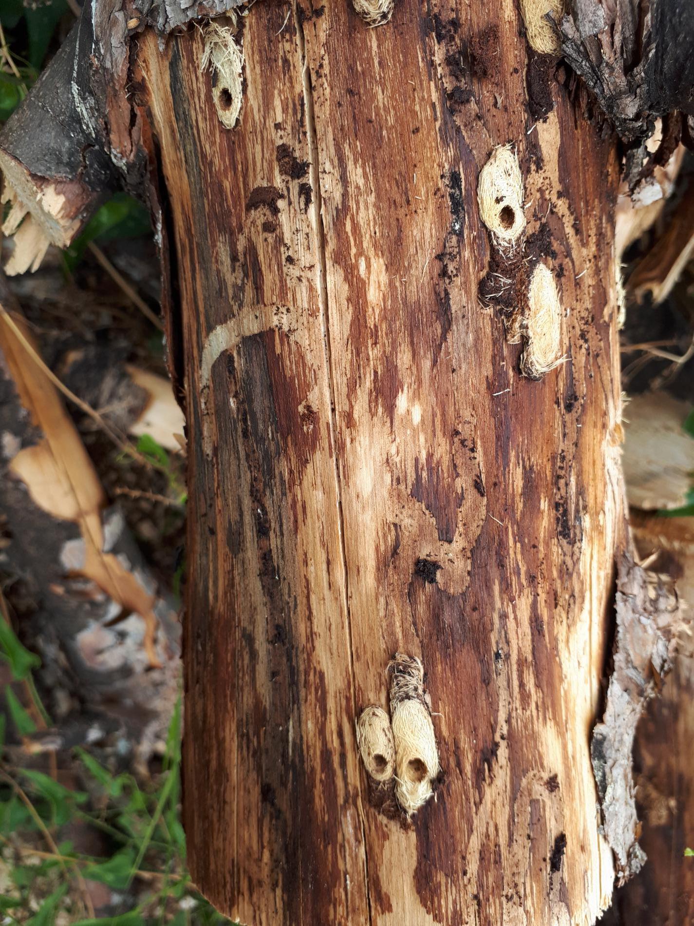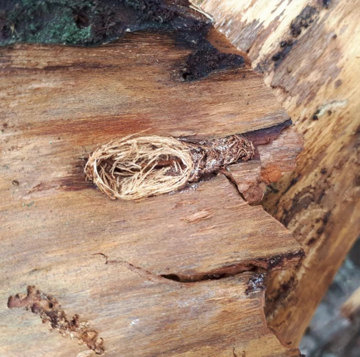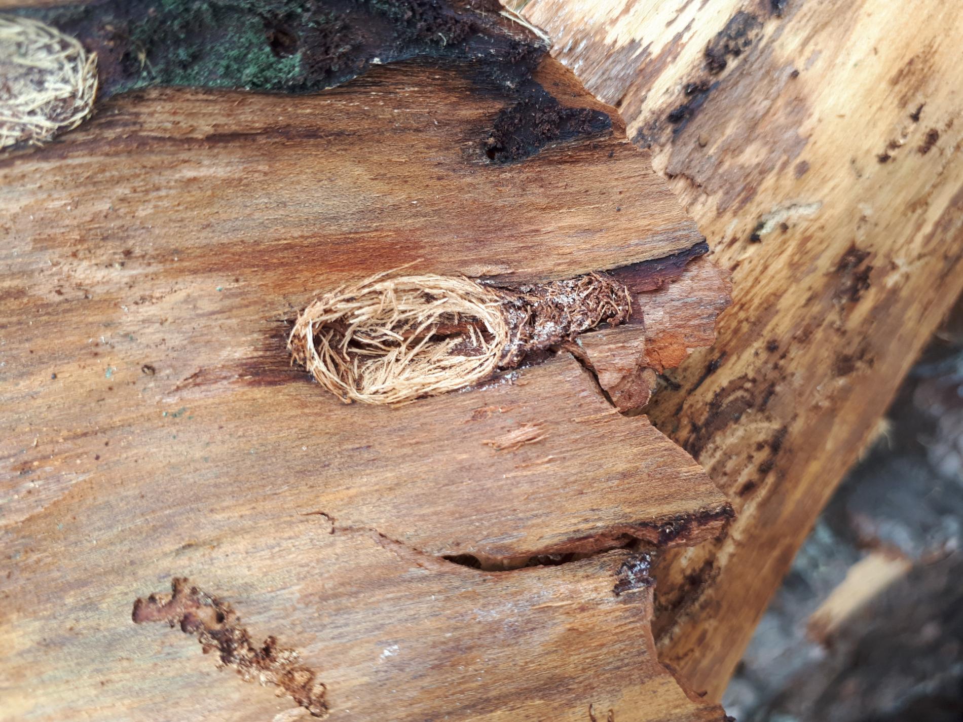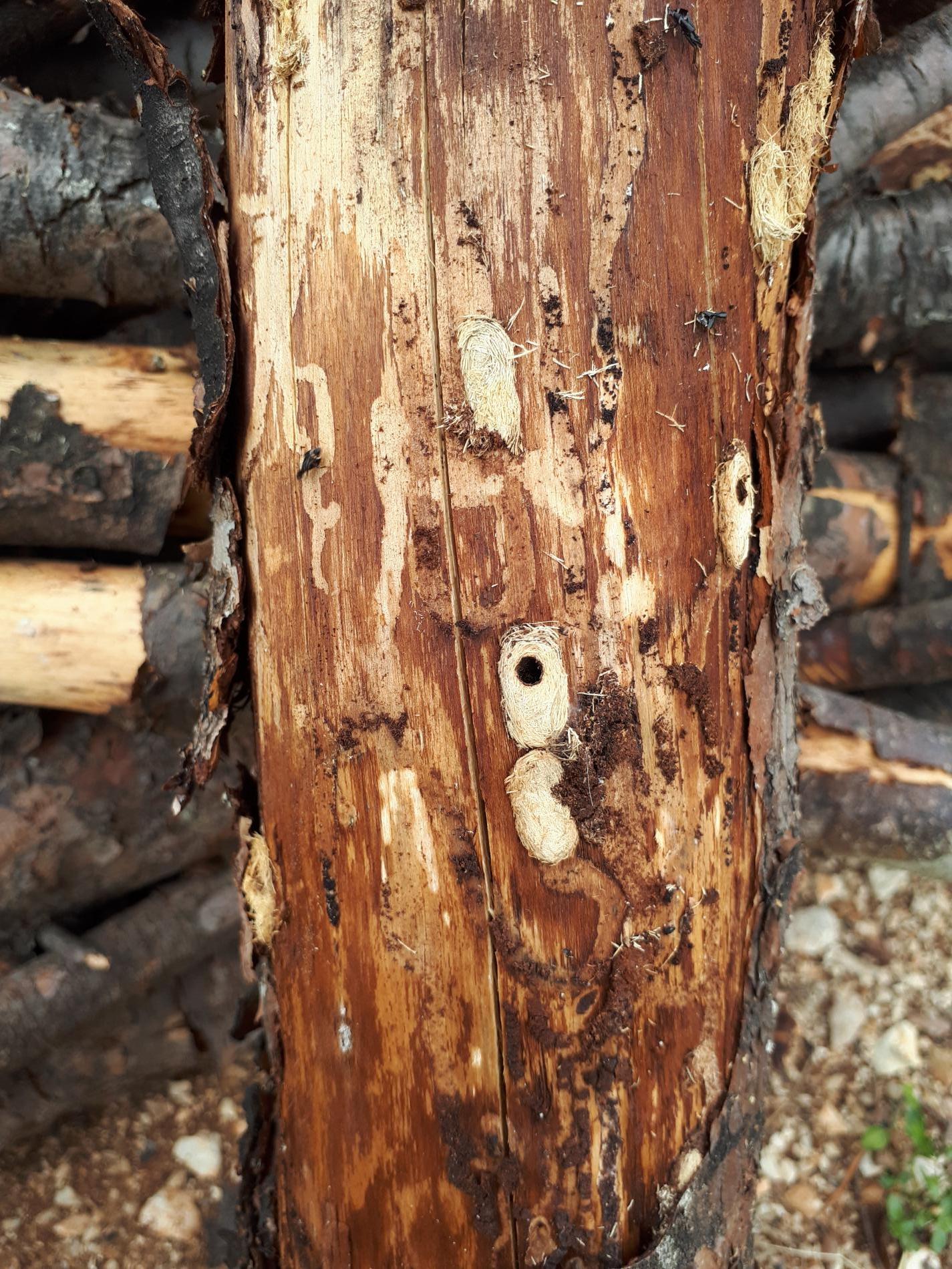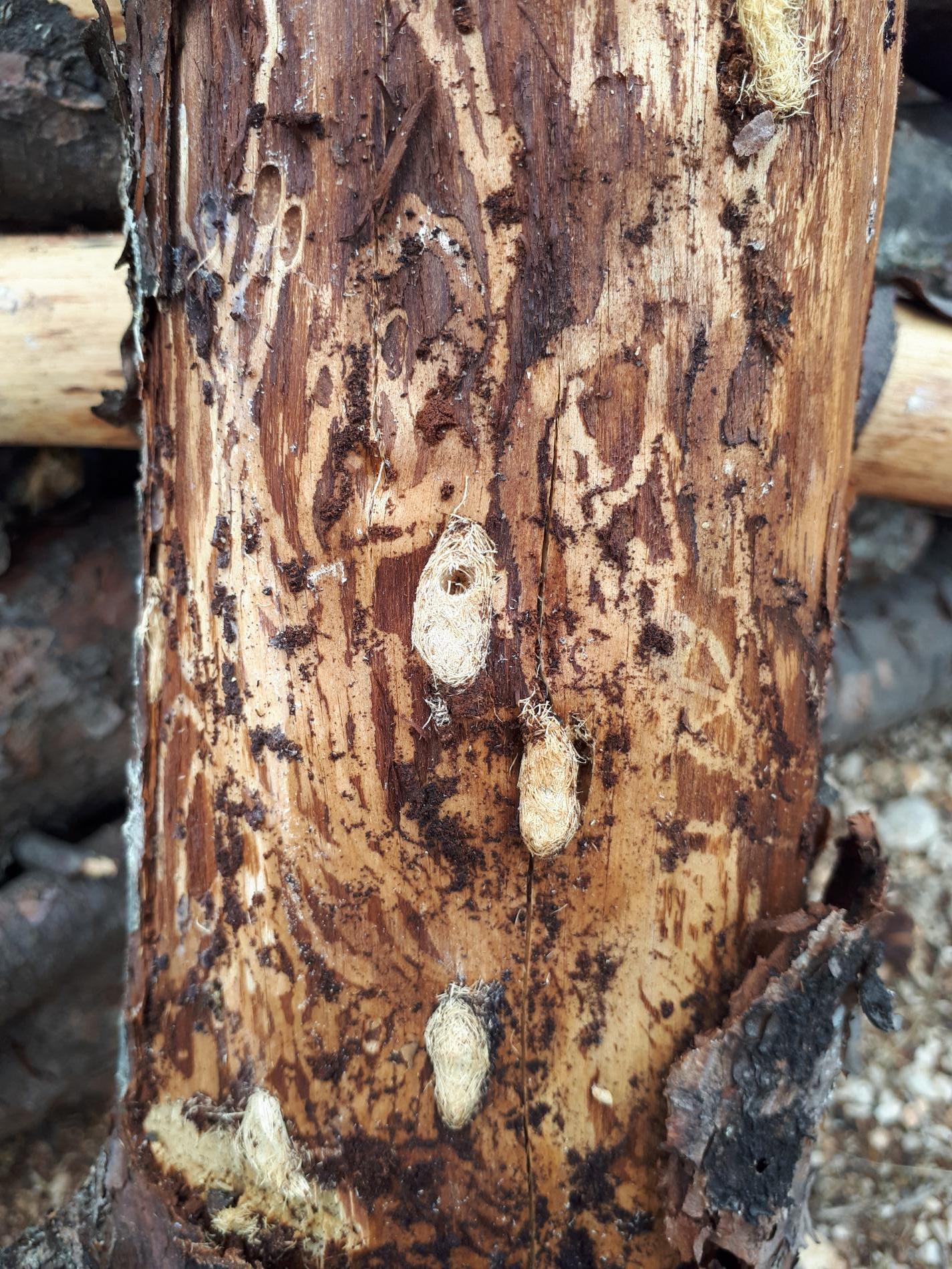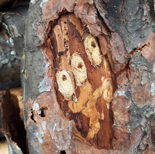 Kukelné kolísky tesne pod kôrou vyplnené drvinou.