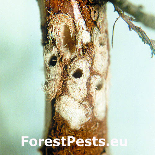 Imágo tohto druhu je asi 7 mm dlhý kávovo hnedý chrobák s pretiahnutou hlavou a svetlými škvrnami na krovkách. Napáda výlučne mladé borovice do 10 rokov. Larvy vyžierajú v lyku na územkovej časti tenké, neskôr sa rozširujúce chodby na konci ktorých sa kuklia v kukelných kolískach oddelených od kôry jemnou vrstvou drviny. Na kmeni je poškodenie dobre viditeľné, kôra sa ľahko odlupuje. Často sú prítomné aj biele larvy alebo kukly škodcu. Je to výlučne sekundárne škodiaci druh. Napáda prednostne stromčeky so zníženou vitalitou (poškodenie mrazom, suchom...). V prípade premnoženia môže naletieť aj na zdravé stromy.