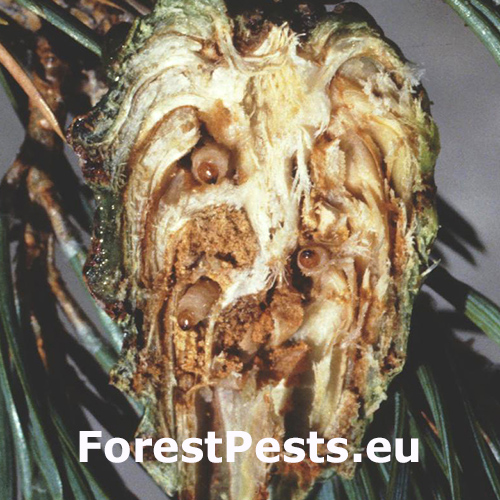 Napadnuté borovicové šišky sú zdeformované, často zakrivené a opadávajú predčasne. Po vyliahnutí dospelých jedincov môžu byť viditeľné malé okrúhle výstupné otvory.