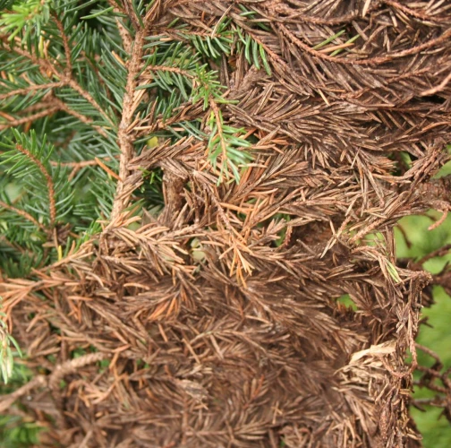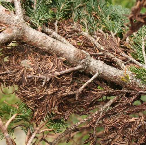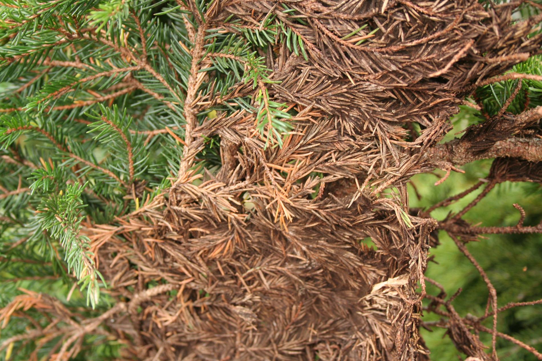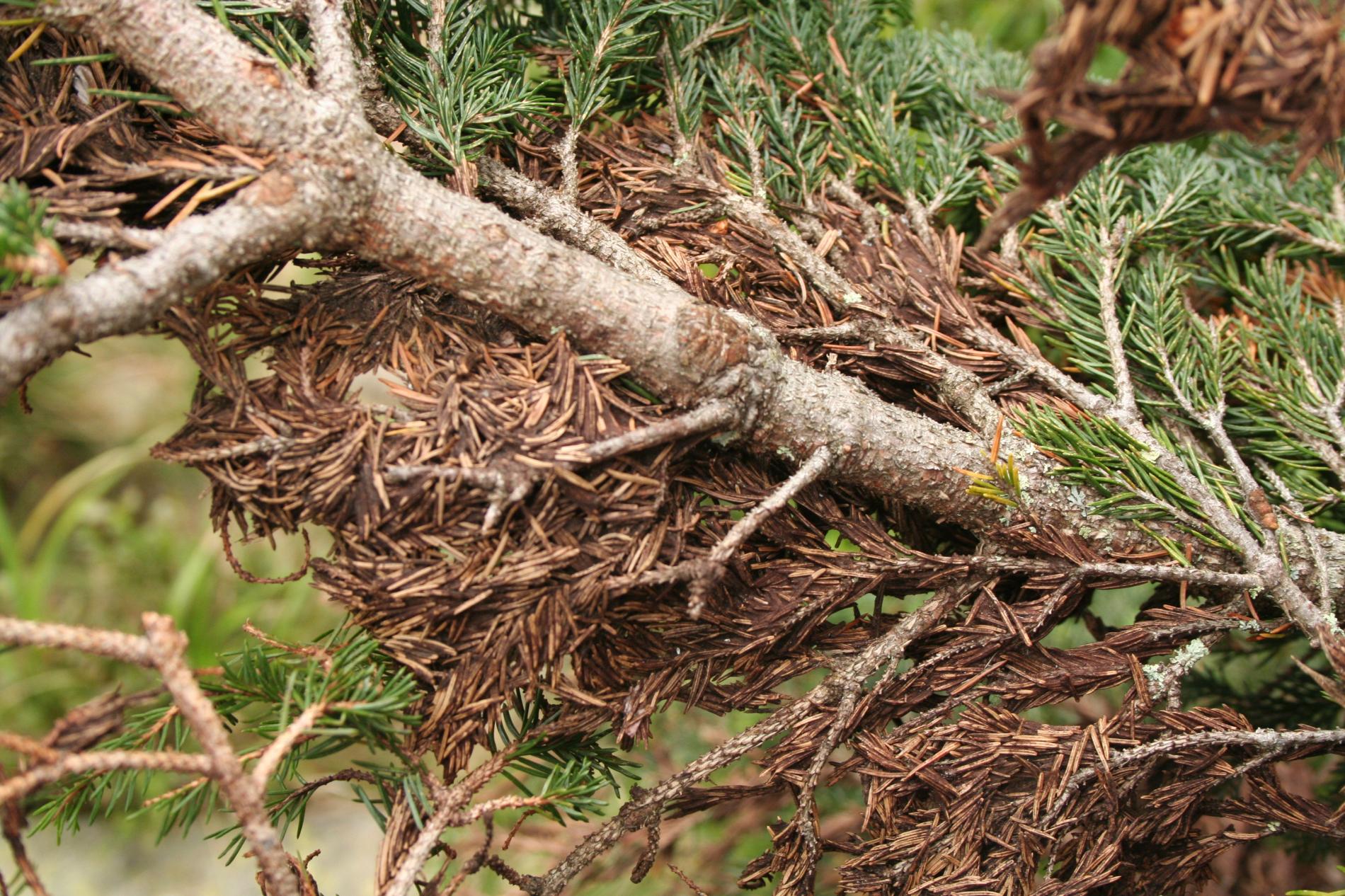 Huba veľmi dobre rastie pri teplote 0°C s optimom 15°C a pri vlhkosti vzduchu nad 95%. Náchylné sú porasty v horských polohách na miestach, kde sneh pokrýva vetvy 6 – 7 mesiacov v roku. Huba najprv žije ako epifyt, mechanicky obrastá a spletá ihlice a vetvičky, neskôr preniká cez prieduchy do ihlíc, parazituje na živých pletivách a spôsobuje ich odumieranie. Na starších stromčekoch a vyššej kosodrevine napáda len spodné vetvy. Veľmi škodlivá je však v lesných škôlkach. K infekcii dochádza v čase bez snehu.
