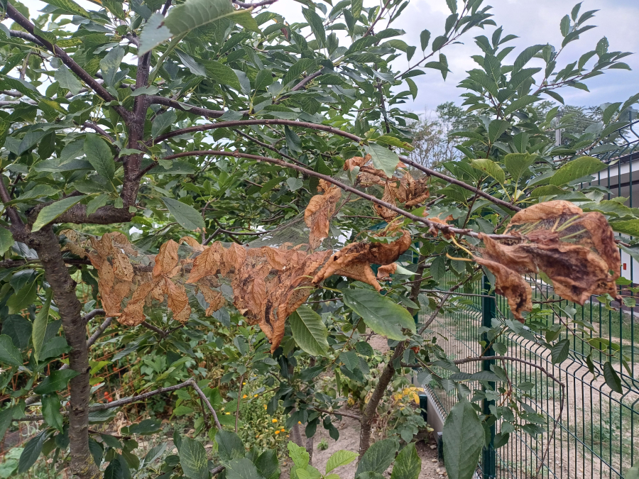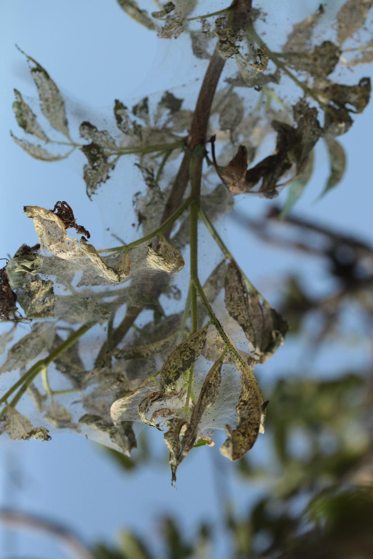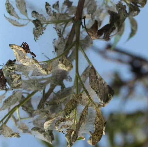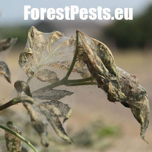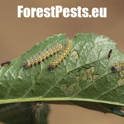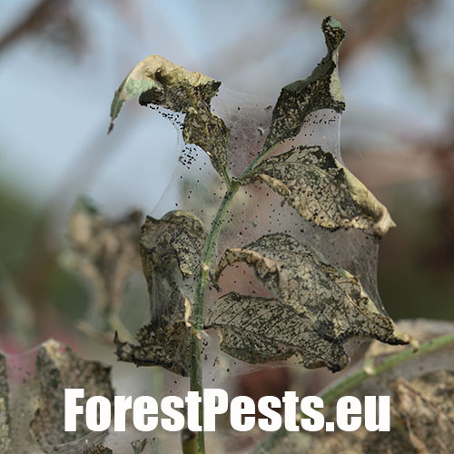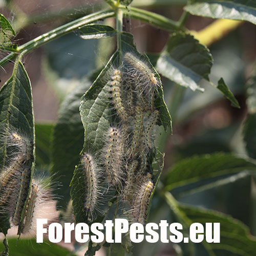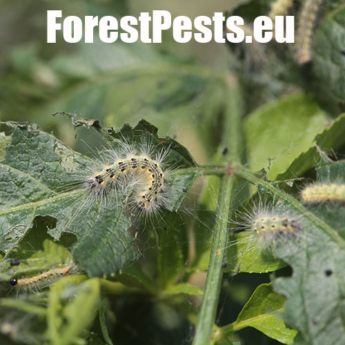 Listy sú najskôr skeletované a neskôr poškodené tak, že silnejšie žilky zostávajú nedotknuté. Listy poškodzujú húsenice, ktoré žijú najskôr spoločne neskôr jednotlivo. Malé húseničky rýchlo rastú a spriadajú do pavučinových vlákien celé vetvy a konáre. Dorastajú do dĺžky 30 - 45 mm. V dospelosti majú na chrbte tmavší pás. Kuklia sa v trhlinách kôry, často spoločne. Kukly druhej generácie prezimujú. Prvá generácia sa rojí v apríli až máji, druhá v auguste a septembri. Do Európy sa tento škodca dostal relatívne v nedávnej minulosti - okolo roku 1940 - z USA.