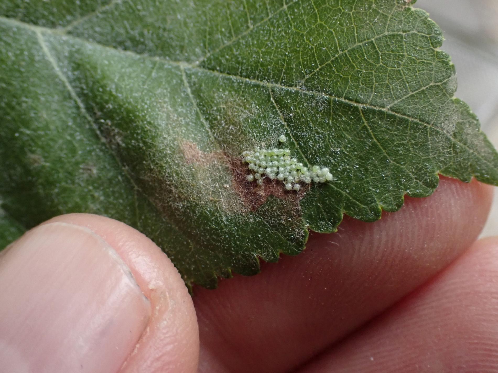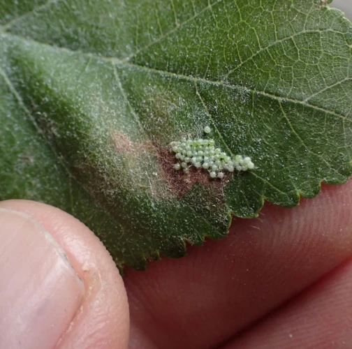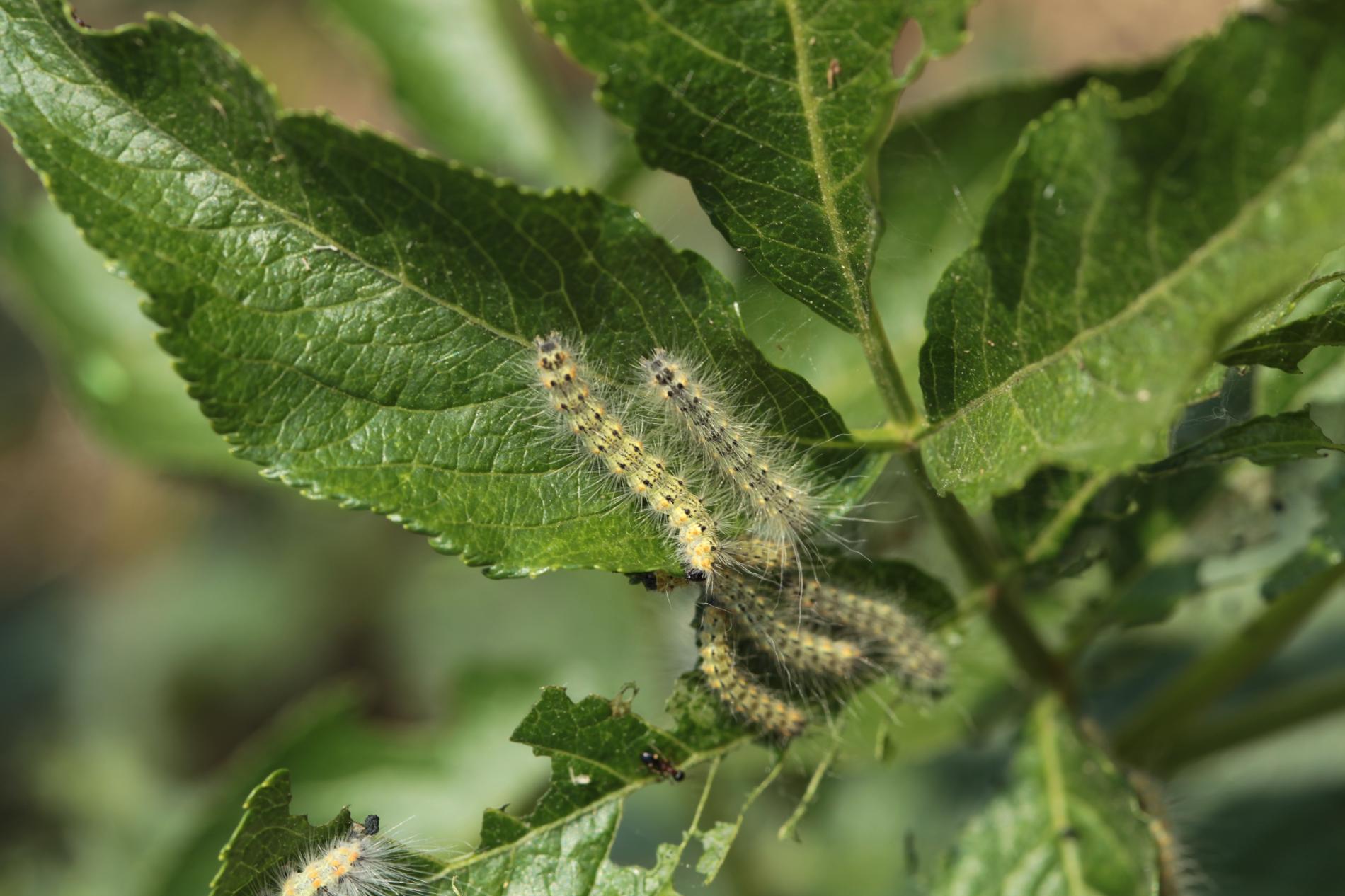 Listy sú najskôr skeletované a neskôr poškodené tak, že silnejšie žilky zostávajú nedotknuté. Listy poškodzujú húsenice, ktoré žijú najskôr spoločne neskôr jednotlivo. Húsenice sú ochlpené, sivo-žlté.