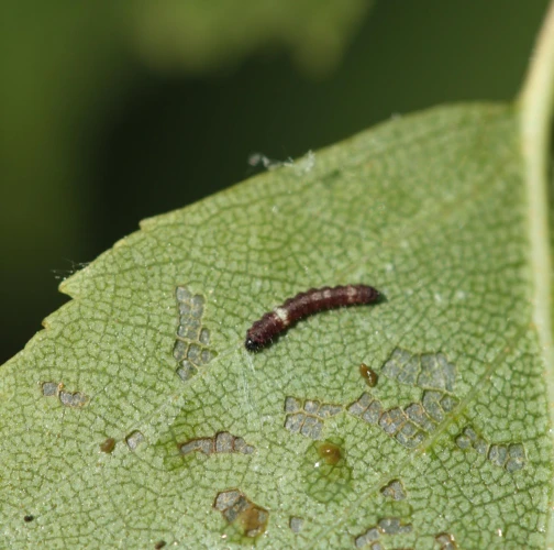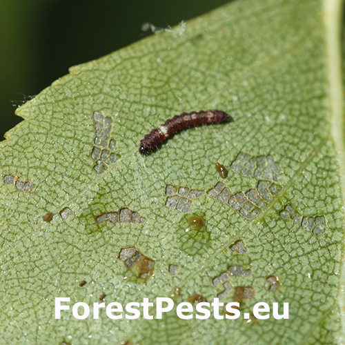 Napadnuté stromy môžu vykazovať stratu listov spôsobenú húsenicami, ktoré sa živia listami, hoci významné poškodenie je zriedkavé. Húsenice sú ľahko rozpoznateľné vďaka svojmu výraznému červenohnedému zafarbeniu na chrbte a typickému vzhľadu.