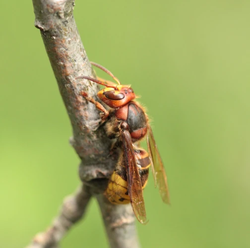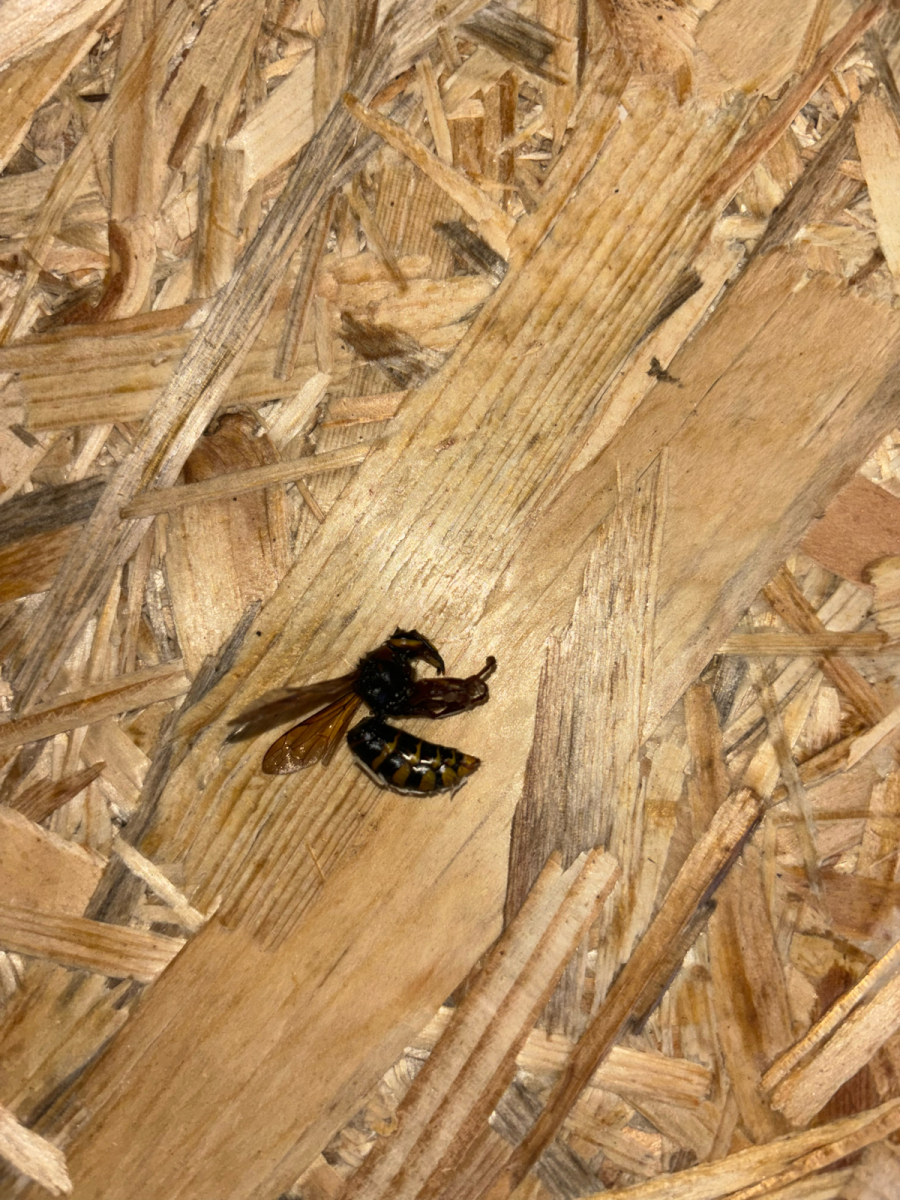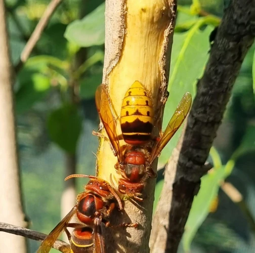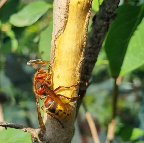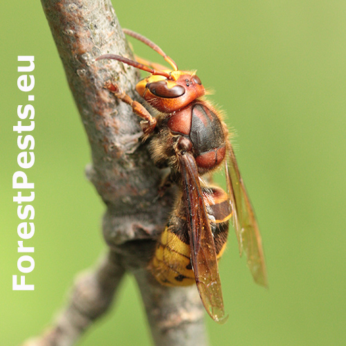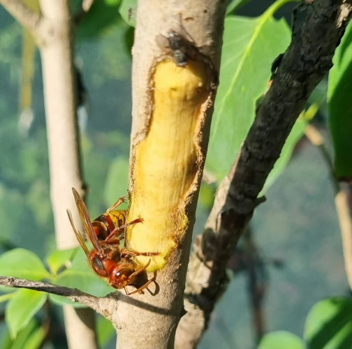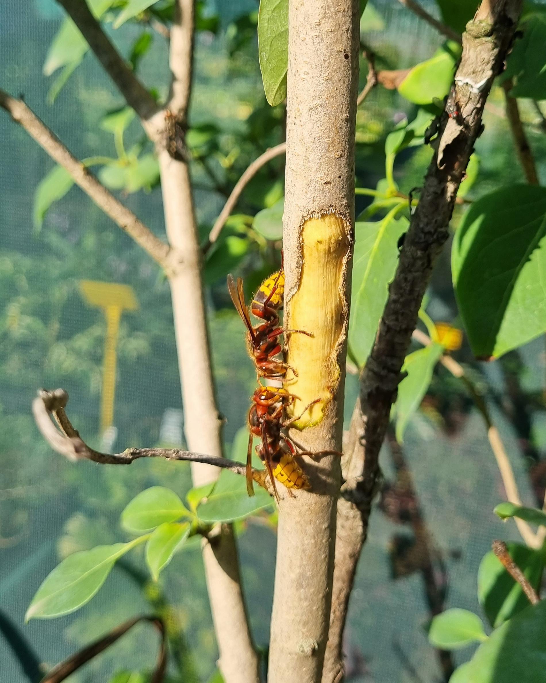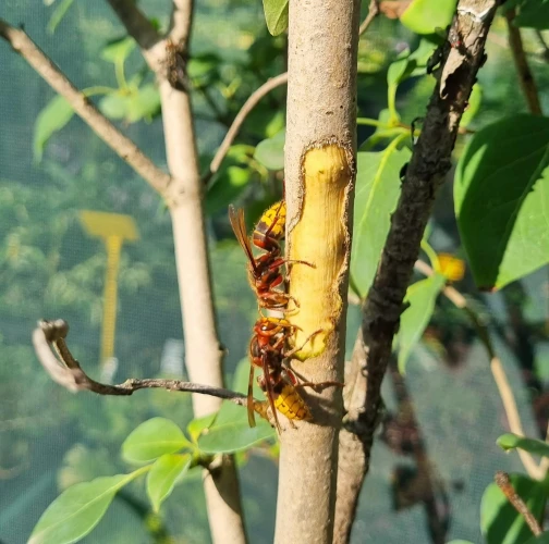 Veľký, ose podobný blanokrídlovec sediaci na vetvičke. Ploché alebo pozdĺžne rany na kôre.
