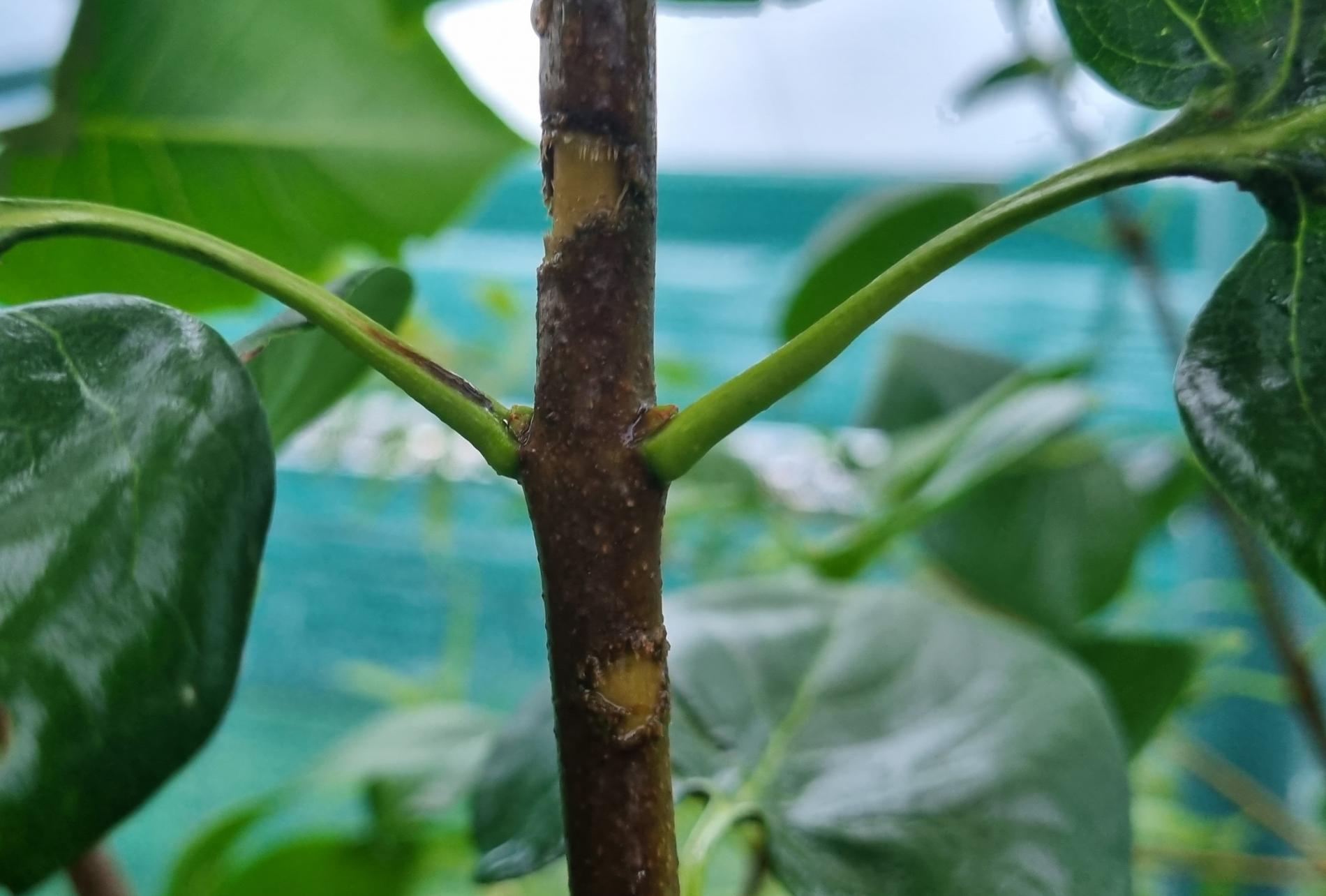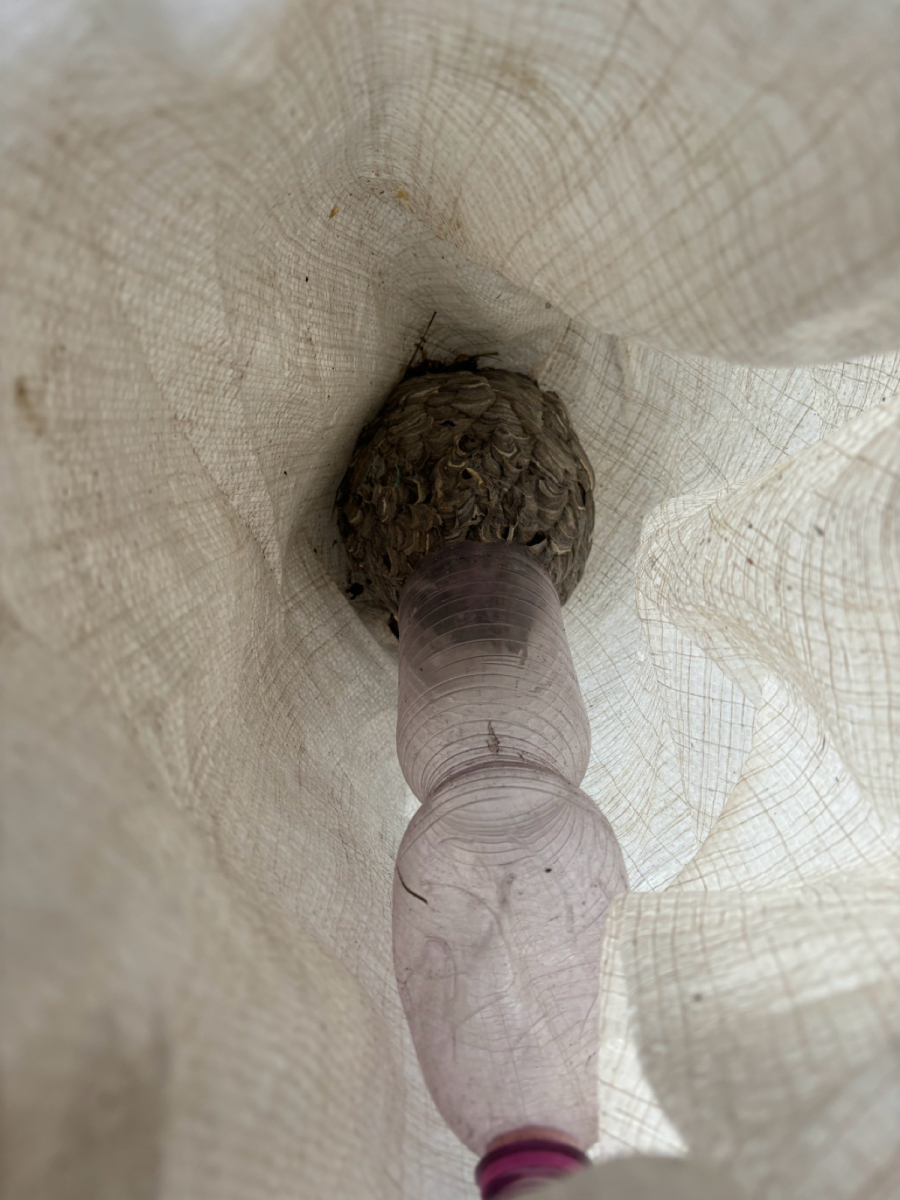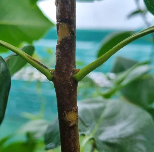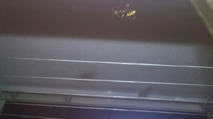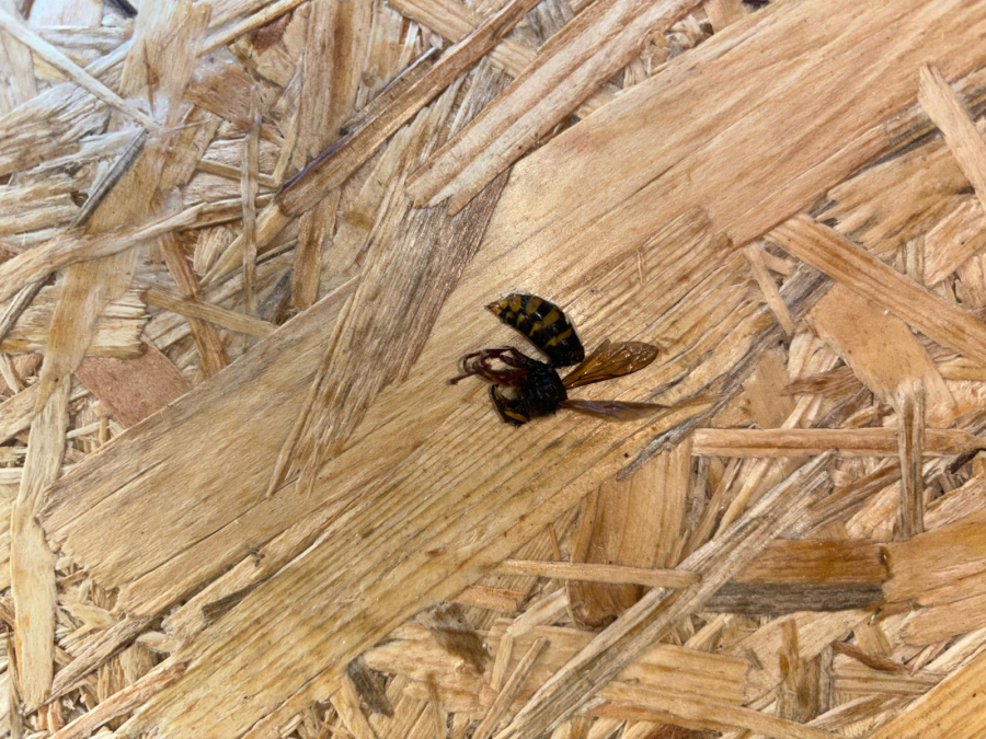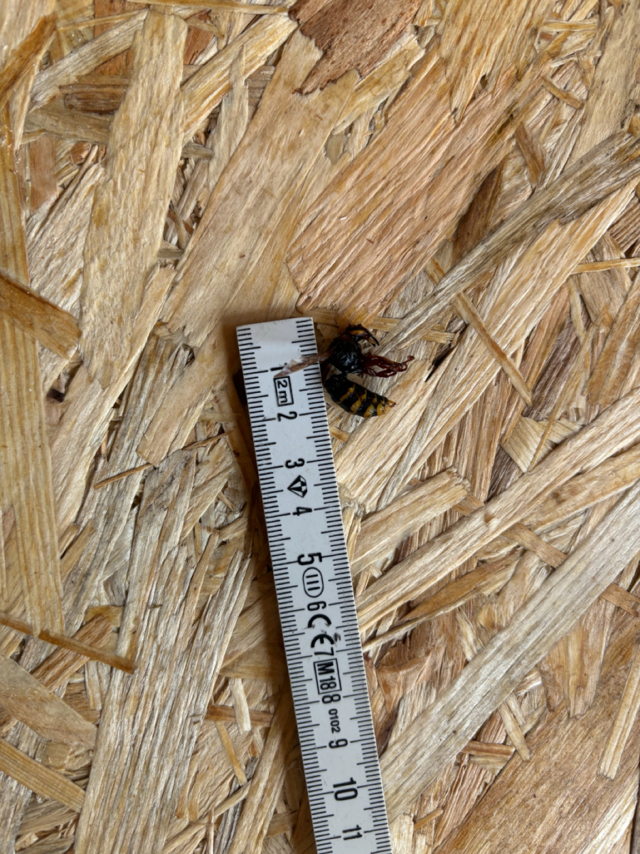 Veľký, ose podobný blanokrídlovec sediaci na vetvičke. Ploché alebo pozdĺžne rany na kôre.