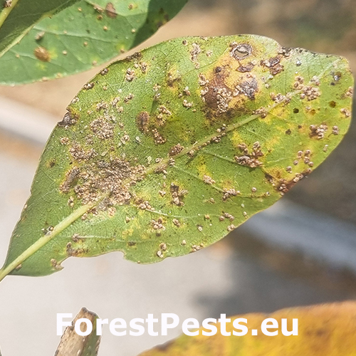 Hnedé, okrúhle alebo oválne štítky na listoch a výhonkoch, často s oranžovým bodom v strede.