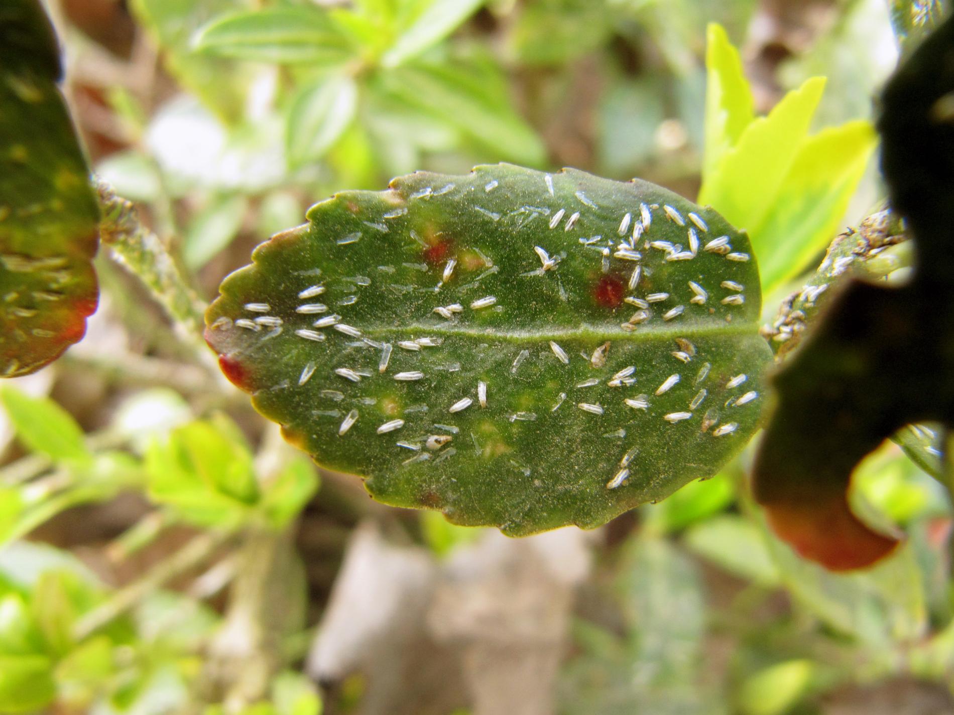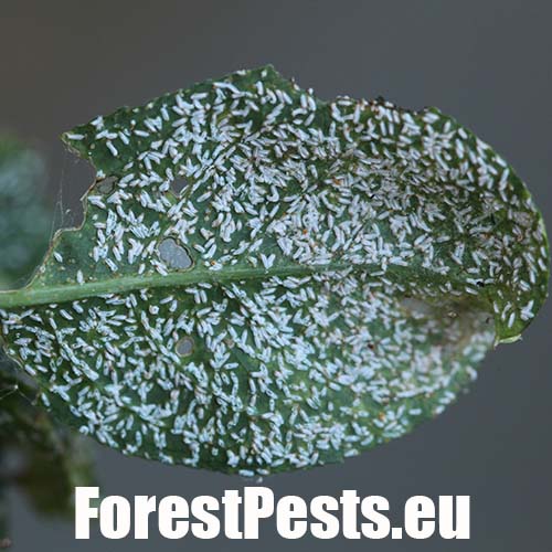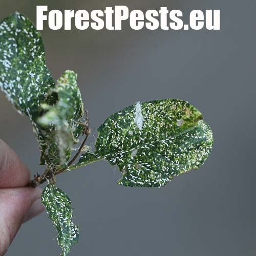 Drobné vetlé bodky, neskôr plošné poškodenie na listoch prejavujúce sa ako žlté až červeno hnedé škvrny. Odumieranie vetiev aj celých kríkov.