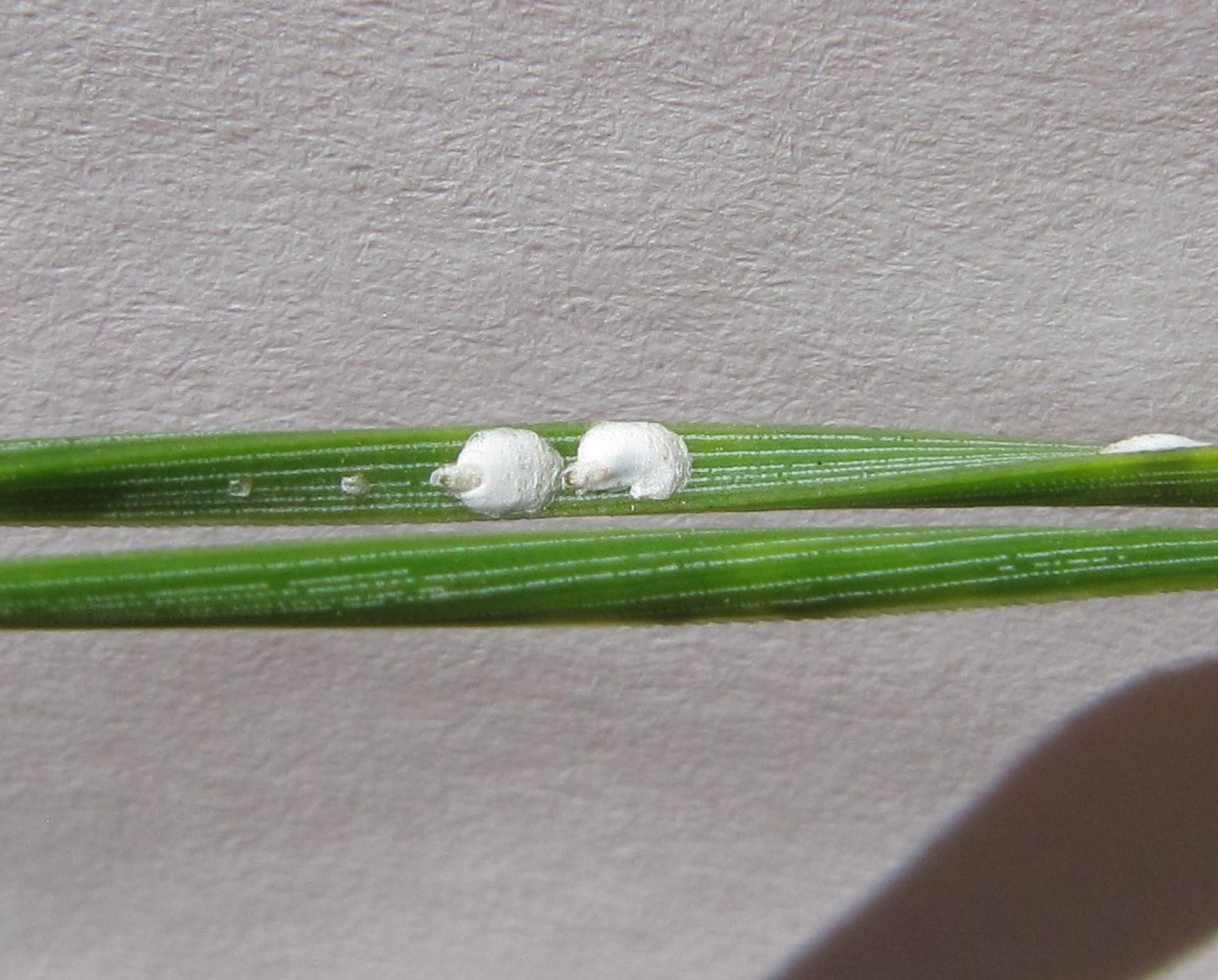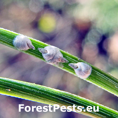 Napadnuté ihlice žltnú, vysychajú a predčasne opadávajú. Na vrchnej strane mladých ihlíc sú viditeľné štítky do veľkosti 2 mm.