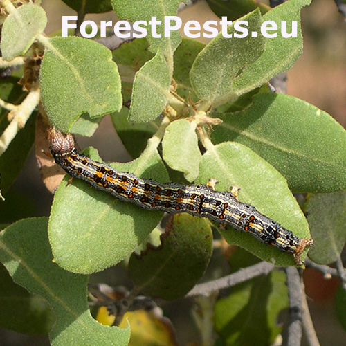 Húsenice sa živia najmä listami Quercus ilex a Q. coccifera, čo môže spôsobiť defoliáciu týchto vždyzelených druhov. Intenzívne napadnutie môže znížiť asimilačnú schopnosť a oslabiť zdravotný stav stromov. Vajcia prezimujú na hostiteľských stromoch, larvy sa liahnu na jar a živia sa až do začiatku leta. Dospelé jedince s rozpätím krídel 54–62 mm lietajú od júla do septembra. Vo väčšine prípadov nespôsobuje tento druh vážne škody, ale vysoká početnosť lariev môže zhoršiť estetický vzhľad a zdravie stromov.