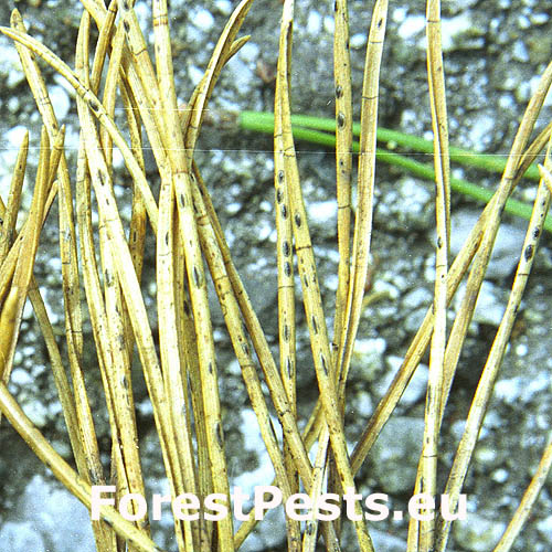 Prvé príznaky infekcie ihlíc sa objavujú už niekedy v septembri. Ide o drobné žltkasté škvrny, ktoré sa časom zväčšujú a hnednú. V priebehu jari a leta (rok po vzniku infekcie) sa na opadnutých ihliciach najprv vytvárajú čierne bodky a pásiky. Typické lodičkovité plodničky sa začínajú vytvárať neskôr v lete. Pre ihlice infikované L. pinastri (Schrad.) Chevall. sú charakteristické aj tenké priečne pásiky vytvorené čiernym mycéliom huby. Na jar infikované ihlice opadávajú.