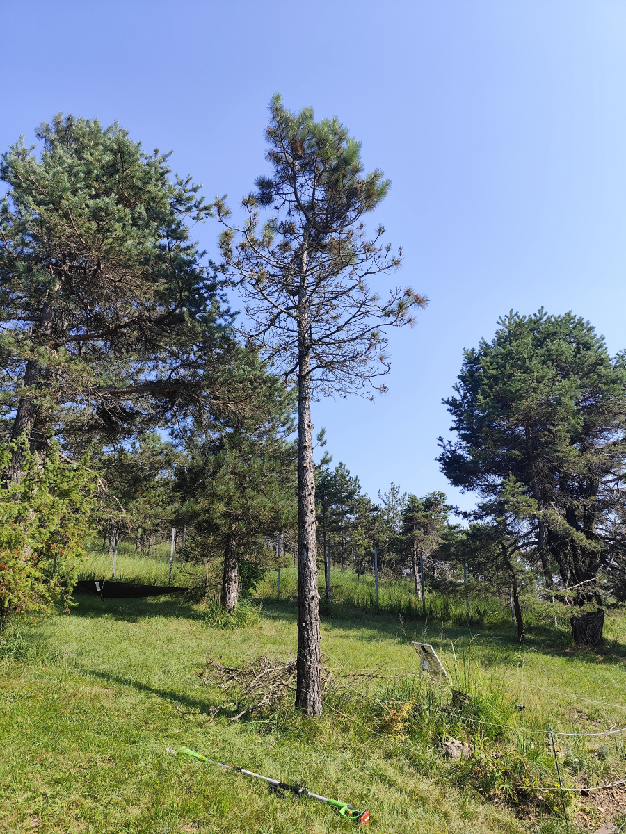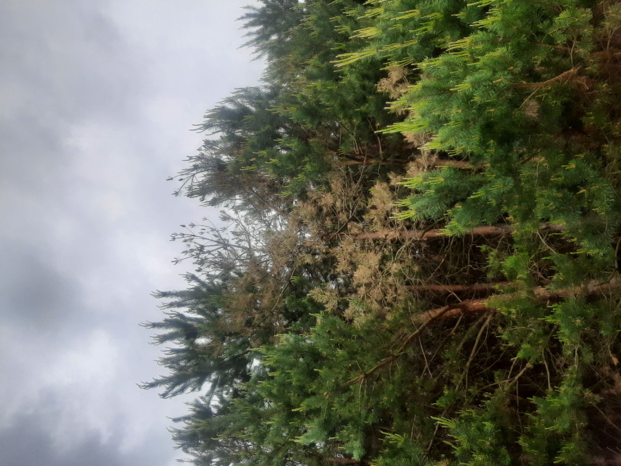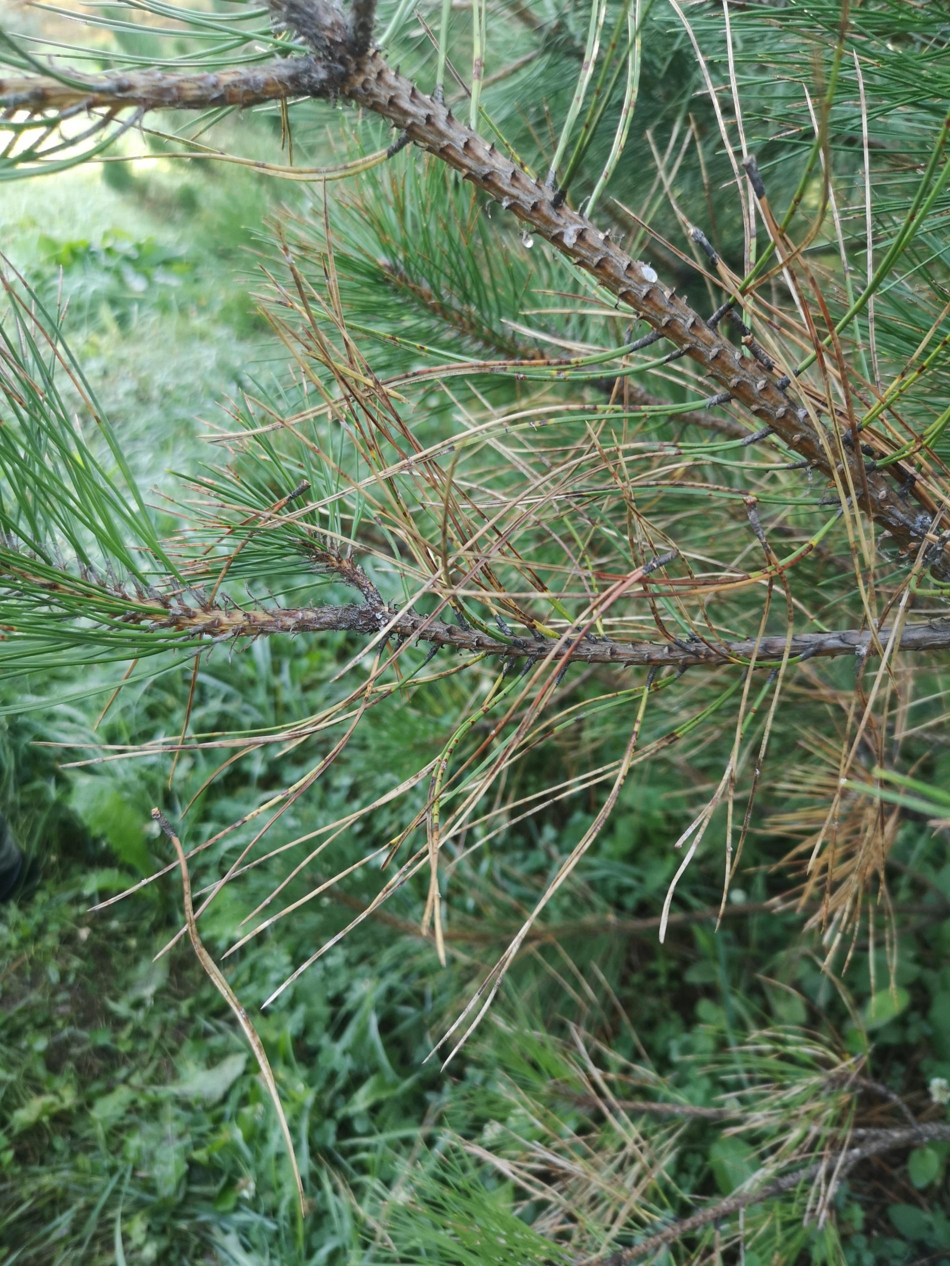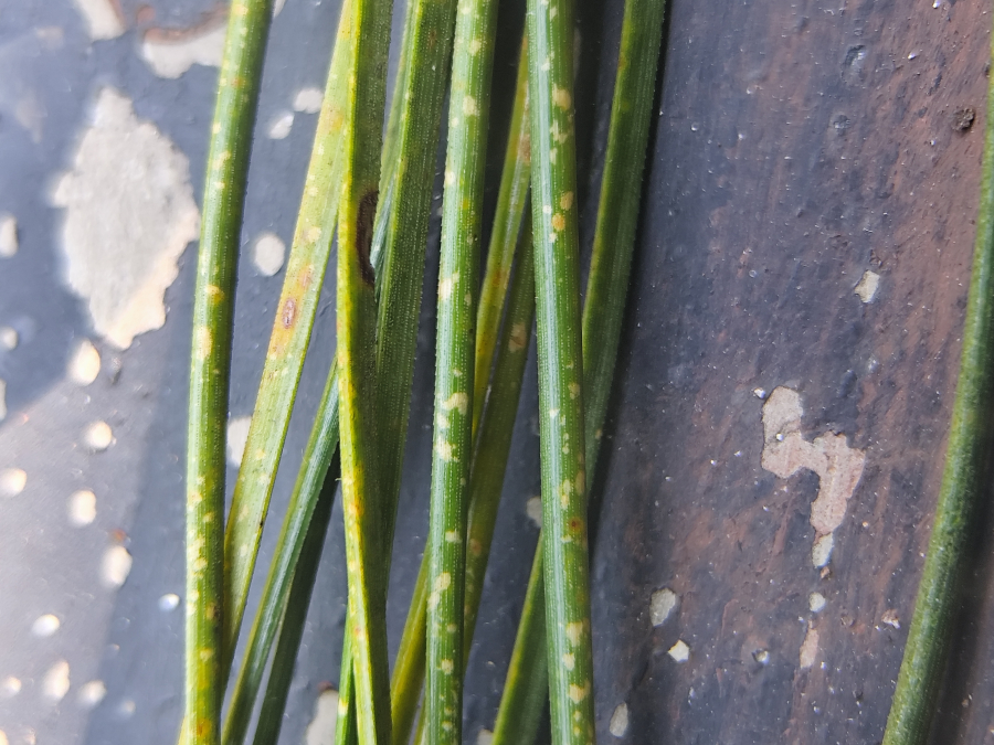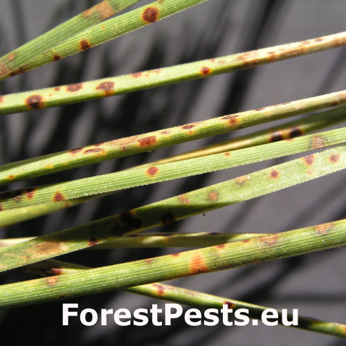 Bledožlté až hnedé škvrny, ktoré pripomínajú aj ranky po cicaní hmyzom na ihliciach.