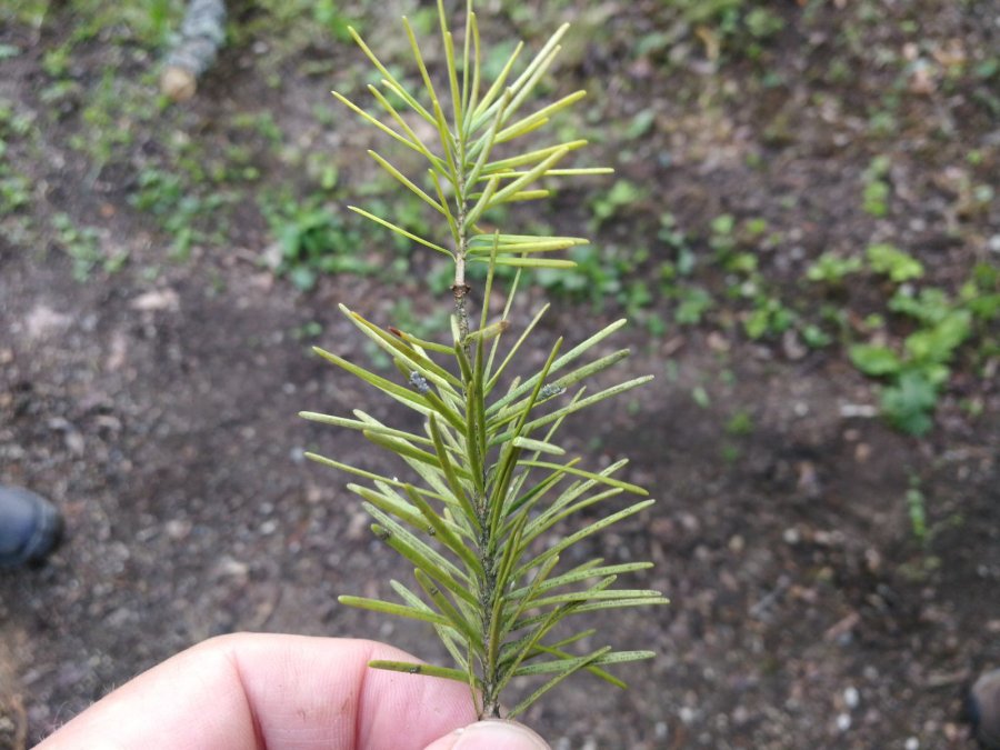 K prvým príznakom patrí tvorba drobných čiernych pykníd na spodnej strane ešte stále zdravo zelených ihlíc v 2 radoch vedľa seba a to až začiatkom jari nasledujúceho roka.