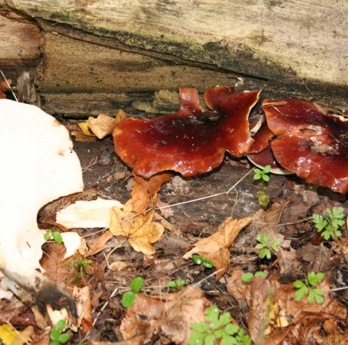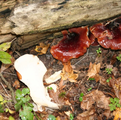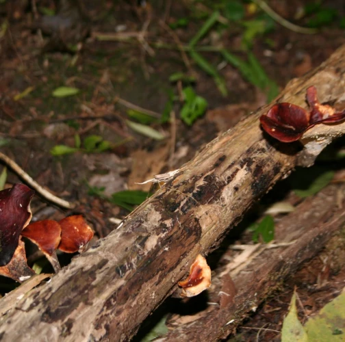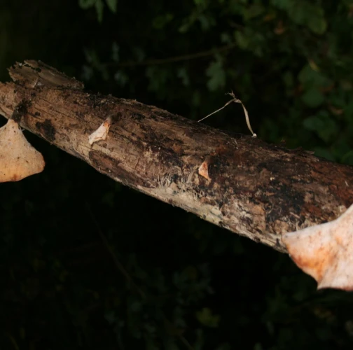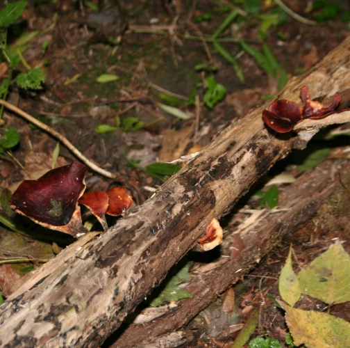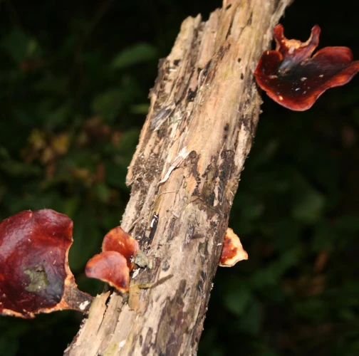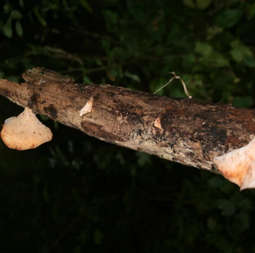 Prítomnosť tmavohnedých až tmavočervených plodníc na odumretom dreve.