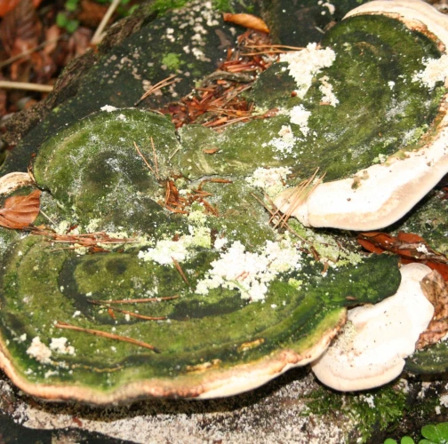Plodnice sú trvalé, 8-15 cm široké, bokom prirastené, polkruhovité. Povrch je plochý, len v mieste prirastania nepatrne vyklenutý s charakteristickým hrbolčekom, riedko pásovaný, mierne ryhovaný a husto ostnato chlpatý. Za mlada je povrch biely, potom sivastý, vplyvom rias aj sivozelený, v starobe takmer čierny. Póry sú podlhovasté. Plodnice sú ľahko napádané a požierané larvami chrobákov, čoho dôkazom sú aj drvinky huby okolo plodnice. Mycélium spôsobuje dosť intenzívnu bielu hnilobu napadnutého dreva.