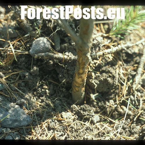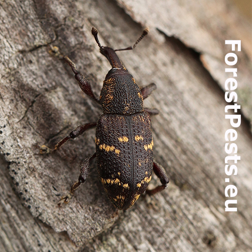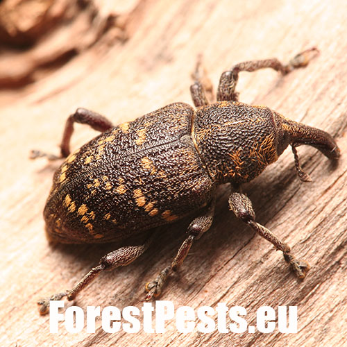 Imágo je  tmavohnedé, so svetlými škvrnkami na krovkách. Je veľké 10 až 14 mm. Hlava je predĺžená do výrazného nosa s tykadlami a ústnym otvorom na jeho konci. Samička kladie vajíčka na korene čerstvých pňov borovice a smreka. Larva je belavá, beznohá, slabo oblúkovito ohnutá, veľká 12 až 23 mm. Žer lariev pod kôrou pňov nie je škodlivý, naopak – urýchľuje ich rozklad. Veľmi nebezpečný je zrelostný žer pohlavne nedospelých imág na sadeniciach ihličnatých drevín, najmä borovíc. Žer imág na kmienkoch je plôškovitý. Imágo ohlodáva kôru tesne nad zemou v hlbokých, lievikovitých jamkách až do bele, čo vyvoláva silný  výron živice. Pri silnom napadnutí poškodzuje celý kmienok a sadenica hynie.