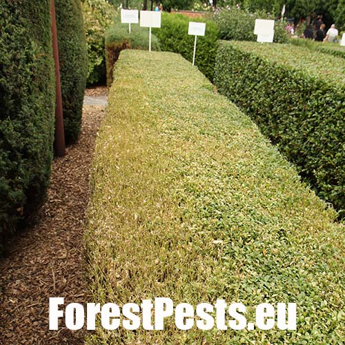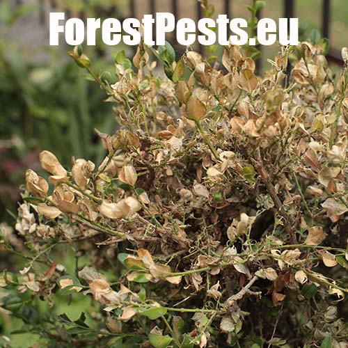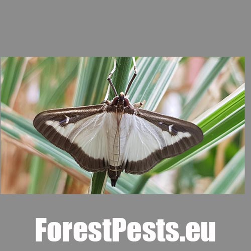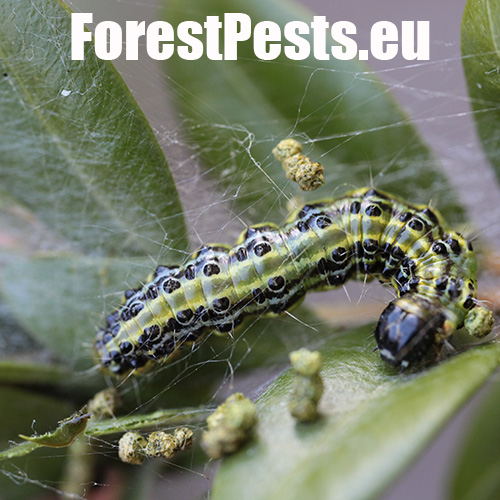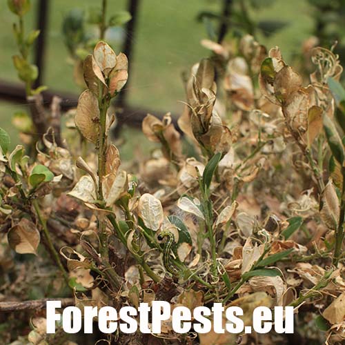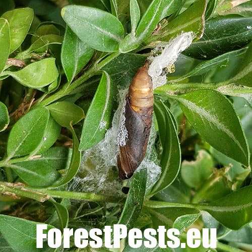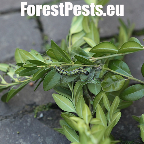 Motýľ s krémovými krídlami a hnedým okrajom. V Európe známy od roku 2007. Prezimuje ako malá húsenica v husom kokóne. Na jar pokračuje v žere. Dorastá až do veľkosti cca 5 cm. Je zelená s pozdĺžnymi hnedými pásmi. Motýľ má v roku viacero generácií. Pri silnejšom napadnutí môžu húsenice zlikvidovať listy celej rastliny, pričom zostane iba žilnatina (skelety) alebo hrubšie stonky. Poškodené listy už nezregenerujú, ale o rok vyrastú nové listy a výhonky. Pri silnom napadnutí dochádza pomerne rýchlo k úhynu krov.