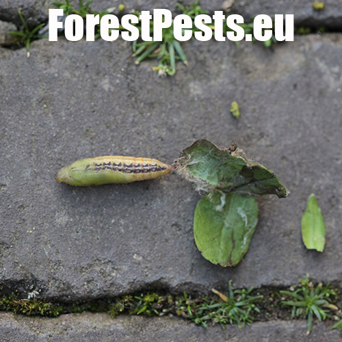 Zelené húsenice na listoch. Hnedé, obžraté listy.