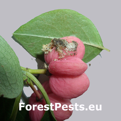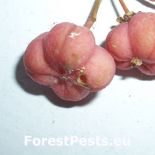 Poškodené plody Euonymus europaeus majú vyžrané vnútro. Na plodoch sa nachádzajú okrúhle dierky a často sú prítomné drobné larvy. Na povrchu plodov sa môže nachádzať trus.