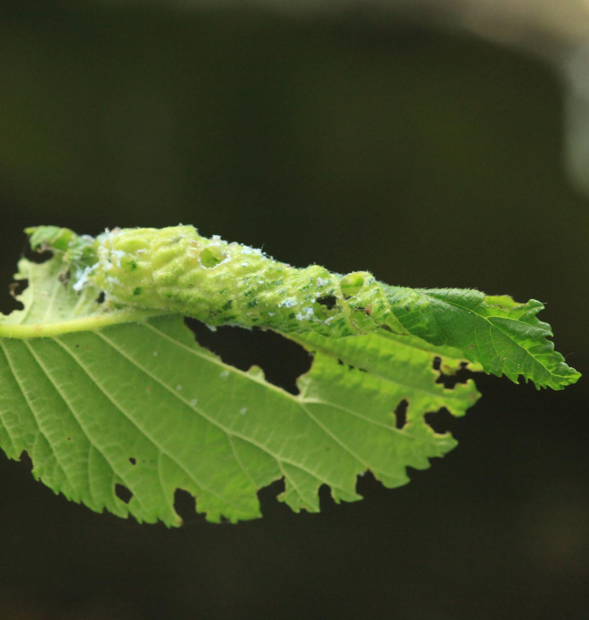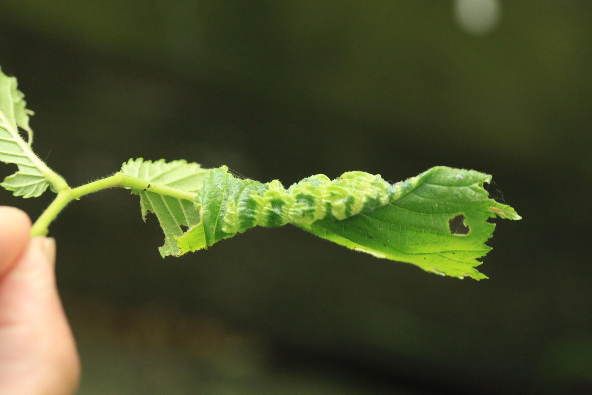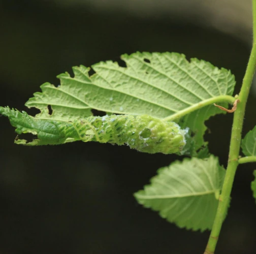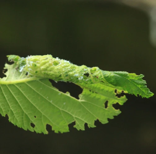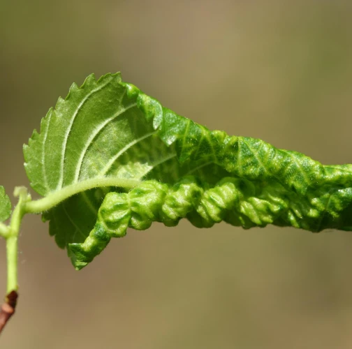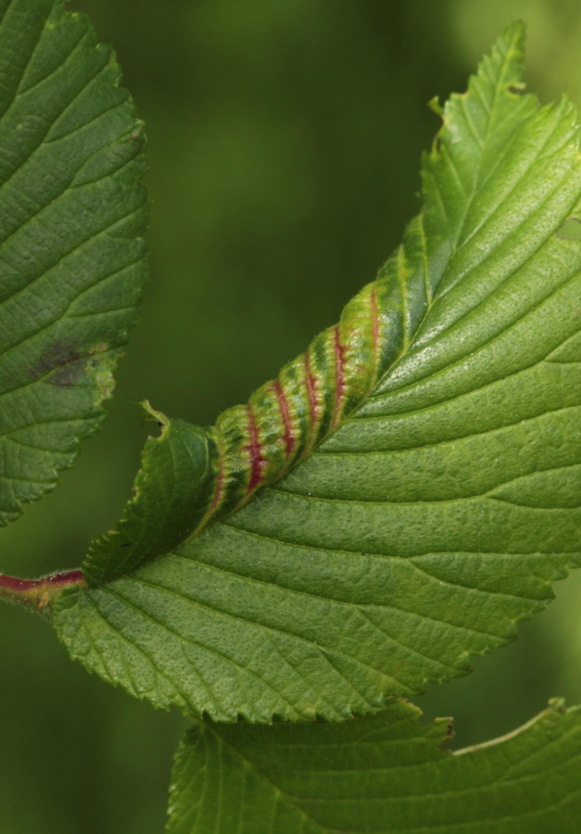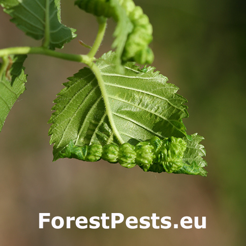 Hálky sú žltkastozelenej alebo ružovkastej farby, a tvoria sa tak, že sa jedna polovica listu zvlní a zroluje dovnútra, čím sa vytvorí rúrkovitý vak. Na jar a začiatkom leta žijú vo vaku početné vošky, ktoré sú zvyčajne hnedasté až matne zelené a pokryté voskom.