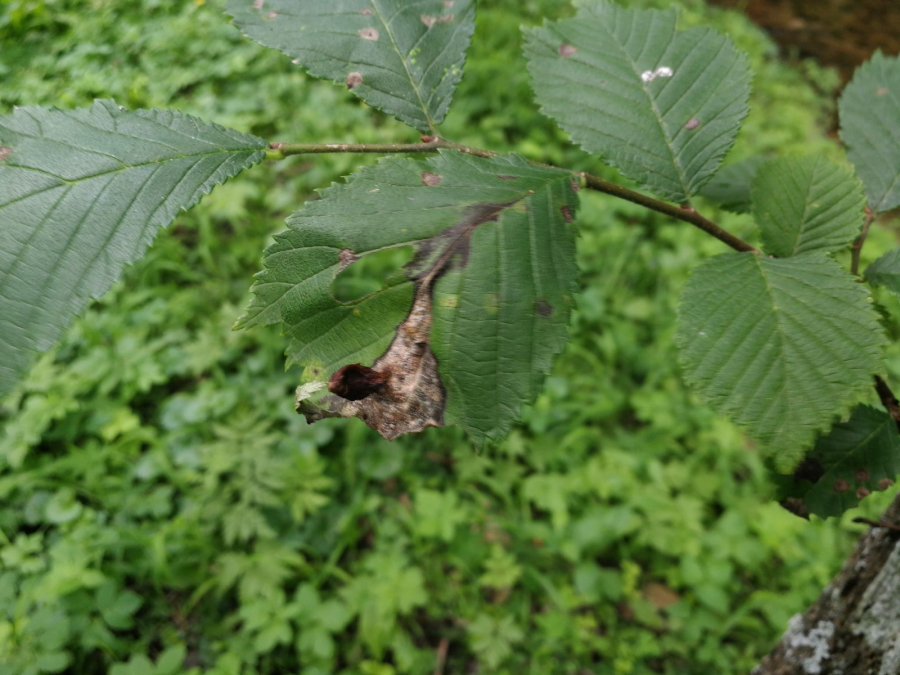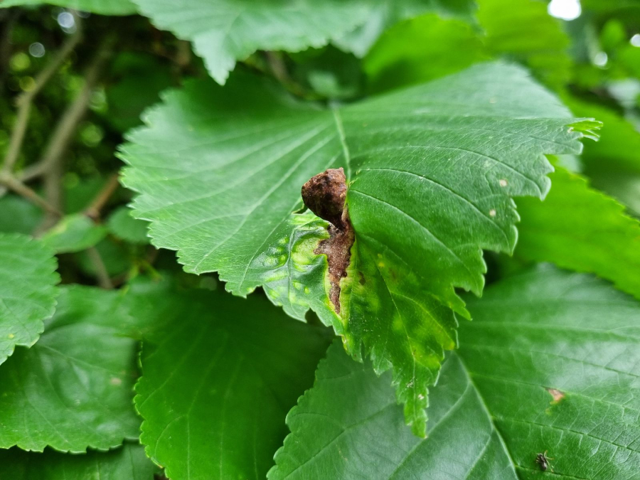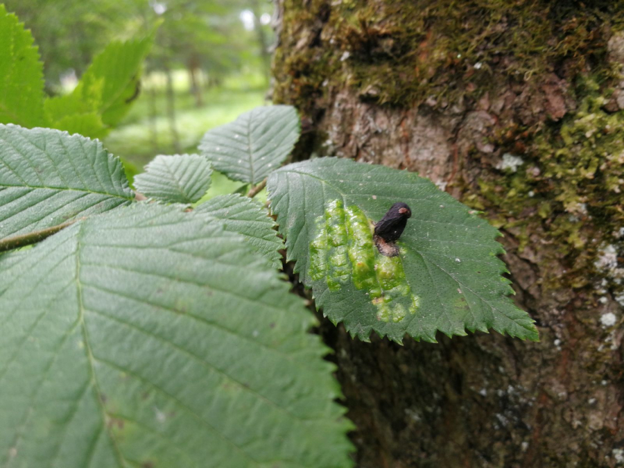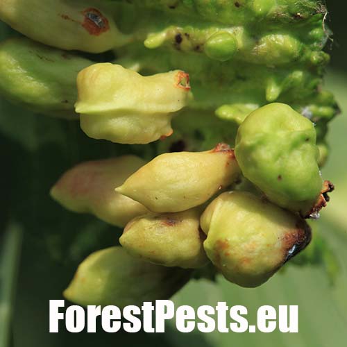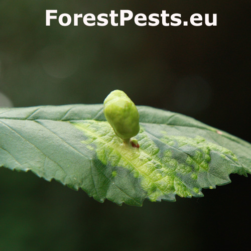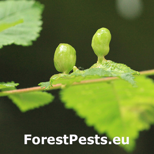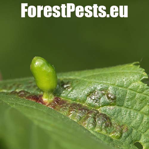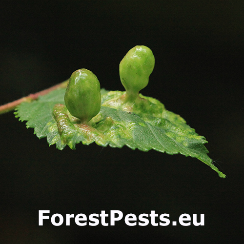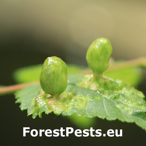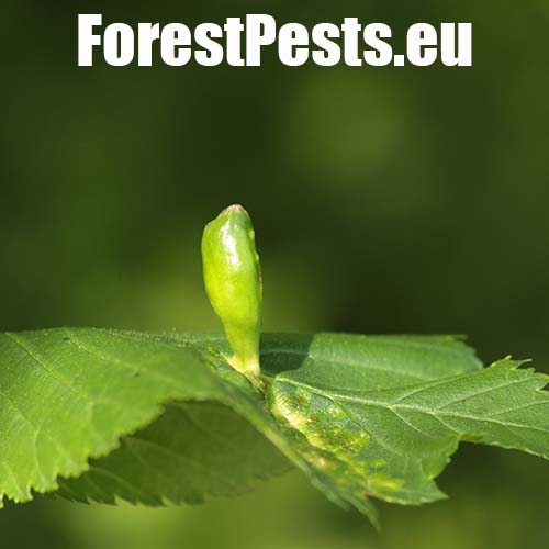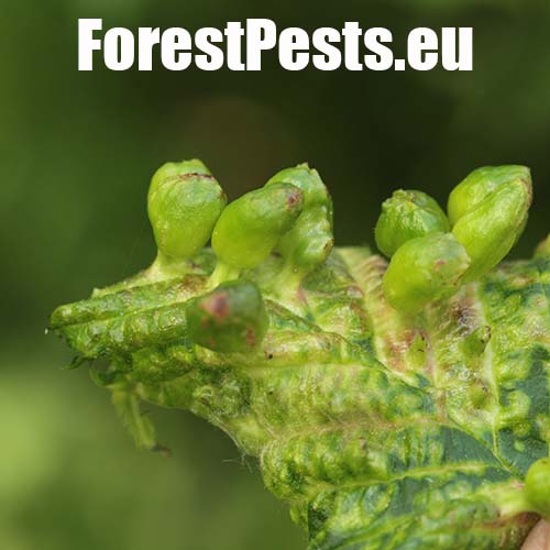 Na vrchnej strane listu sa vyskytujú vreckaté hálky veľkosti do 2 cm. Na mieste dotyku s listom sa zužujú. Hálky nie sú ochlpené.