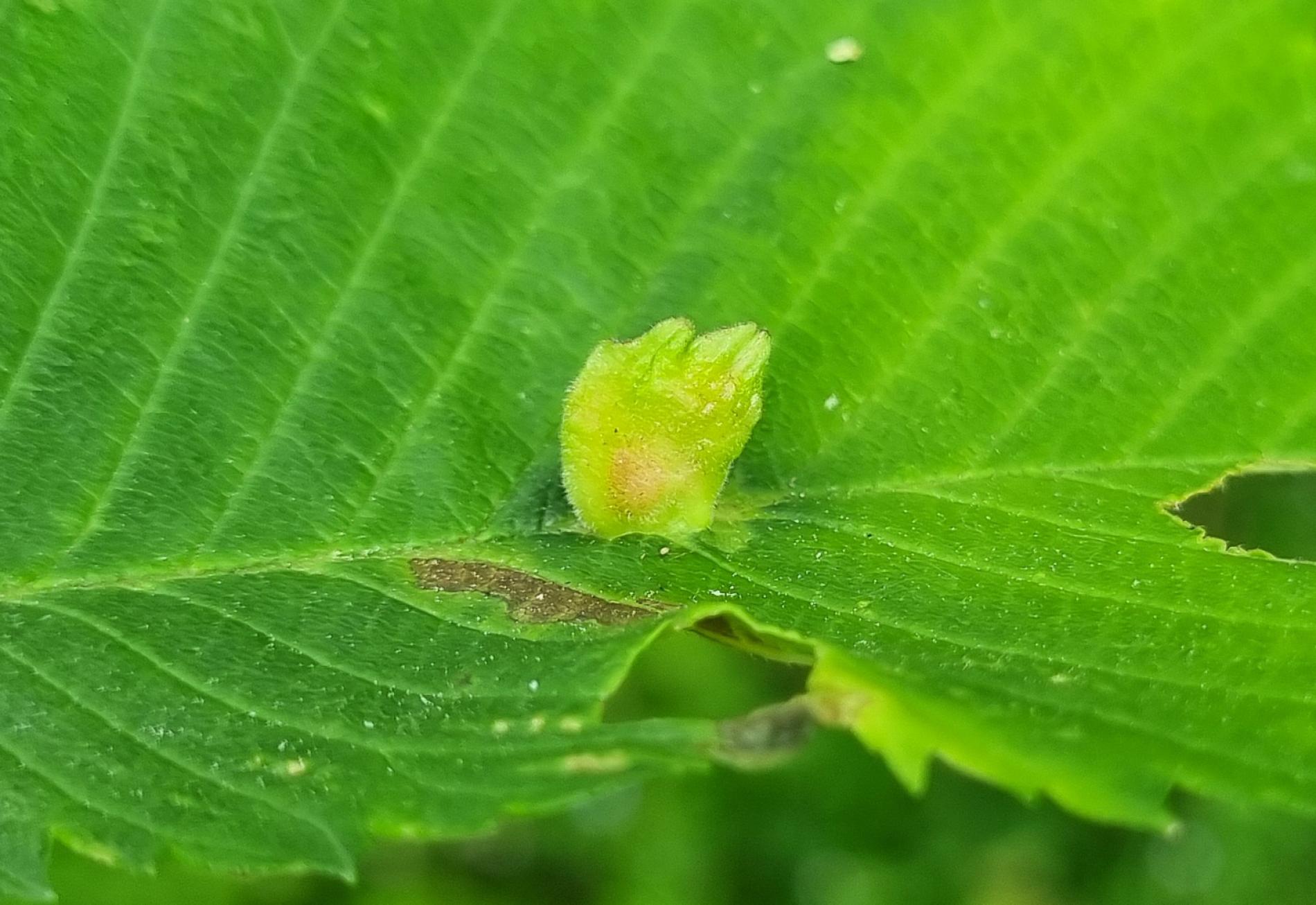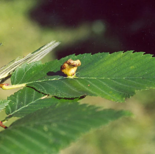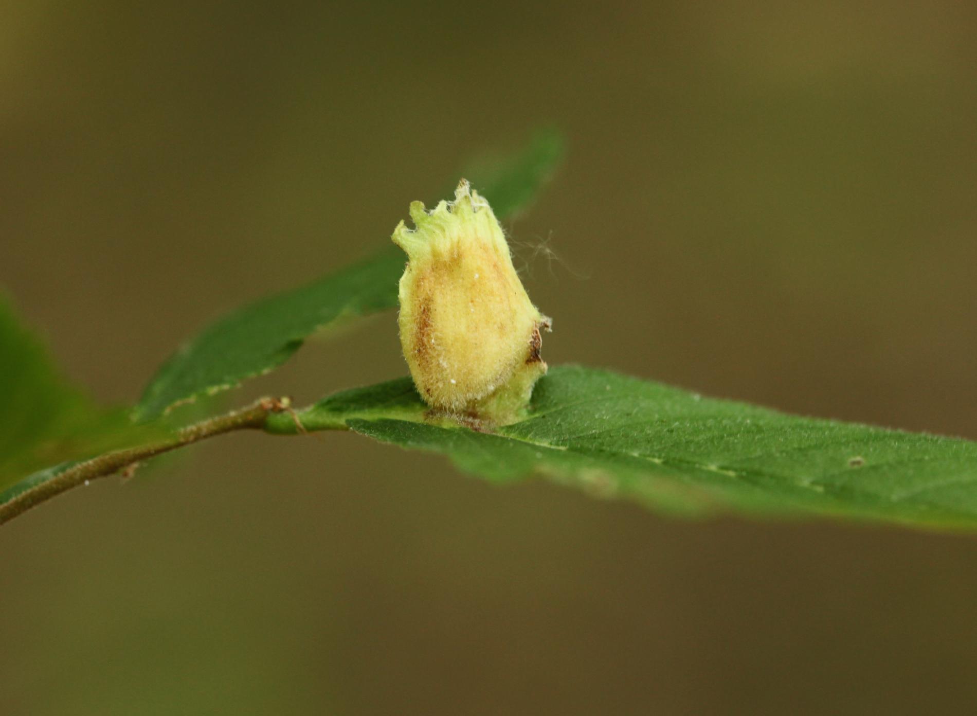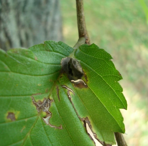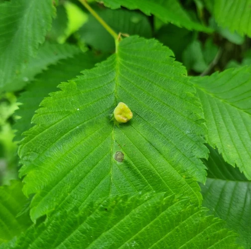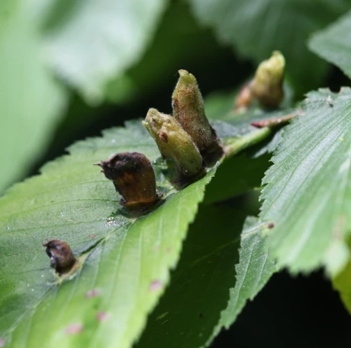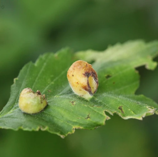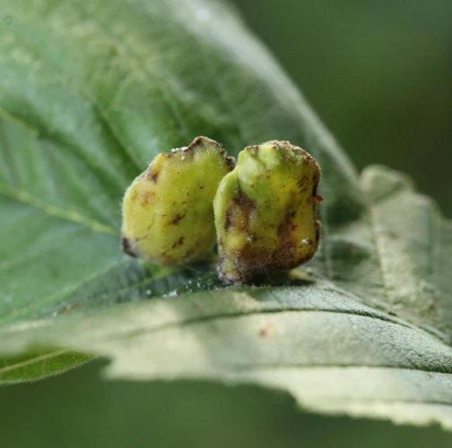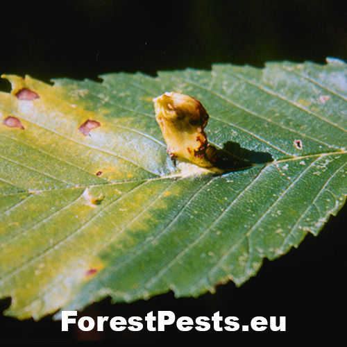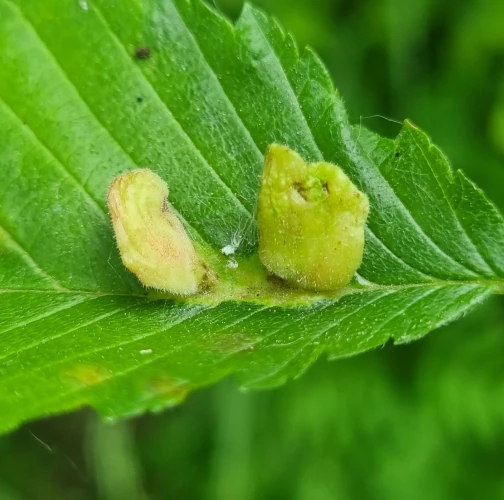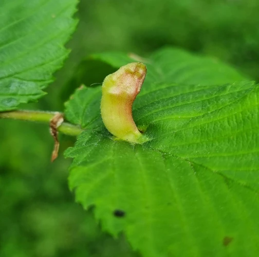 Na vrchnej strane listu – vždy na širšej strane čepele – sa nachádza mechúrikovitý výrastok vysoký cca 1 – 2 cm. Hálka je svetlozelená na okrajoch môže byť červená. Vyskytuje sa väčšinou jednotlivo. Vo vnútri sa nachádzajú vošky v rôznom štádiu vývoja.