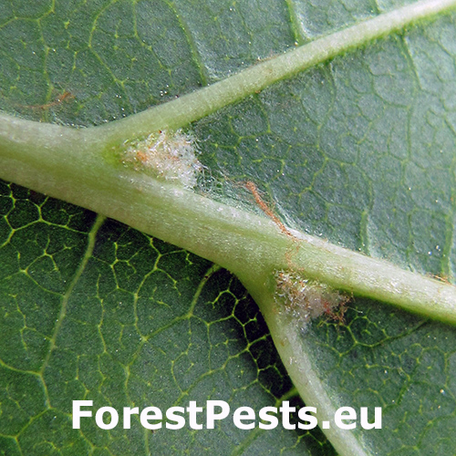 Prítomnosť bielych až hnedých chumáčov chĺpkov (erínií) pozdĺž žilnatiny na spodnej strane listov pagaštanu konského.