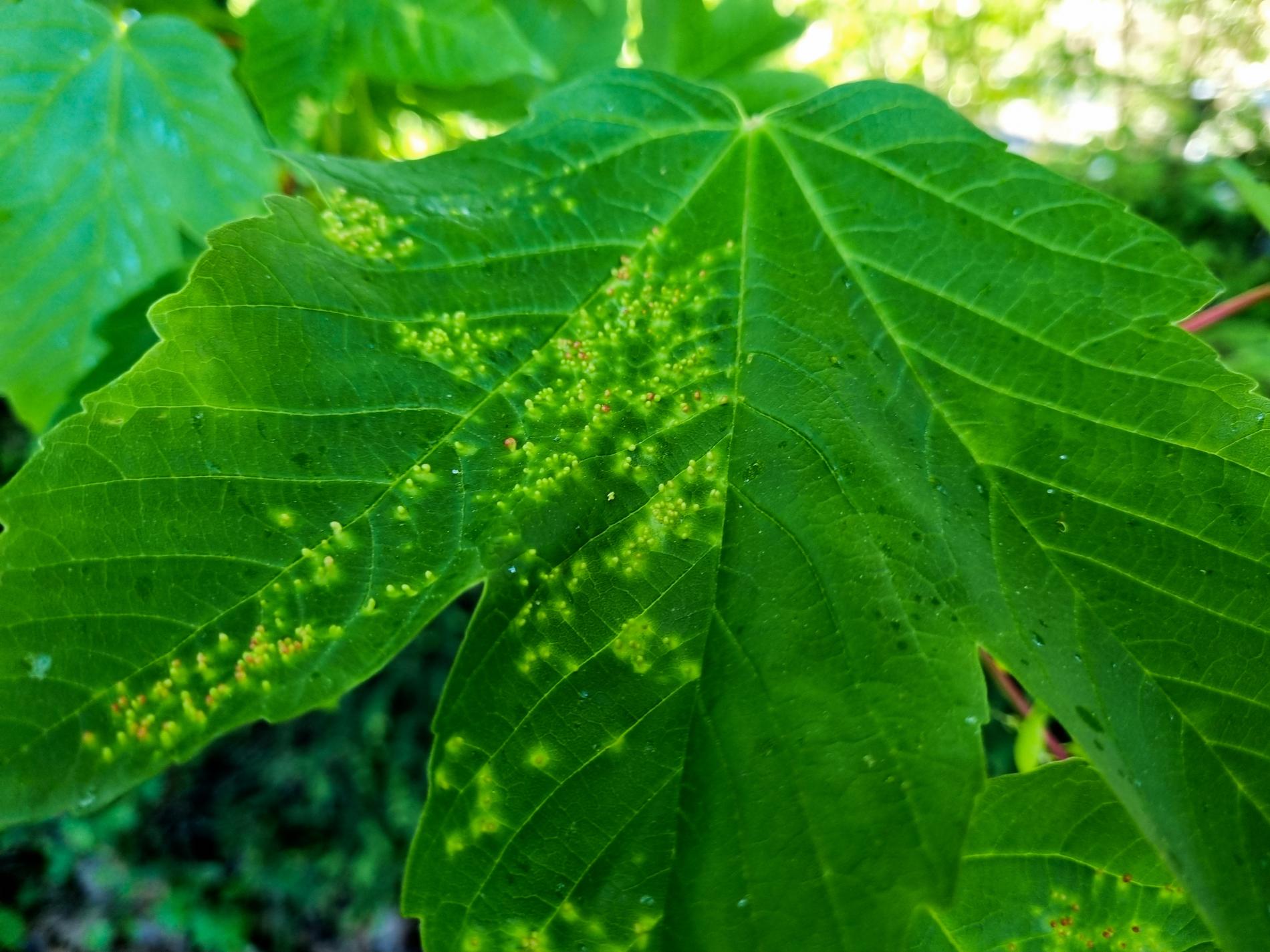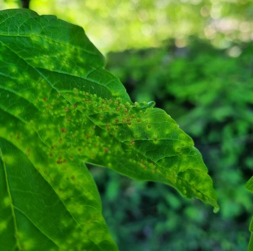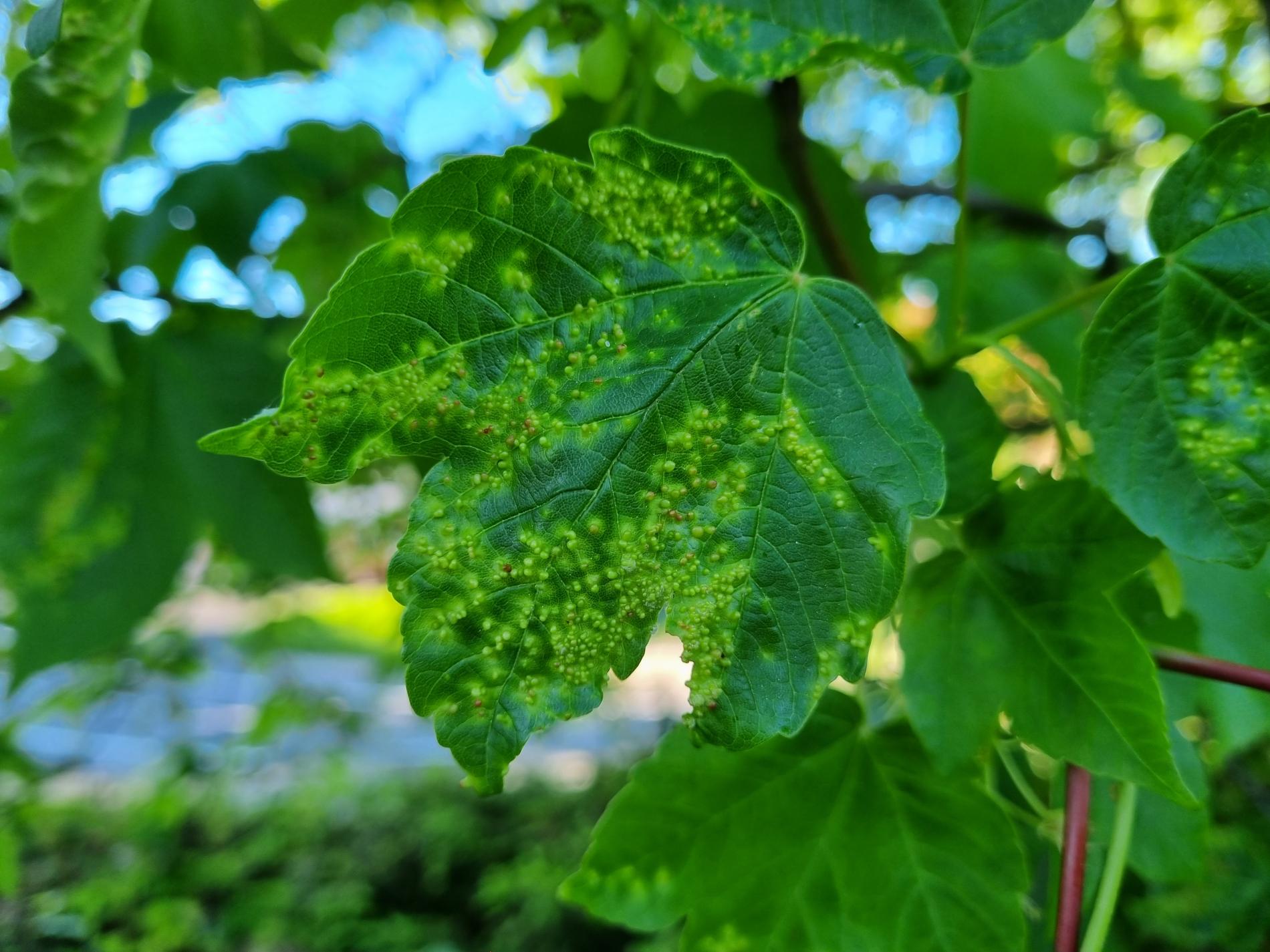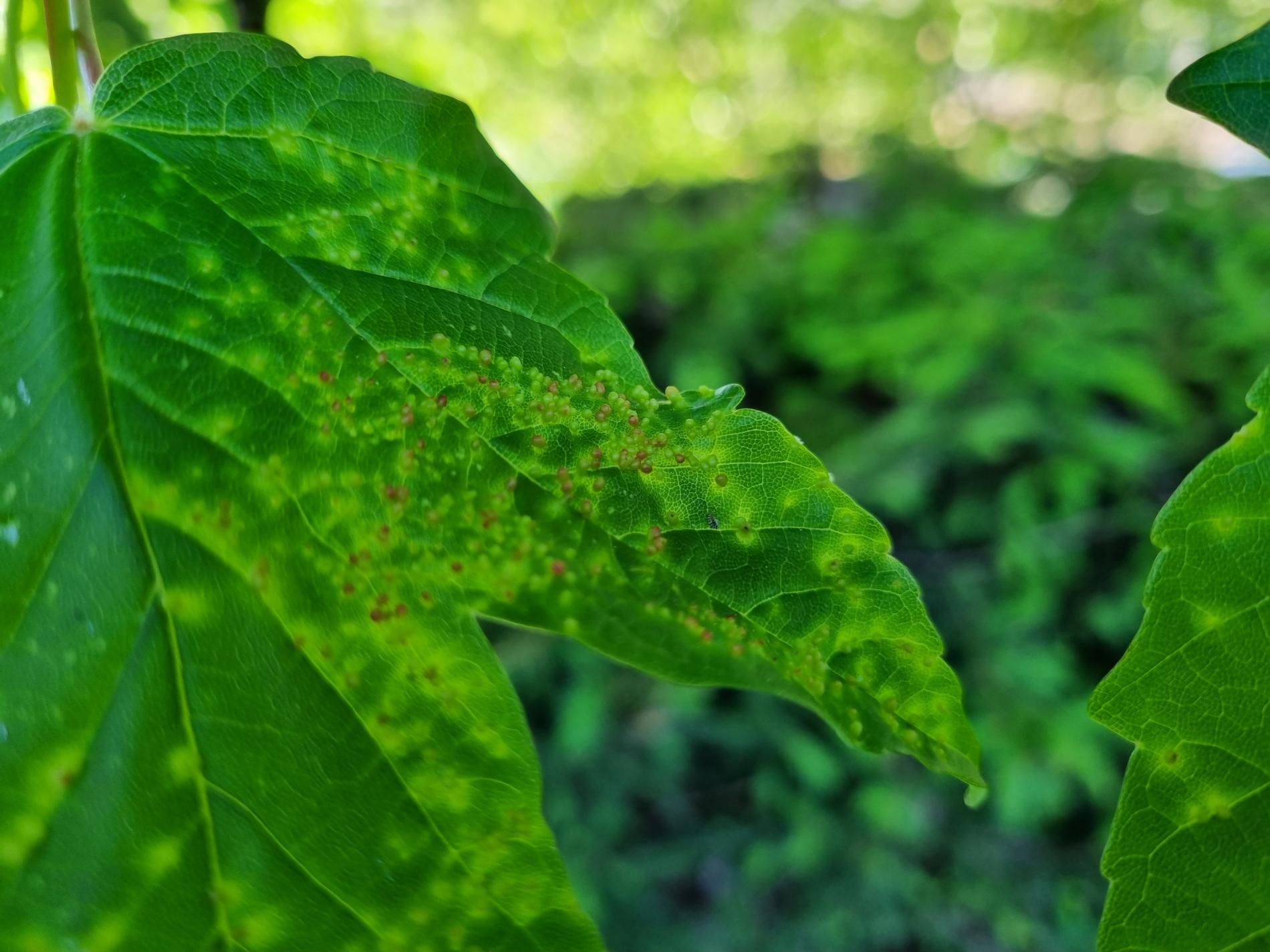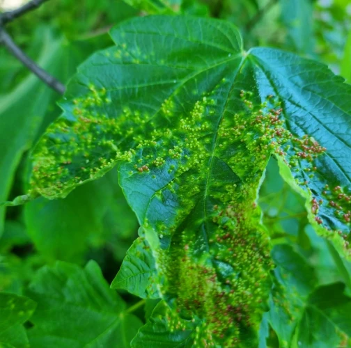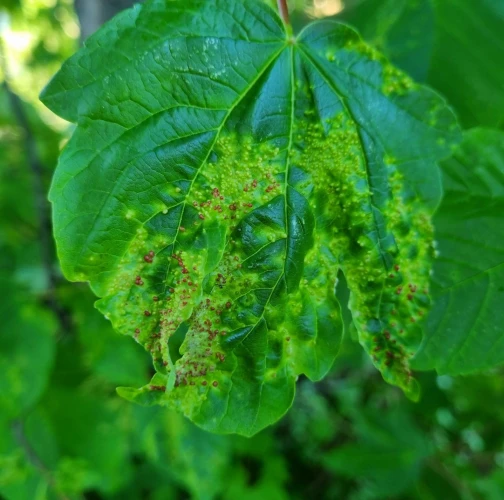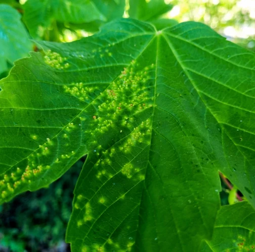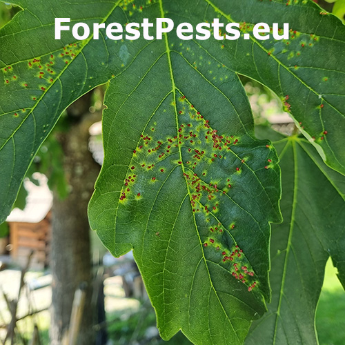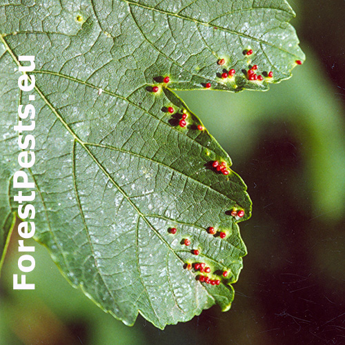 Hrčky sú malé, veľké len 1-2 mm a sú často vo veľkom počte na vrchnej strane listu. Žlto zelené, často červené.