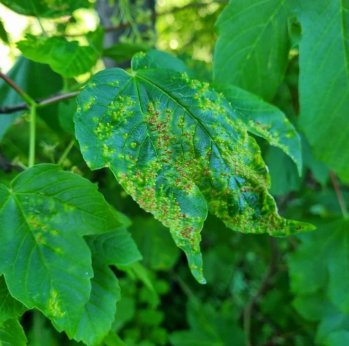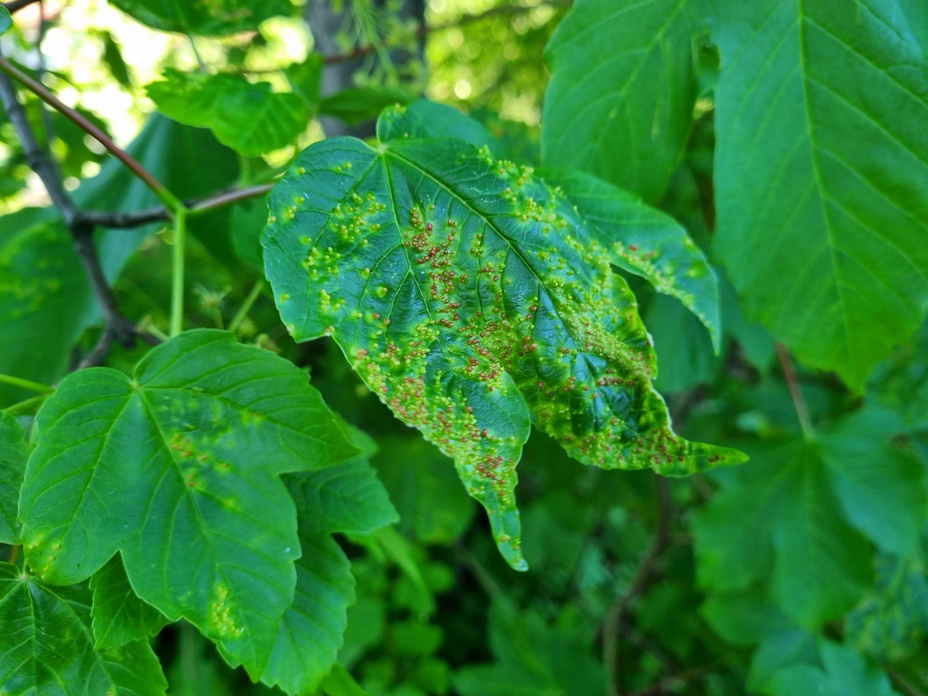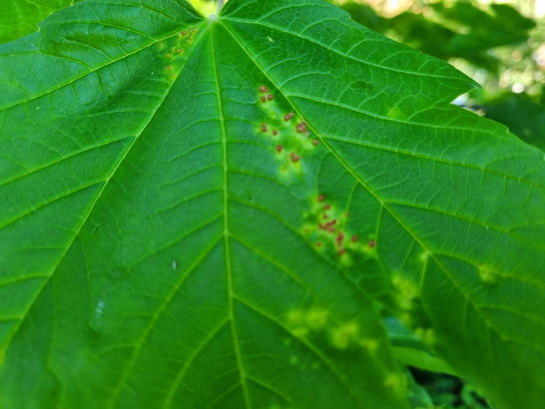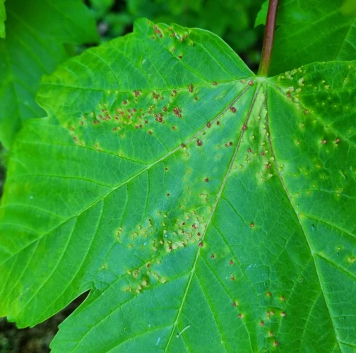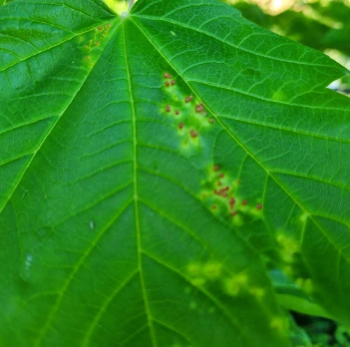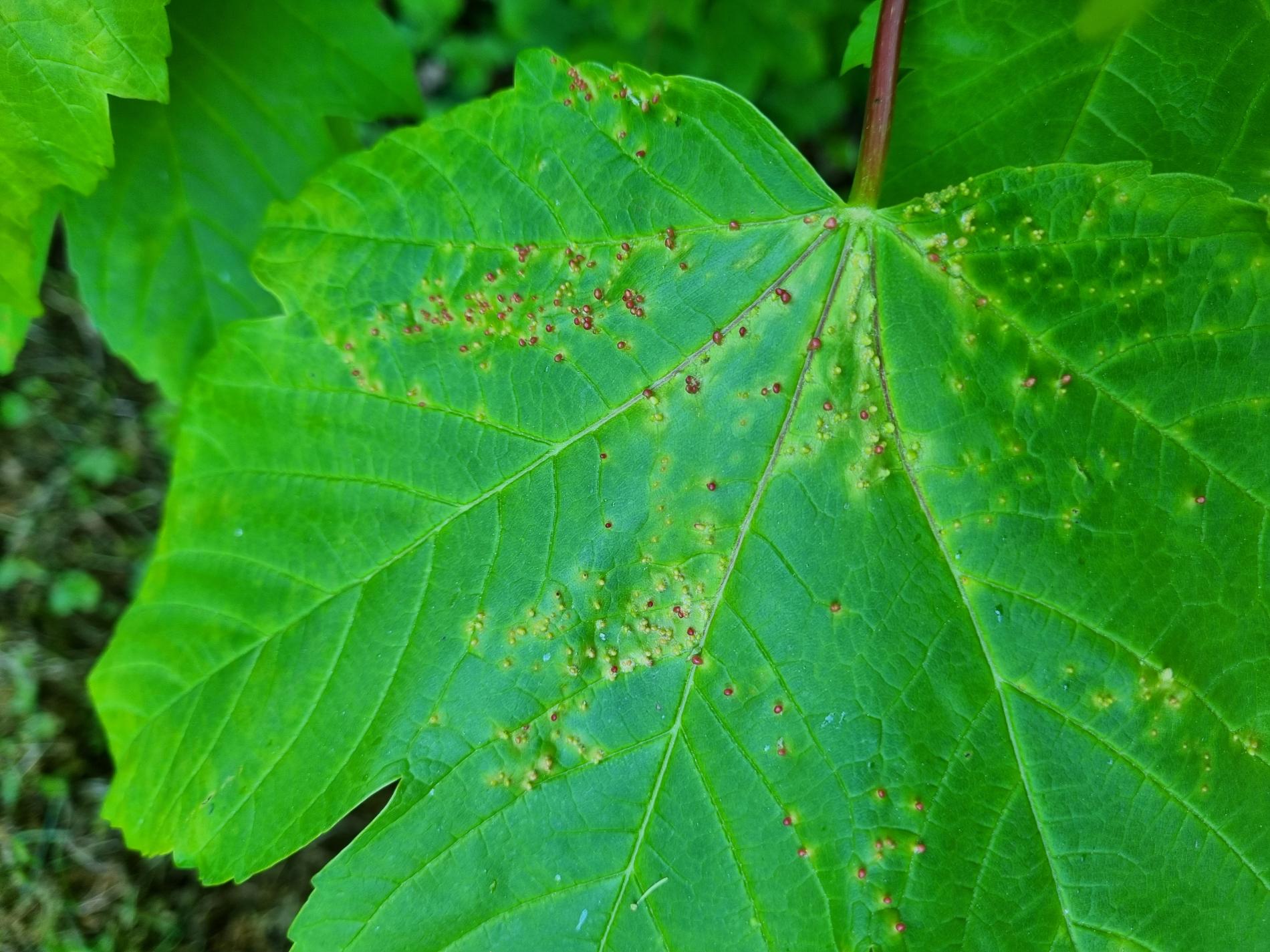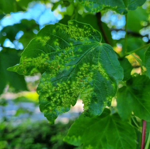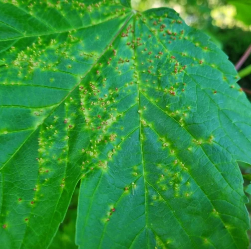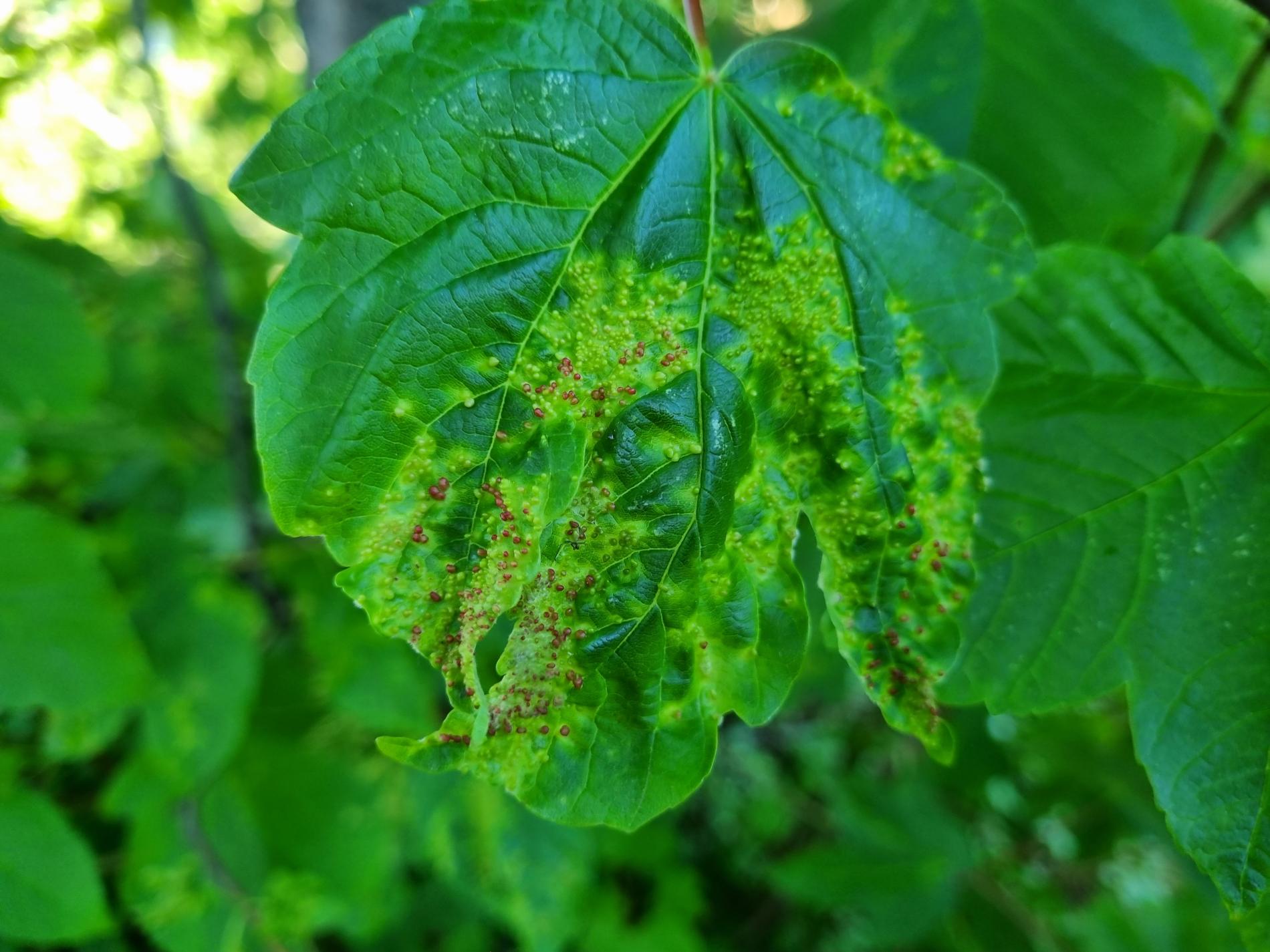 Hrčky sú malé, veľké len 1-2 mm a sú často vo veľkom počte na vrchnej strane listu. Žlto zelené, často červené.