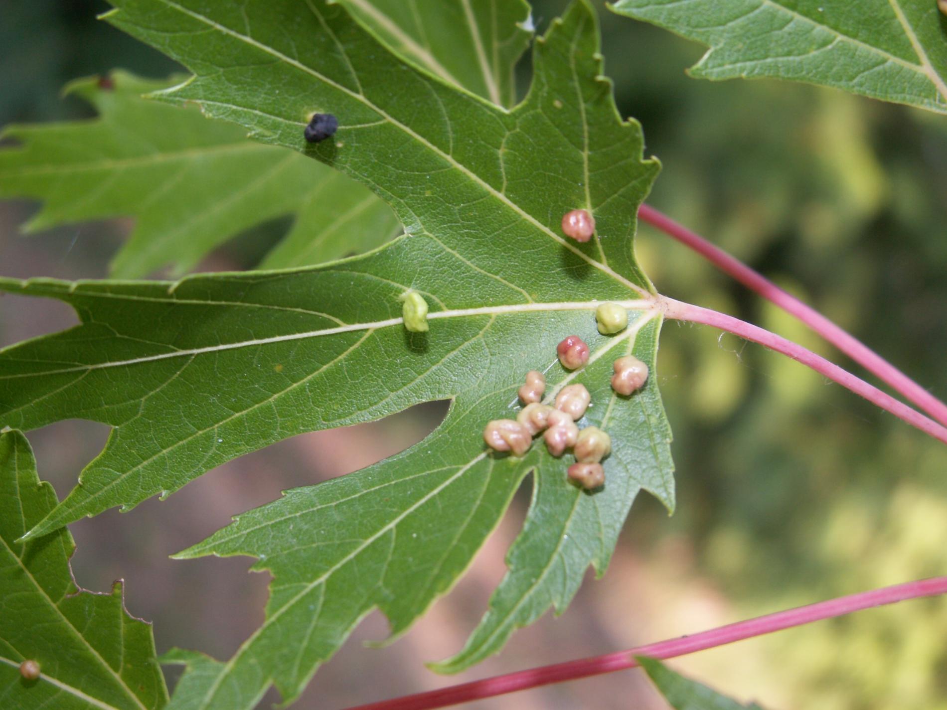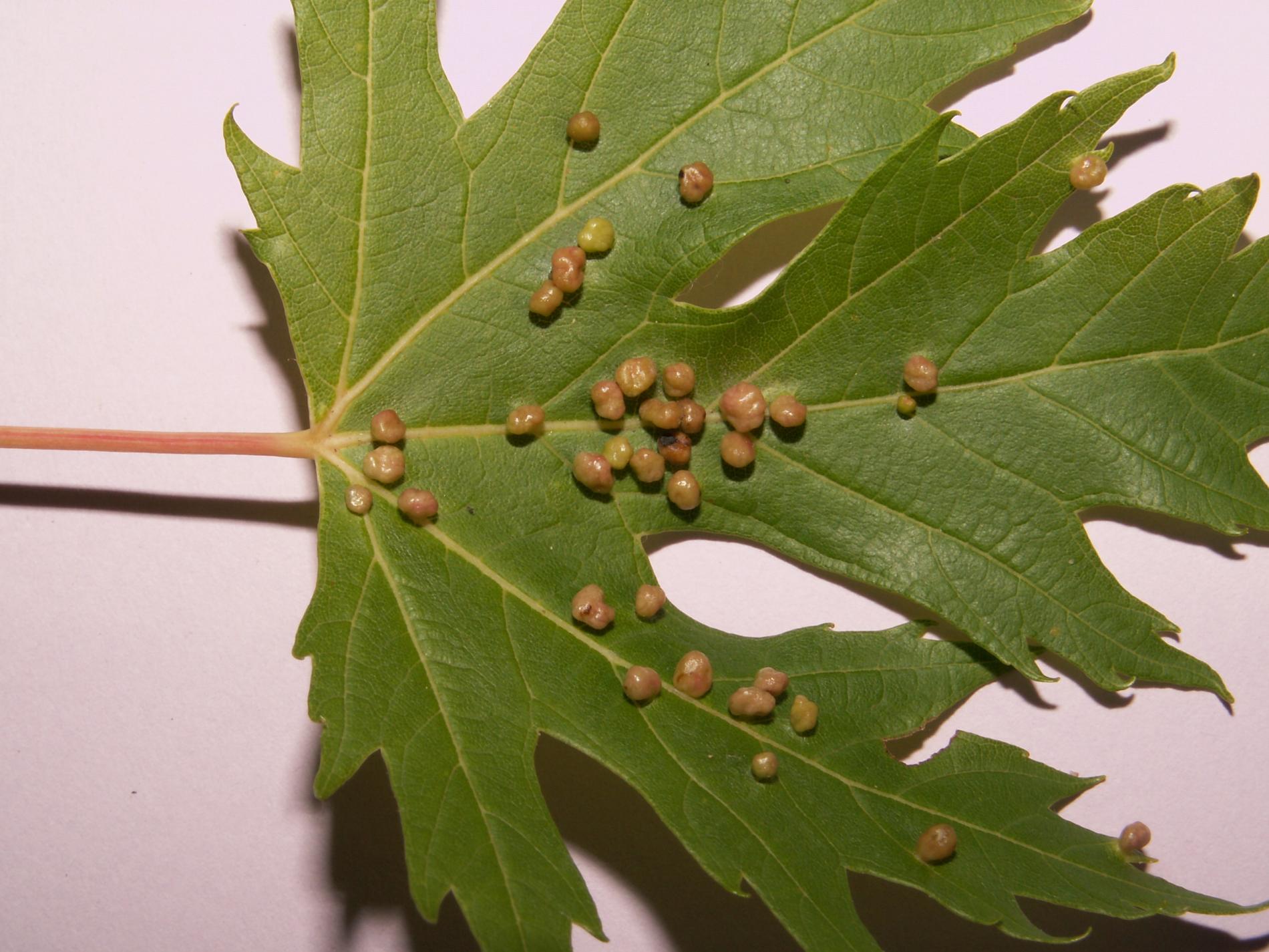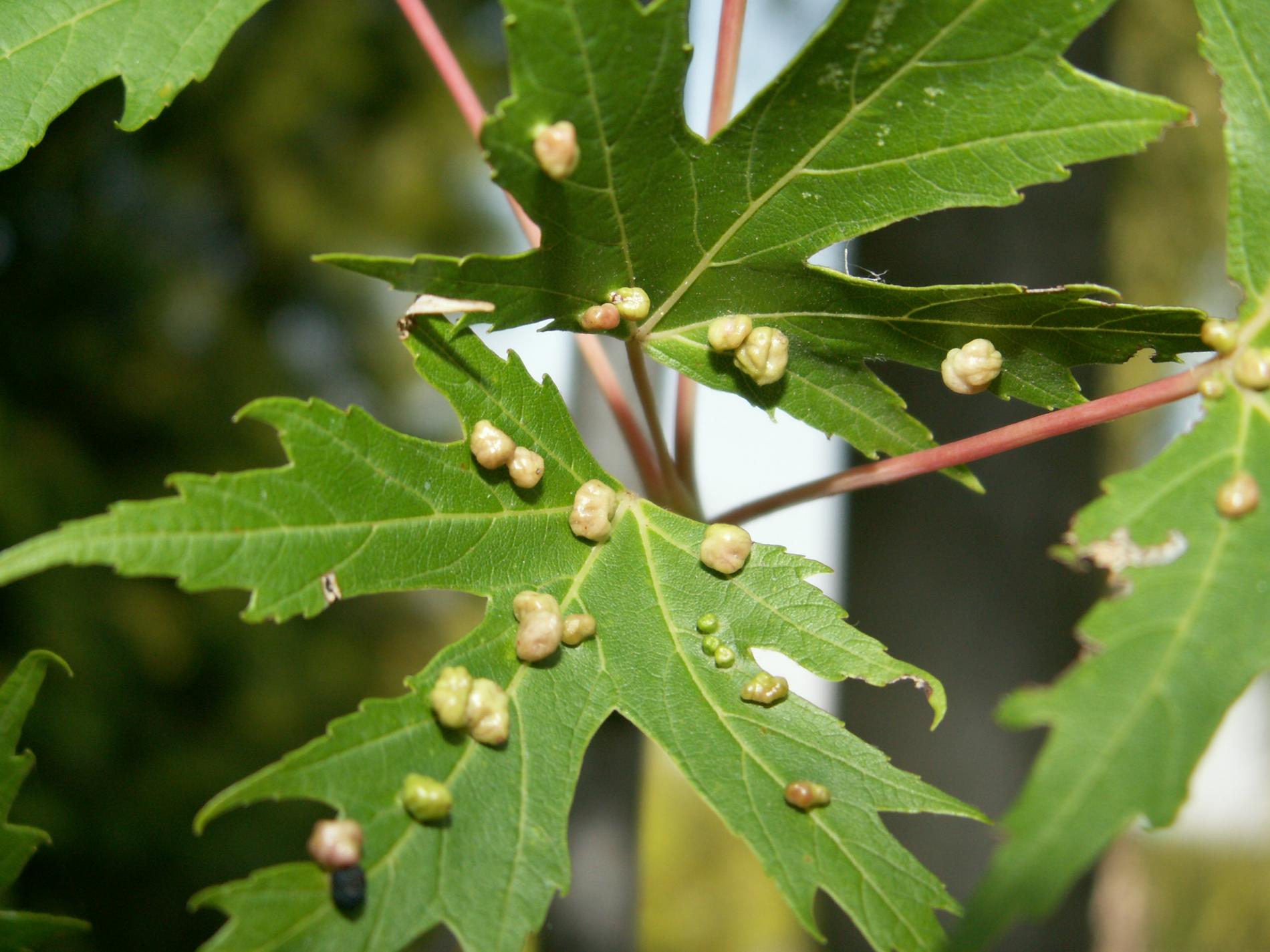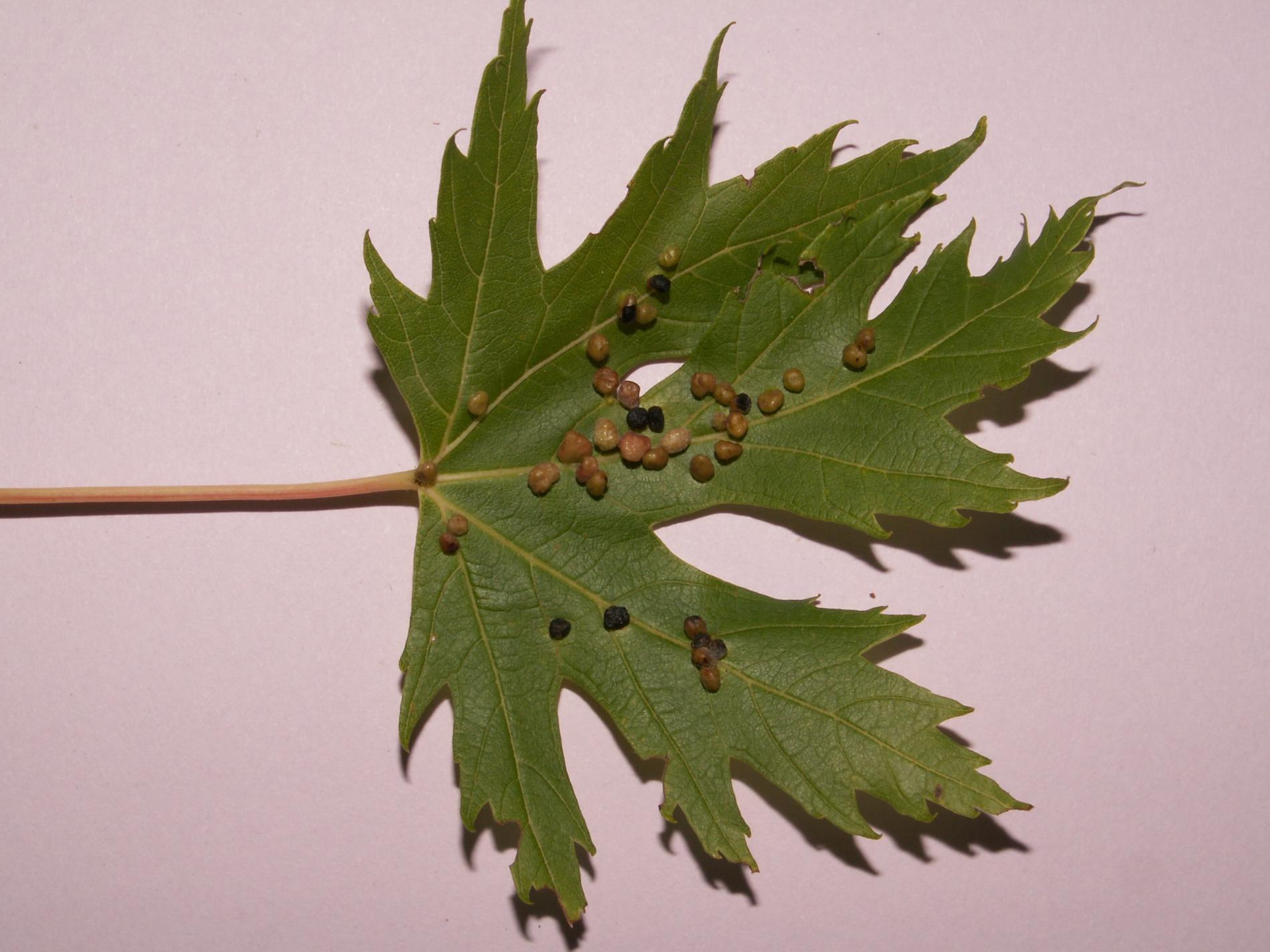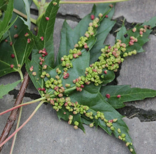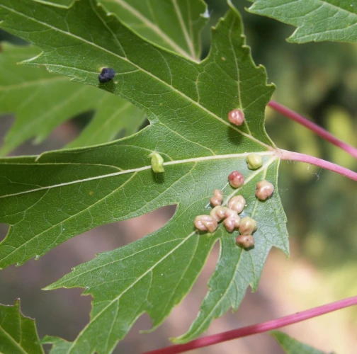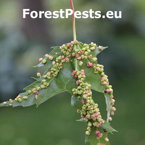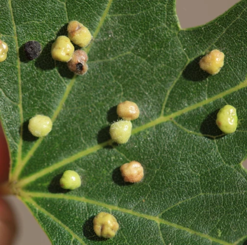 Pomerne veľké hrčky na vrchnej strane listov, ktoré môžu byť početné. Zo začiatku sú žlté alebo žltozelené, neskôr sa stávajú červenými, tmavočervenými a na jeseň až čiernymi.