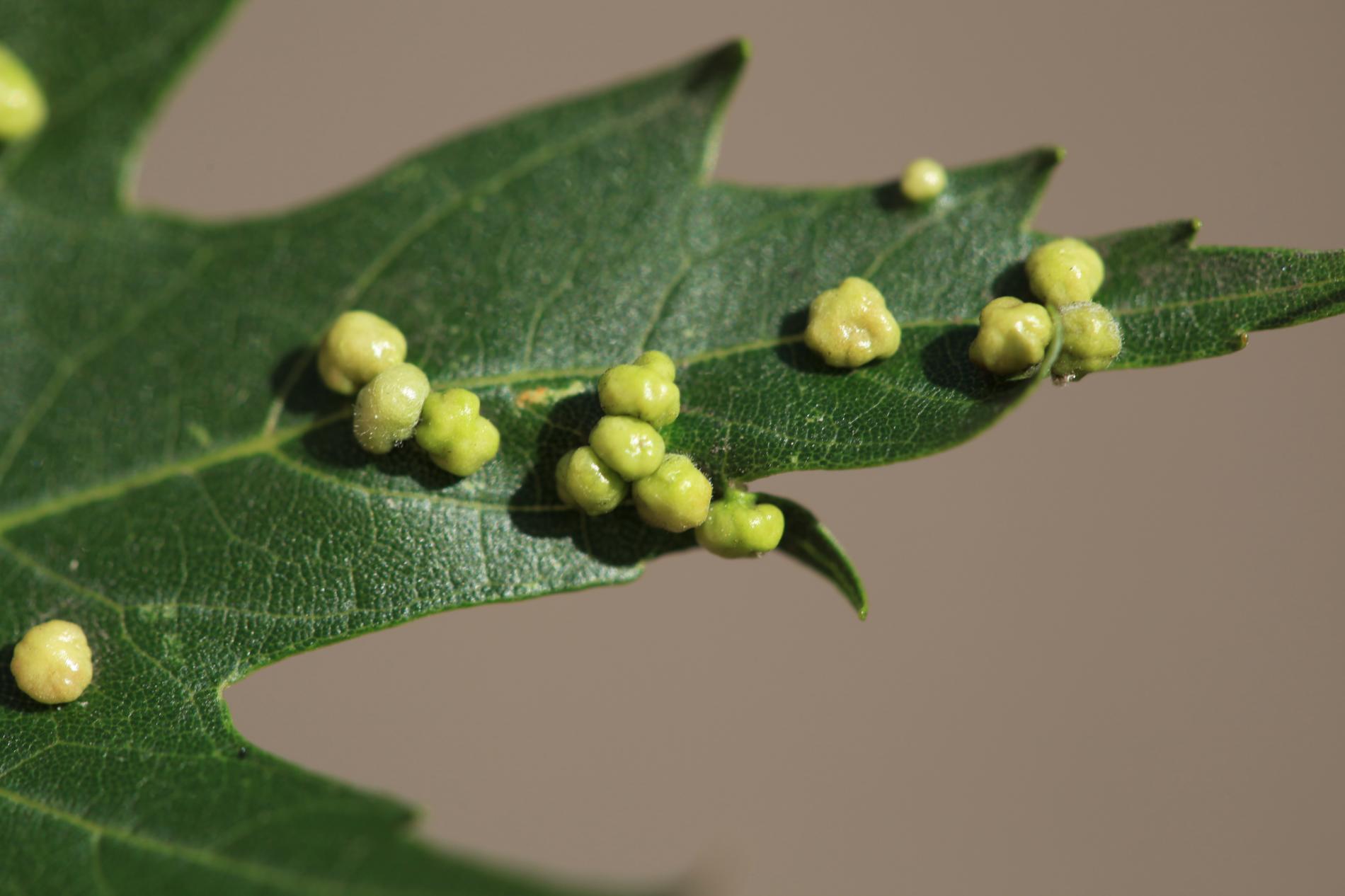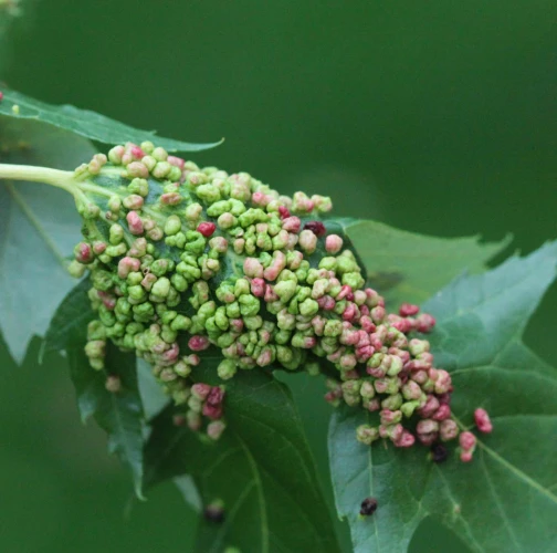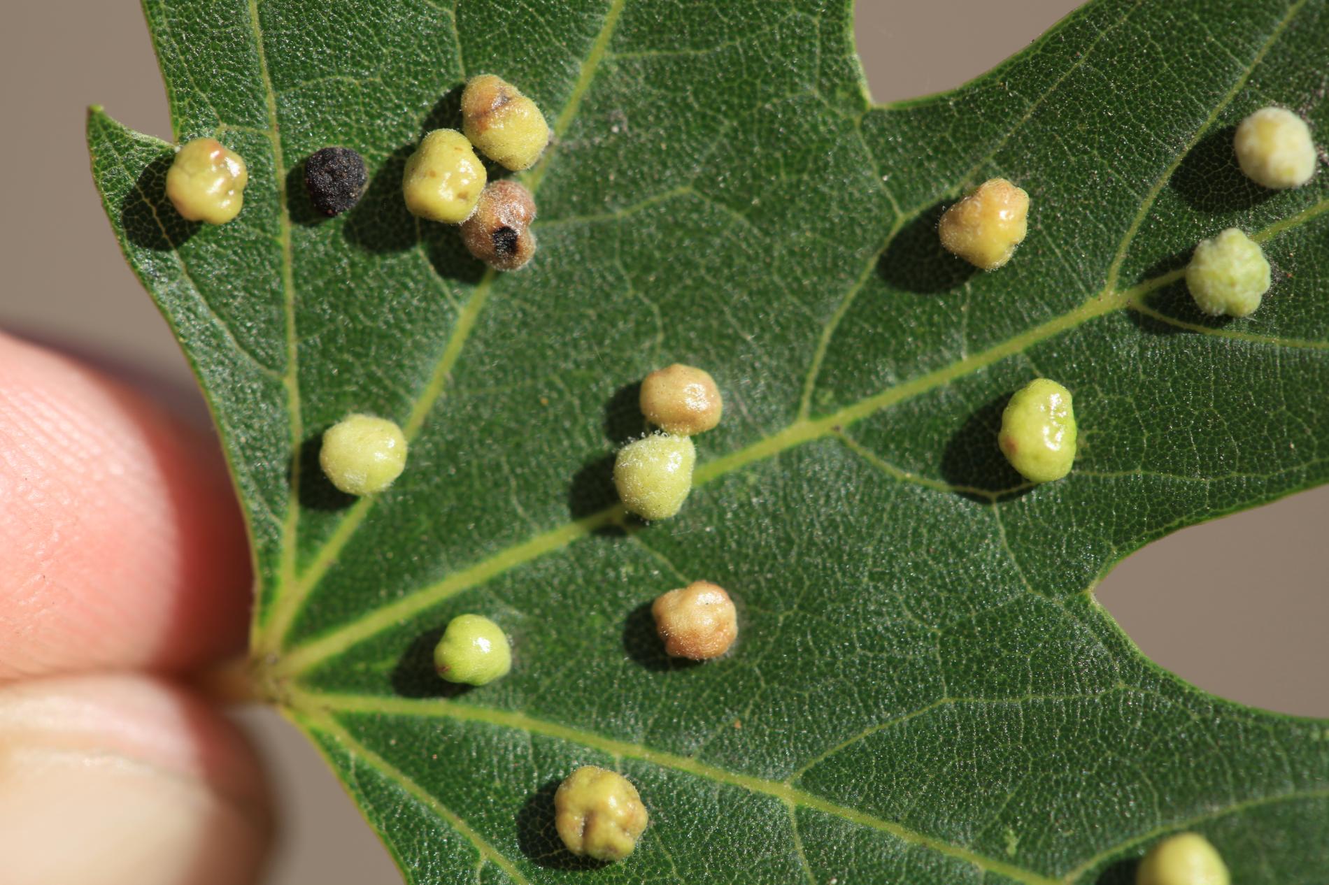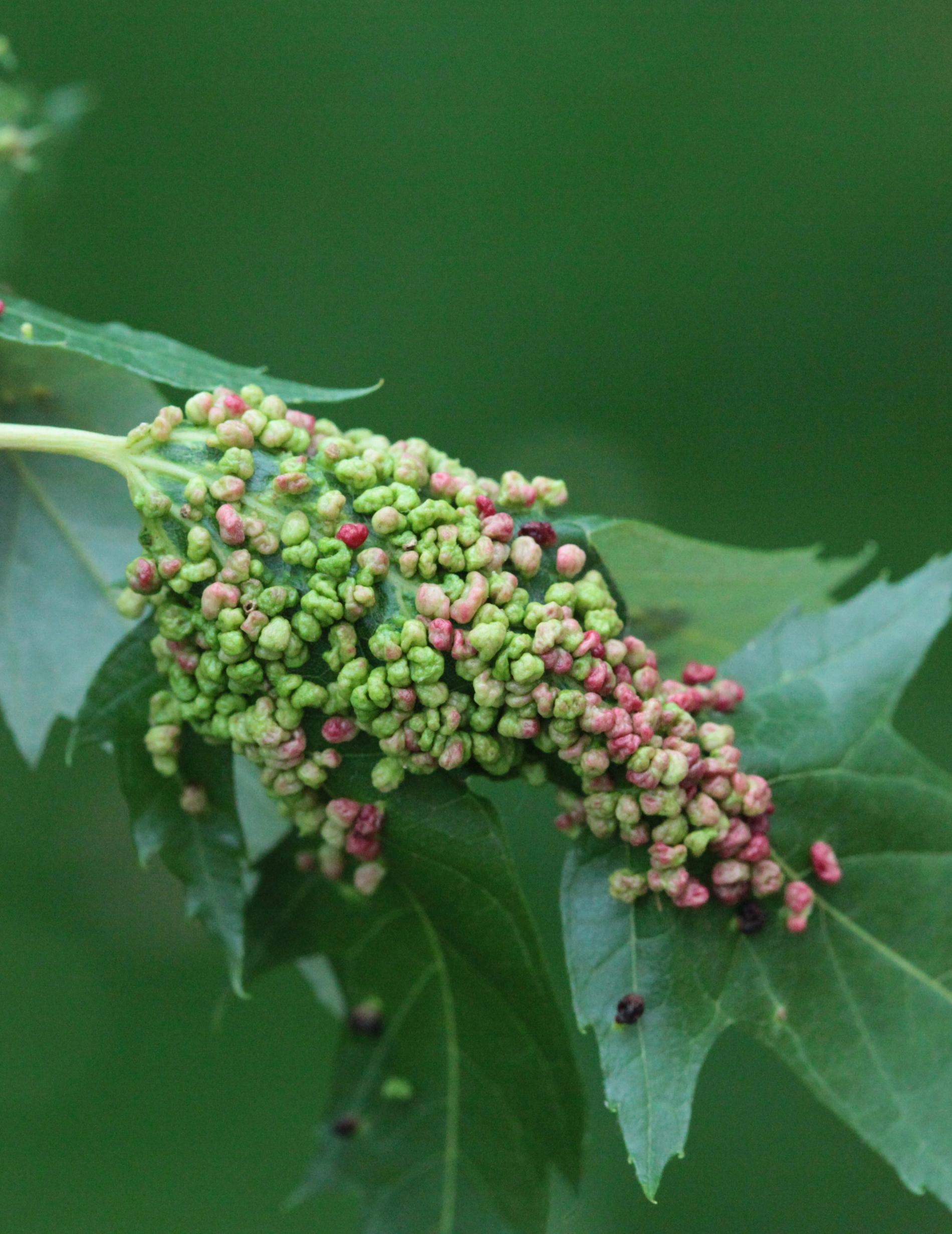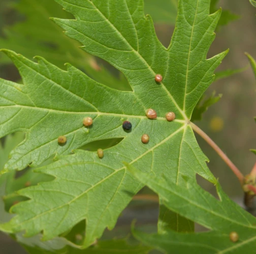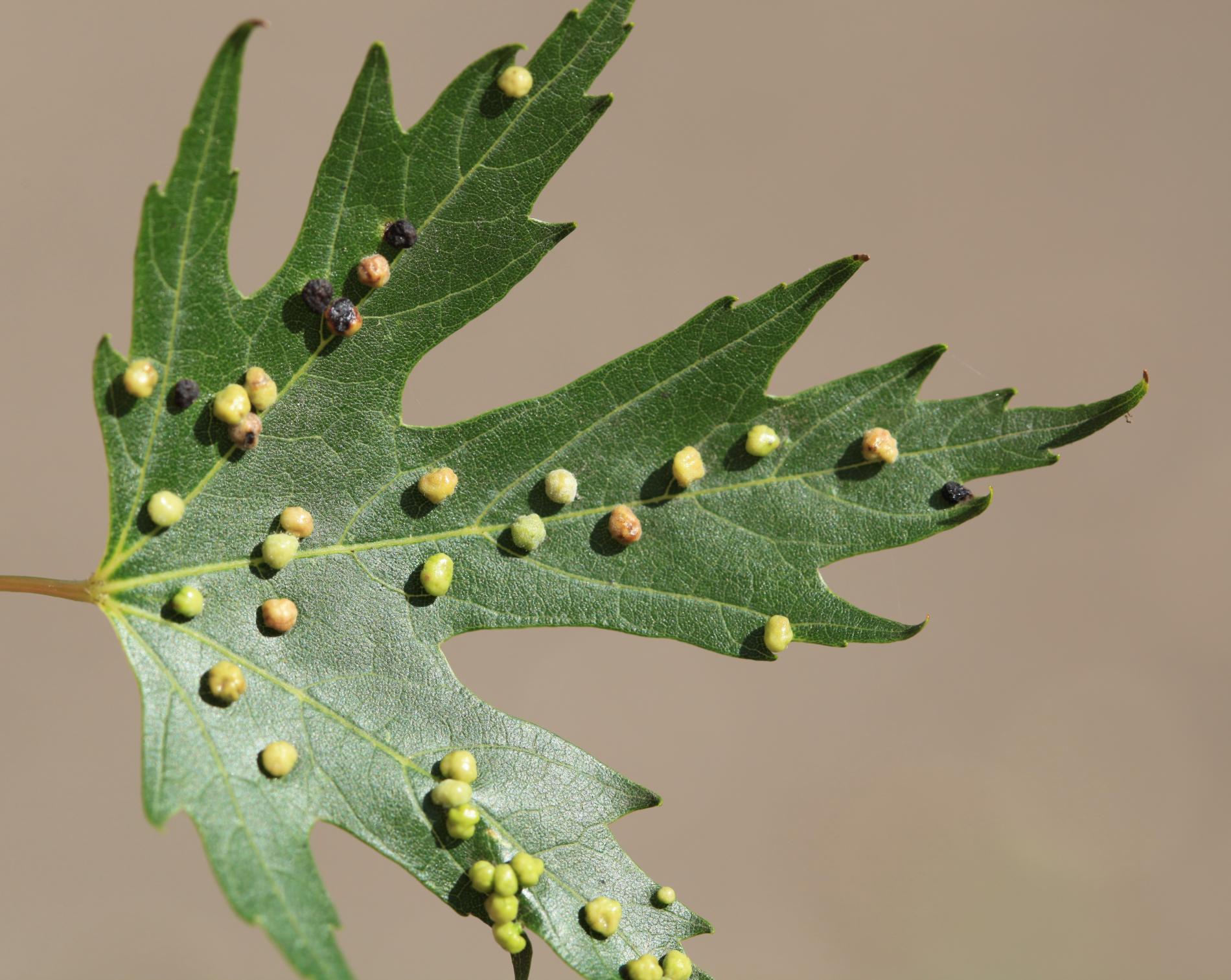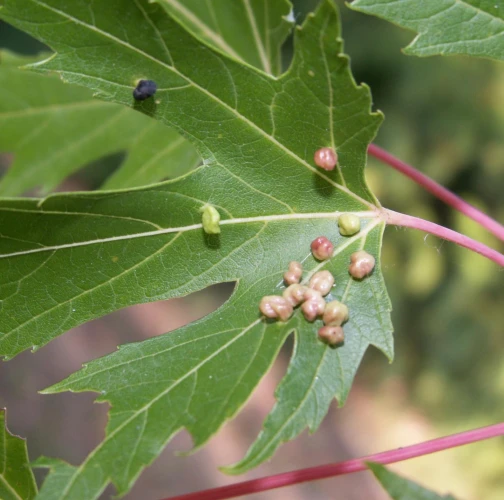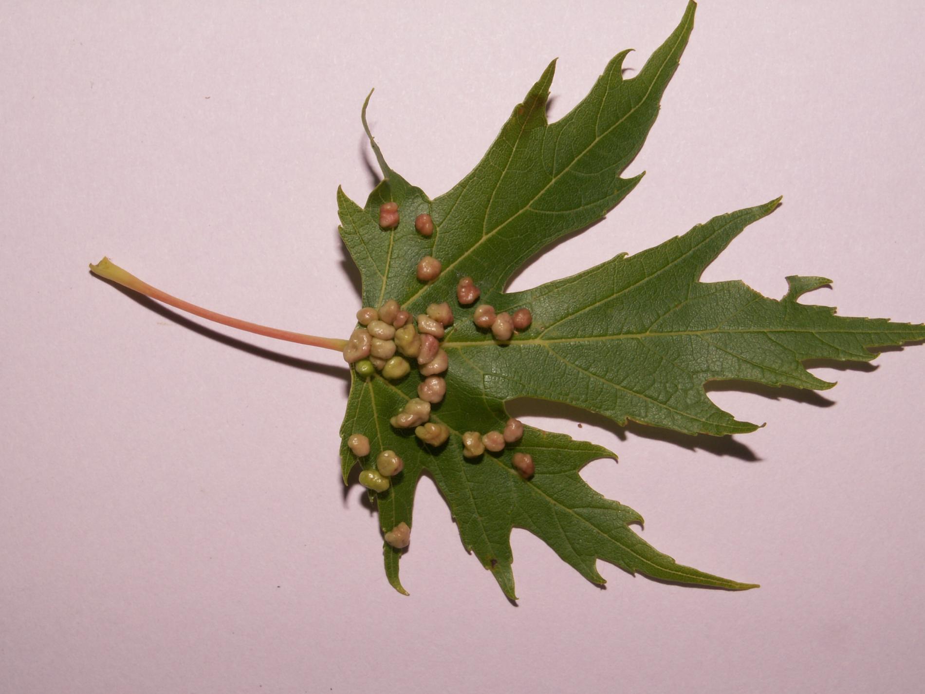 Pomerne veľké hrčky na vrchnej strane listov, ktoré môžu byť početné. Zo začiatku sú žlté alebo žltozelené, neskôr sa stávajú červenými, tmavočervenými a na jeseň až čiernymi.