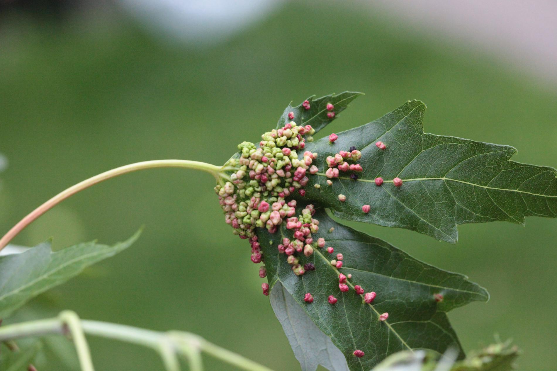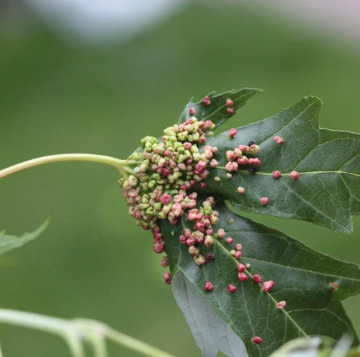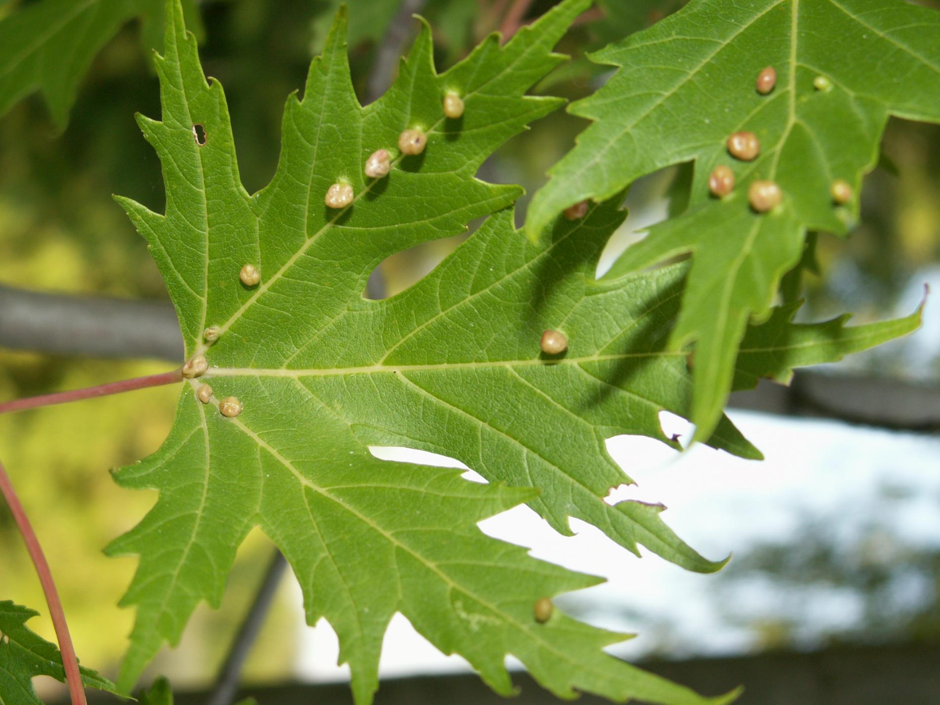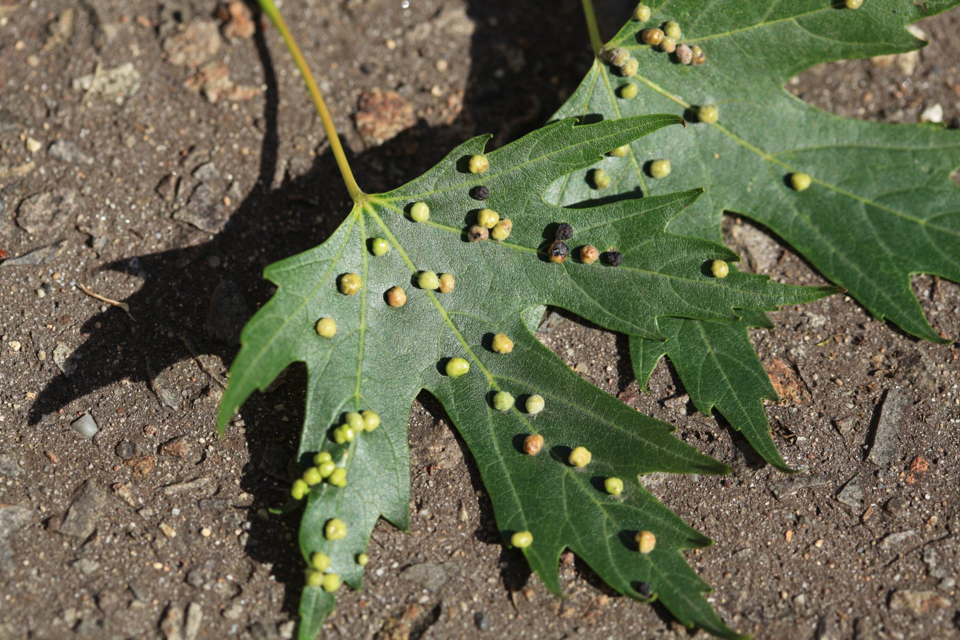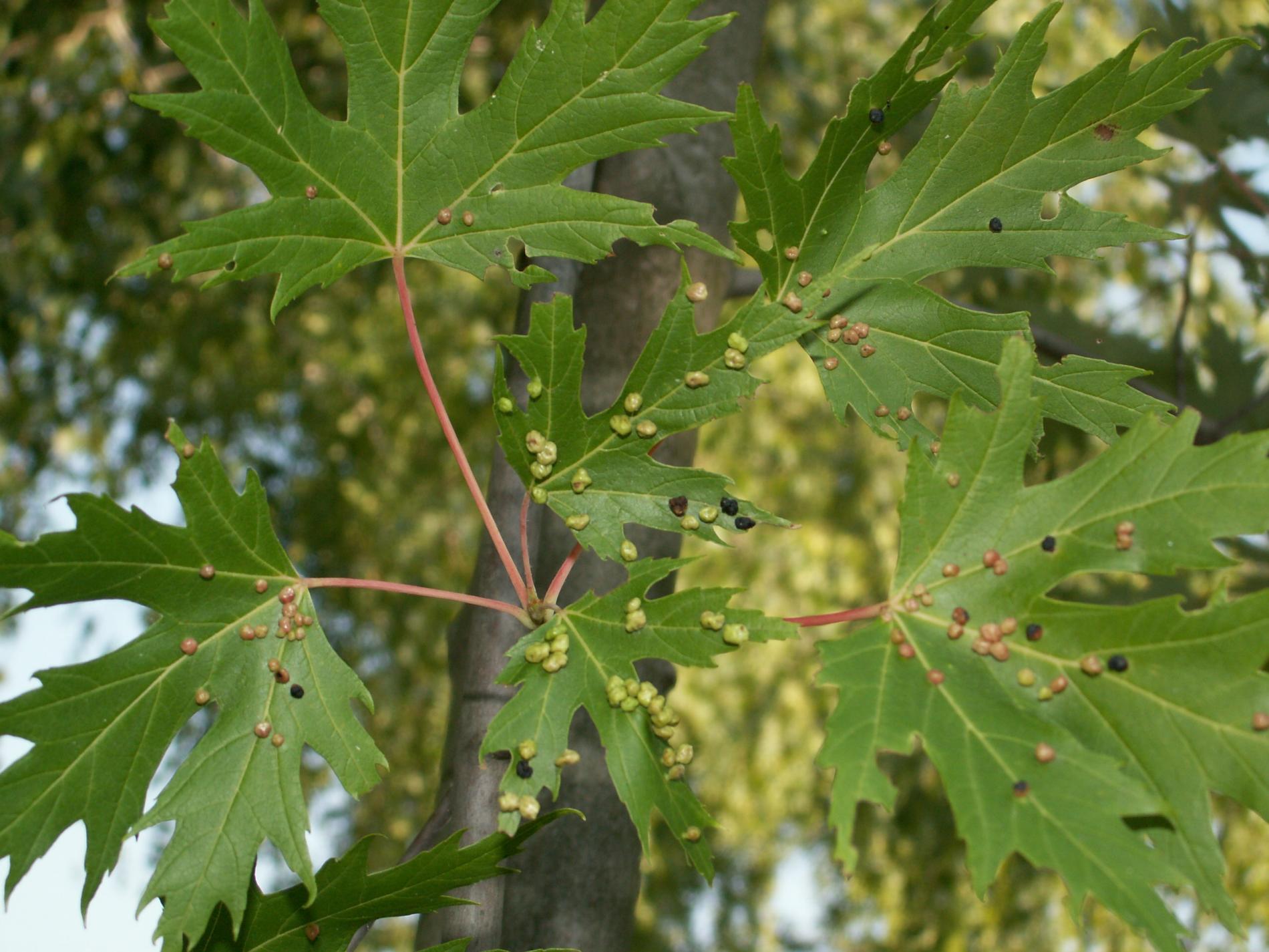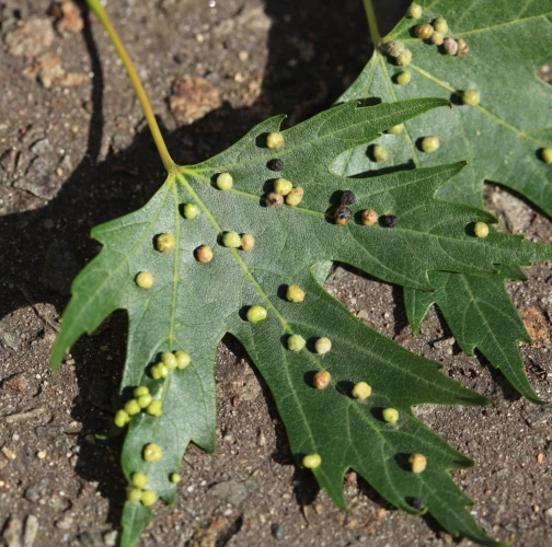 Pomerne veľké hrčky na vrchnej strane listov, ktoré môžu byť početné. Zo začiatku sú žlté alebo žltozelené, neskôr sa stávajú červenými, tmavočervenými a na jeseň až čiernymi.