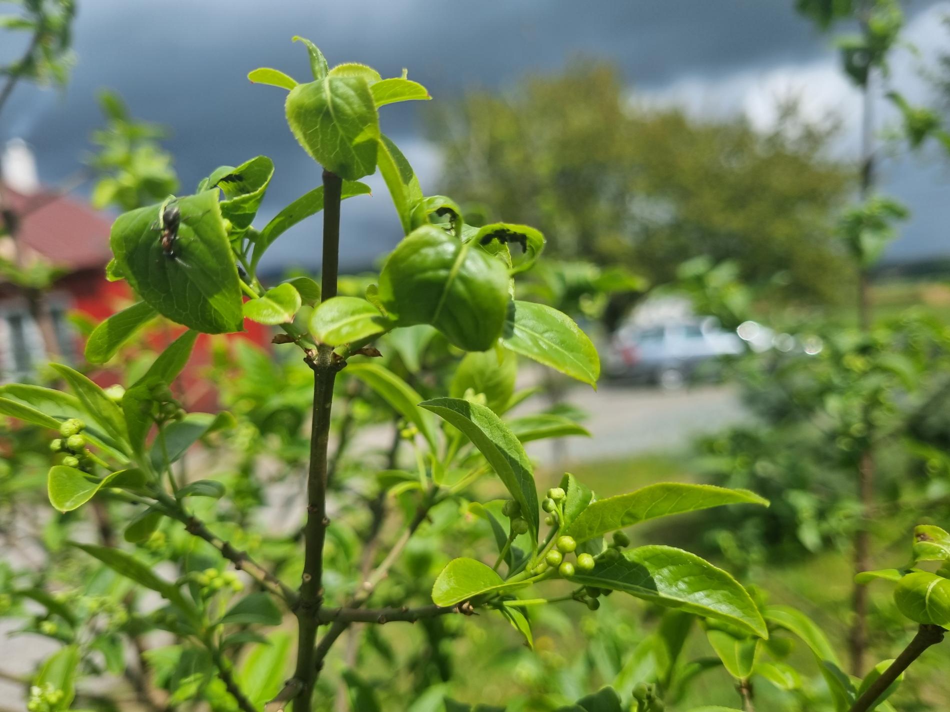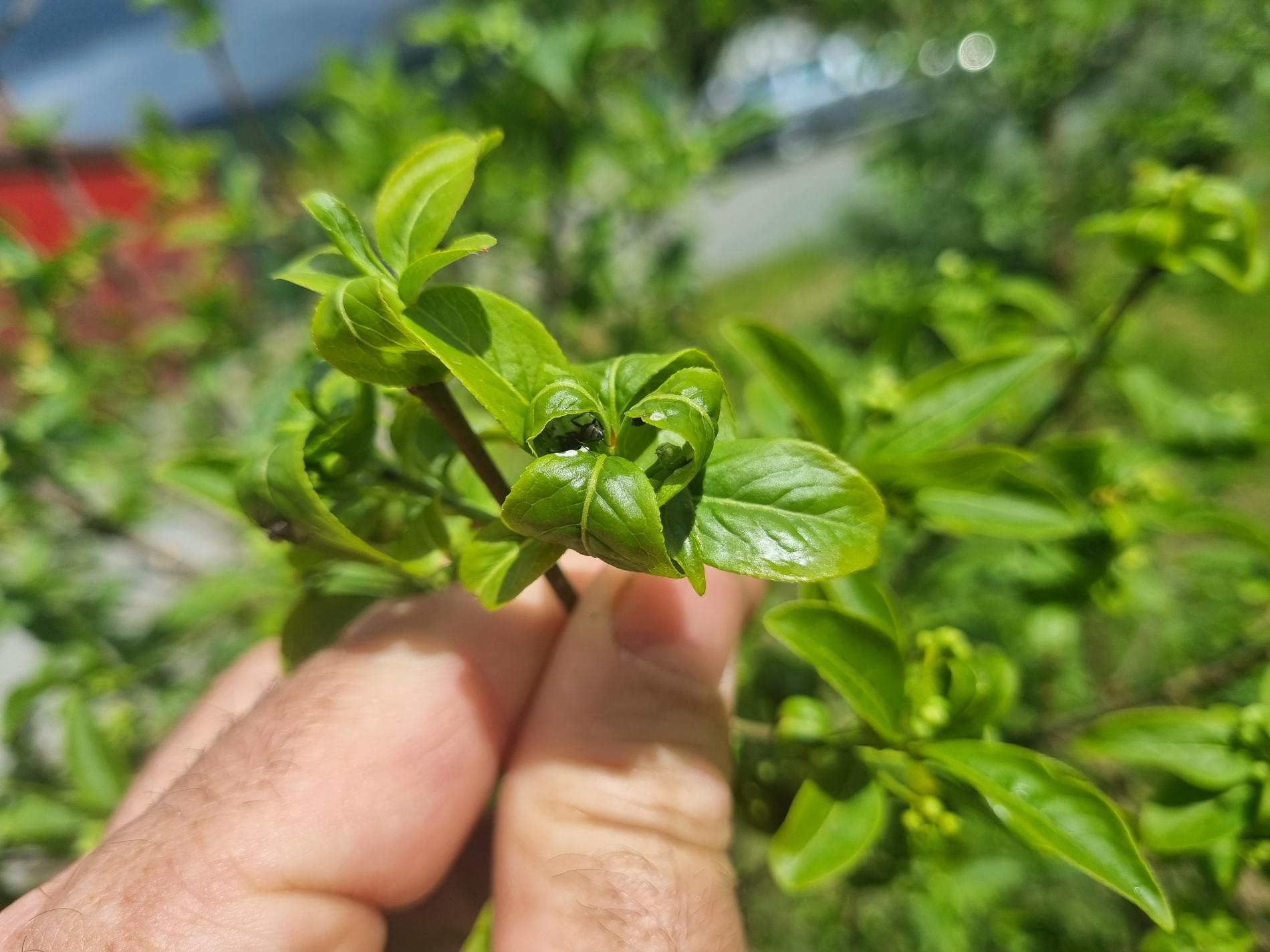 Na napadnutých listoch sa vytvárajú zvinuté, deformované oblasti so svetlými škvrnami. Povrch listov môže byť lepkavý od medovice, pričom sa na ňom často vyskytuje sekundárny rast plesní. Vošky sa zhromažďujú na mladých výhonkoch a spodnej strane listov.