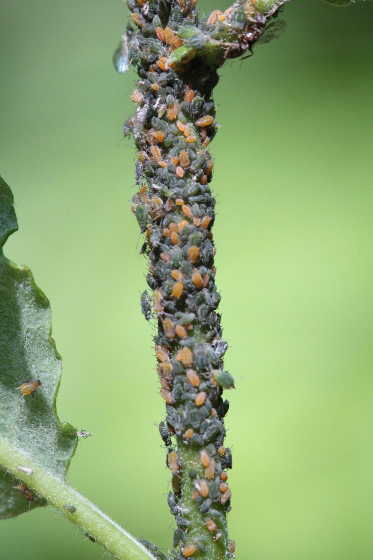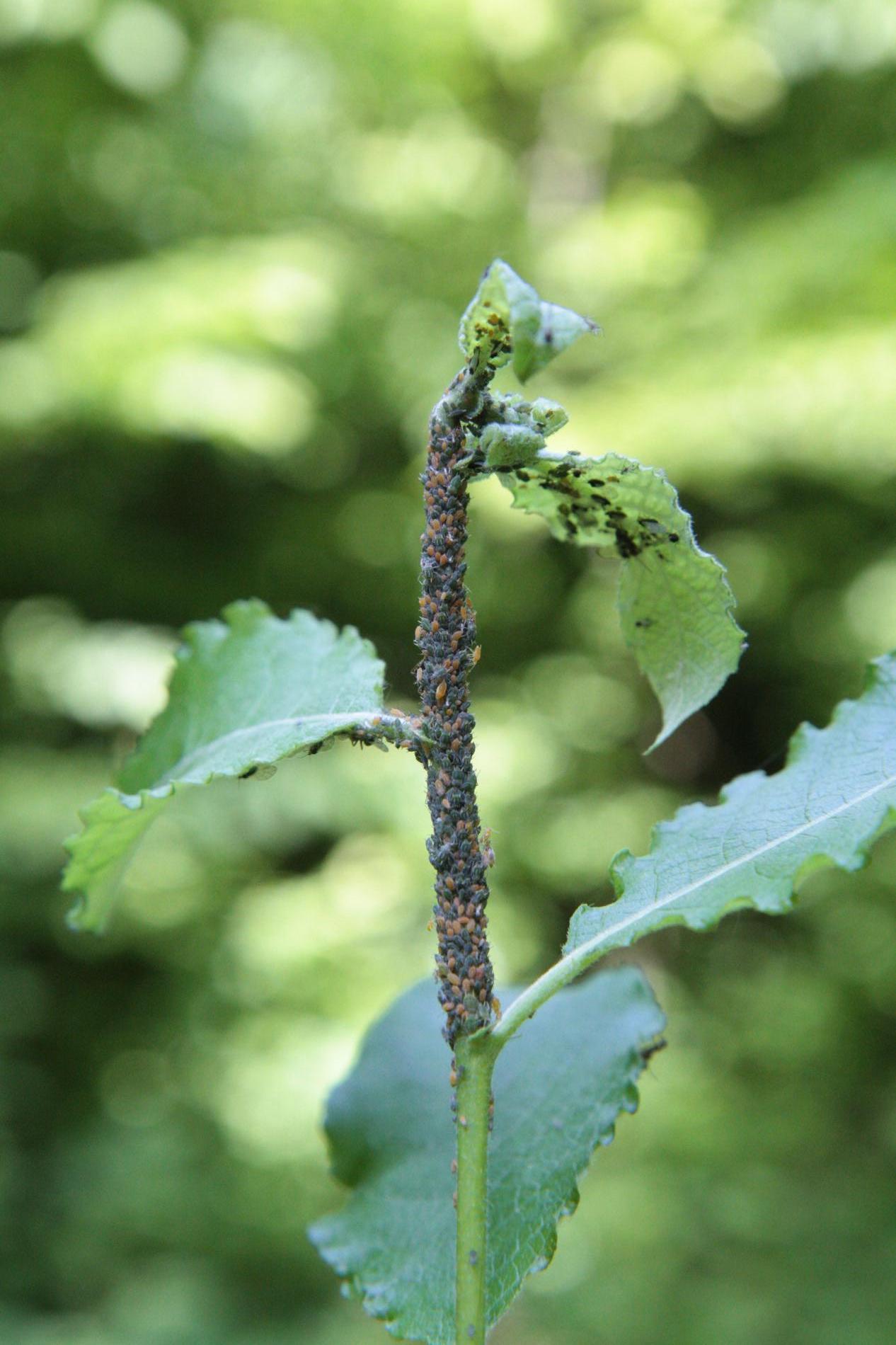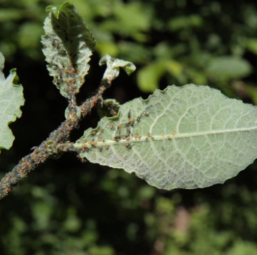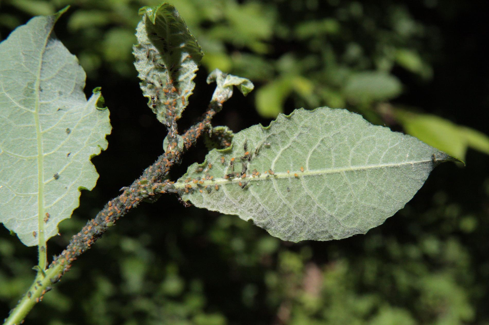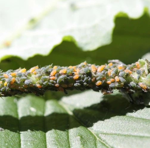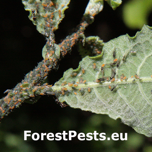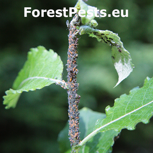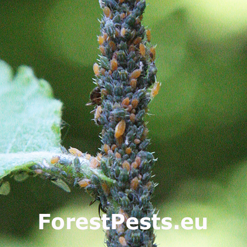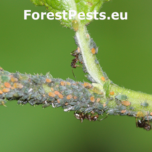 Dvojfarebná kolónia vošiek na spodnej strane listov alebo na výhonkoch. Hojne navštevovaná mravcami.
