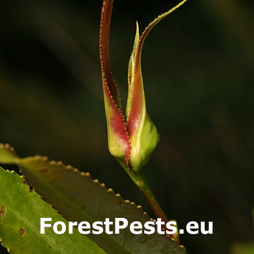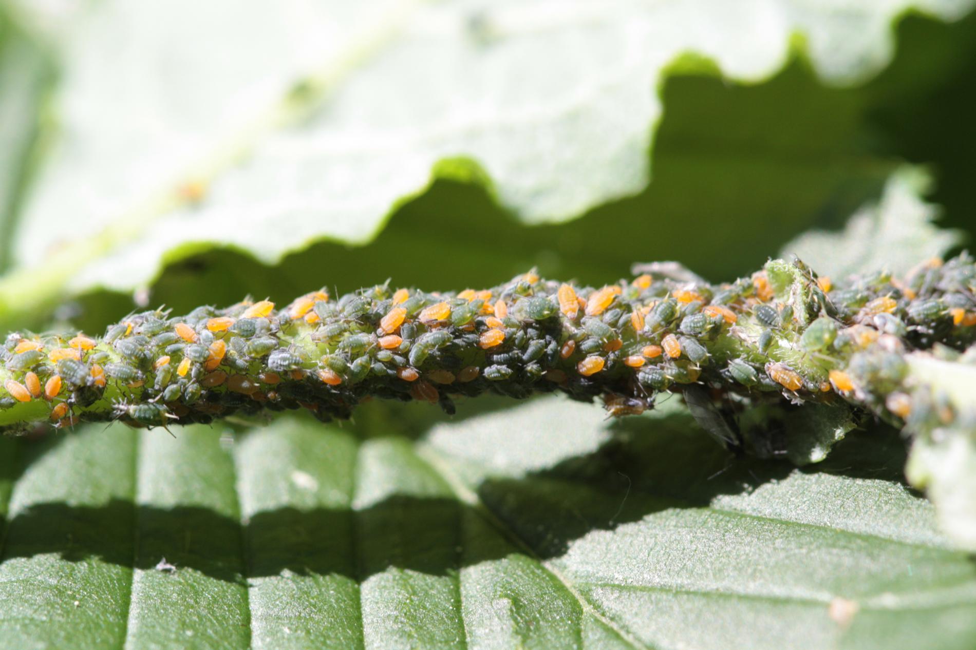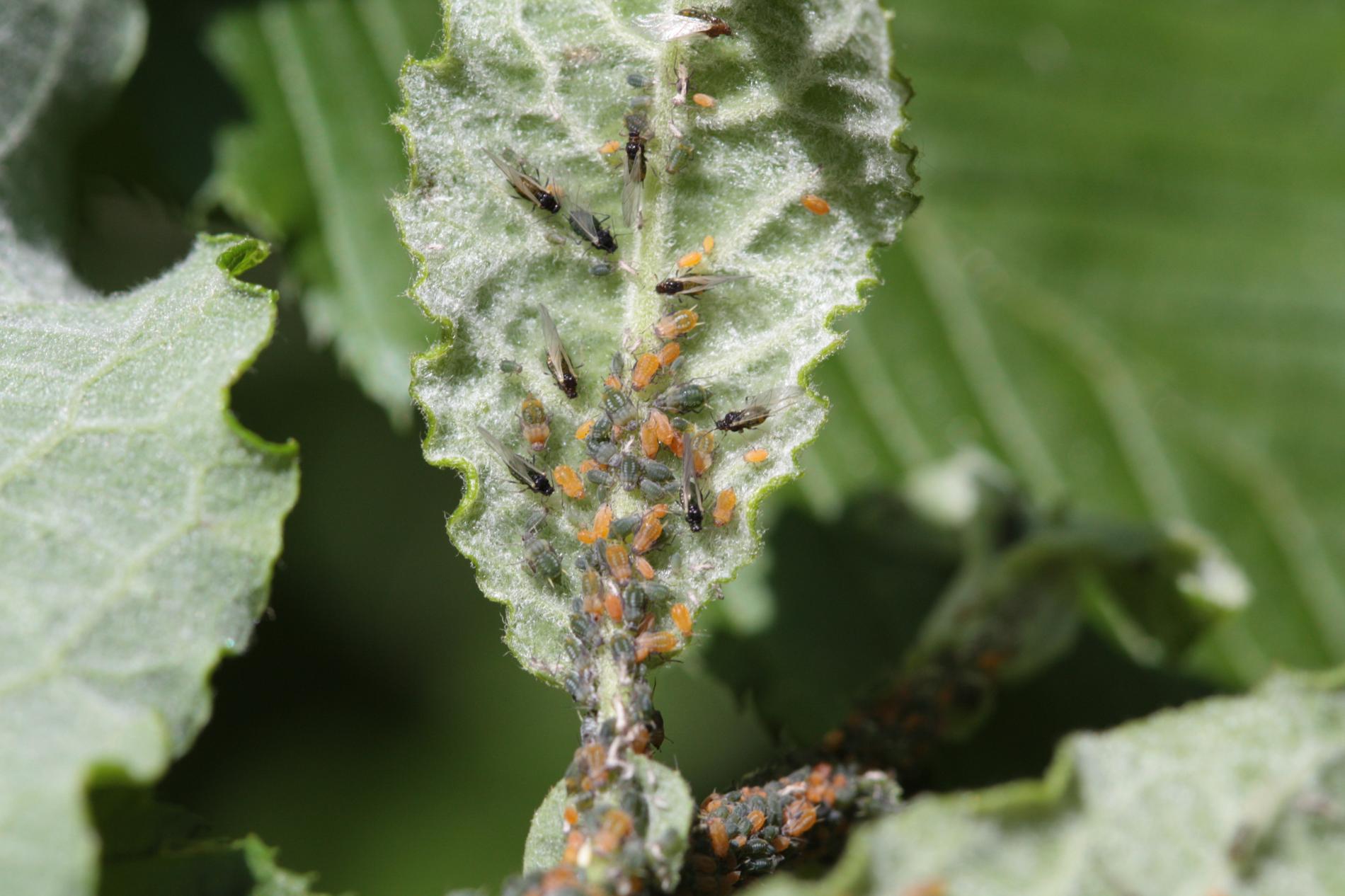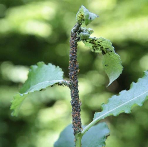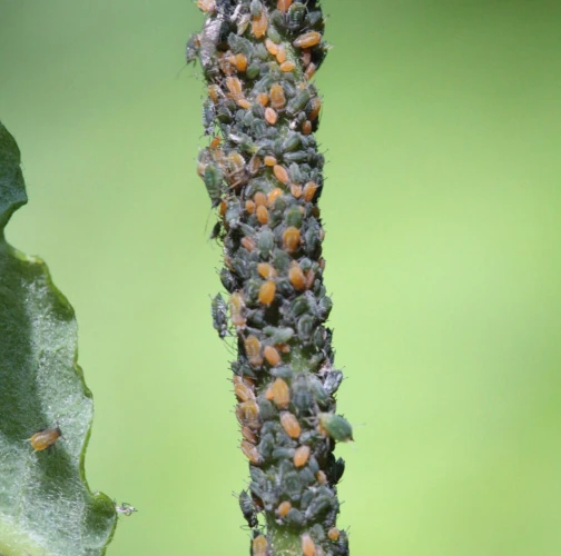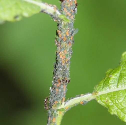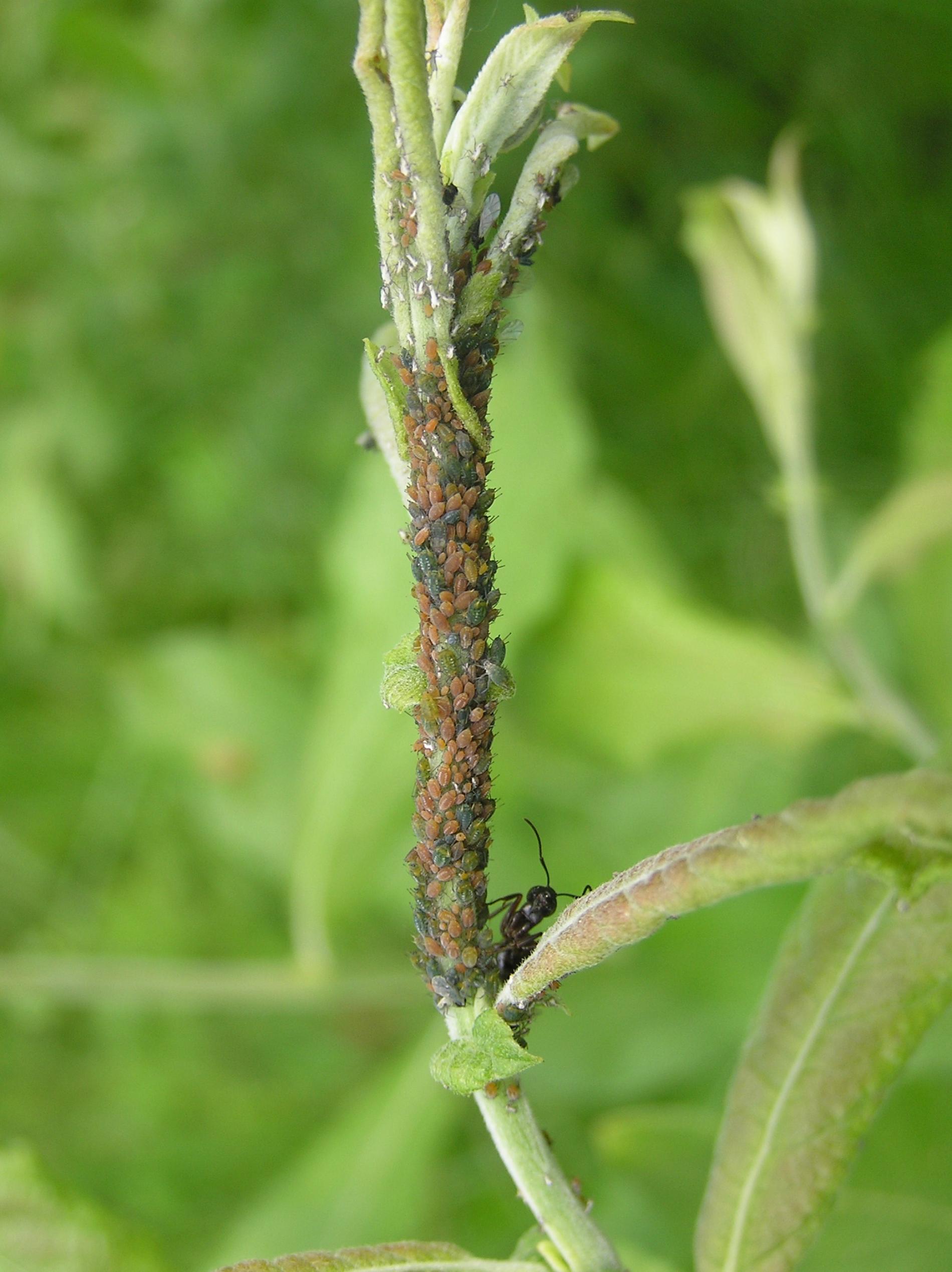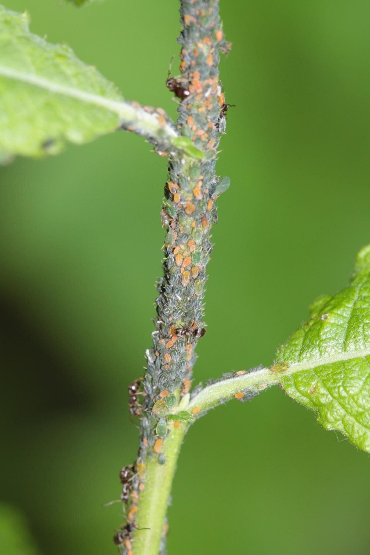 Dvojfarebná kolónia vošiek na spodnej strane listov alebo na výhonkoch. Hojne navštevovaná mravcami.
