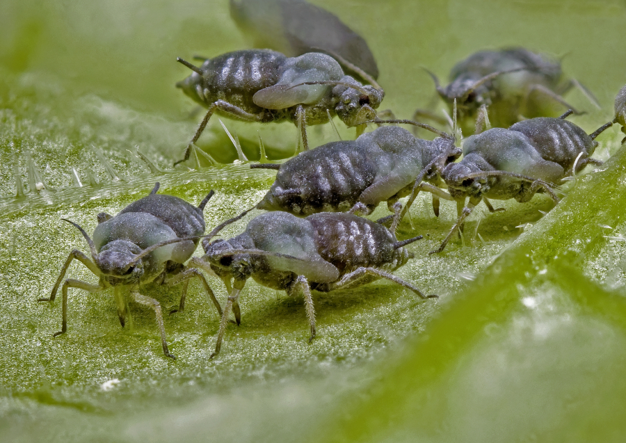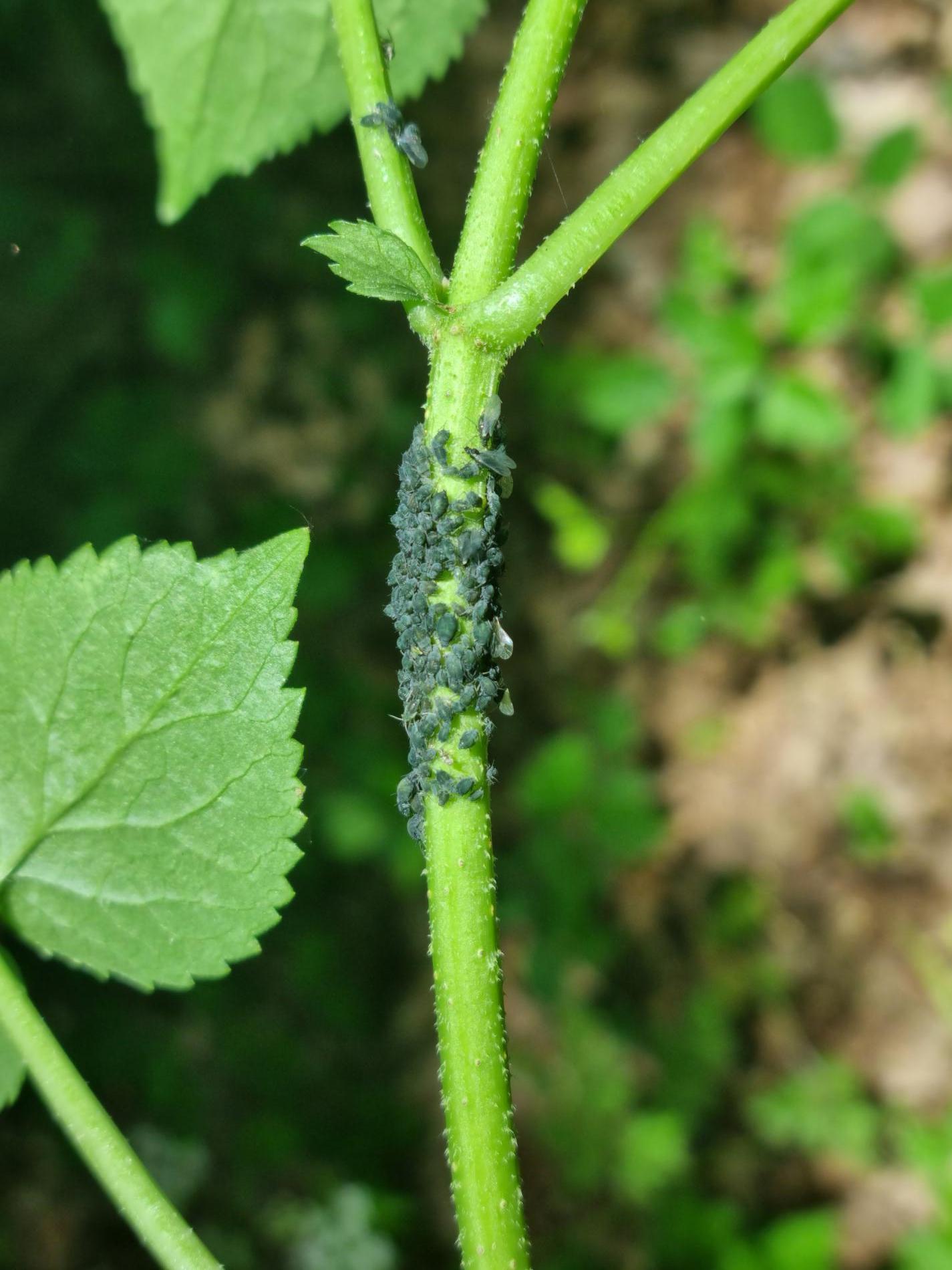 Husté a veľké kolónie tmavo zelených až čiernych vošiek hojne navštevované mravcami.